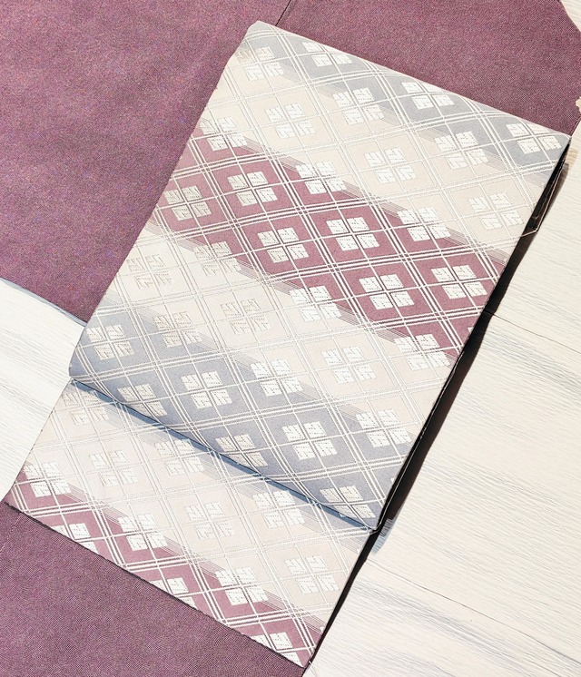 ・商品説明 美しいグラデーションと織の名古屋帯です。 ふっくらとした立体的な織りは、まるで刺繍のような美しさです。 品のある唐織にグラデーションが上品で、上質なお着物やおめかし着物に、とても合わせやすい万能な帯です◎ 地は白色と上品なくすみ感のある水色と落ち着いた赤紫色。 グラデーションのような暈しは染めではなく織です。 緯糸の本数を変えることで生まれる美しさ。 シックな大人の雰囲気。 美しいキモノなどの、上質でおしとやかな色柄がお好きな方にも、ご満足頂ける帯です。 ぷっくりとした唐織での重なり合うような菱形も古典柄ながらモダンな印象。 水色と赤紫色の組み合わせですので、合わせるお着物や小物のお色も悩まずに、様々な色柄と相性抜群◎ どこまでも上品で美しい色柄と織です。 証紙などはありませんが、おそらく西陣織の古典柄を得意とする帯屋さんの物だと思います。 とても上質。 しかも上質な織の帯では珍しい全通柄◎ 全体に柄がありますので、お好きな位置で締めて頂けます。 可愛く見せたい日は淡いお色、シックに見せたい日は、濃いお色の小物もおすすめです◎ 袷の間中ベストシーズンとして締めて頂けます◎ (お色が薄い印象ですので、単衣にも○) 付け下げ小紋、色無地、江戸小紋、おめかし小紋……と様々な格のお着物に締めて頂け、お着物をよりよく見せてくれる帯です◎ 唐織の中では、重さも軽め薄手の近年タイプ。 長時間締めていても気にならない軽さです。 ¥30.000(税込み) ・状態 (シミや着用感) 目立つシミなどはなく、状態良好◎ 未使用に近い状態だと思います。 (検品時には見当たりませんでしたが、織の性質上、多少の糸の毛羽立ちや糸飛び出しなどがあるかもしれません。) ・サイズ 長さ 約372cm 幅 約30.5cm ・素材 表、裏共に絹 ・ご購入の際に必ずお読みくださいませ。 こちらは 単品での販売です。 (コーディネートの参考にお着物と帯を組み合わせている物もありますが、単品での販売となります。参考コーディネートでお召し頂く場合はそれぞれご購入くださいませ。) 当店の商品はリサイクルもしくはアンティークとなるため、基本的に一点物です。 その為店舗でも同時に販売しているので、ご購入手続き及びカード決済をして頂いても店舗で売れてしまっている場合がございます。 大変申し訳ございませんが、その際はご注文をキャンセルとさせて頂きますので、ご迷惑をおかけしますが、ご了承よろしくお願いいたします。 発送は日本国内のみとなります。 お客様のご都合によるご注文のキャンセル・返品・交換はお受け出来ません。 (ご覧頂くモニターによりイメージの違い・色合いが異なる場合もございますが、その場合も返品・交換はお受け出来ません。)