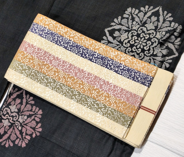 市松に宝尽くしの博多織りの半幅帯