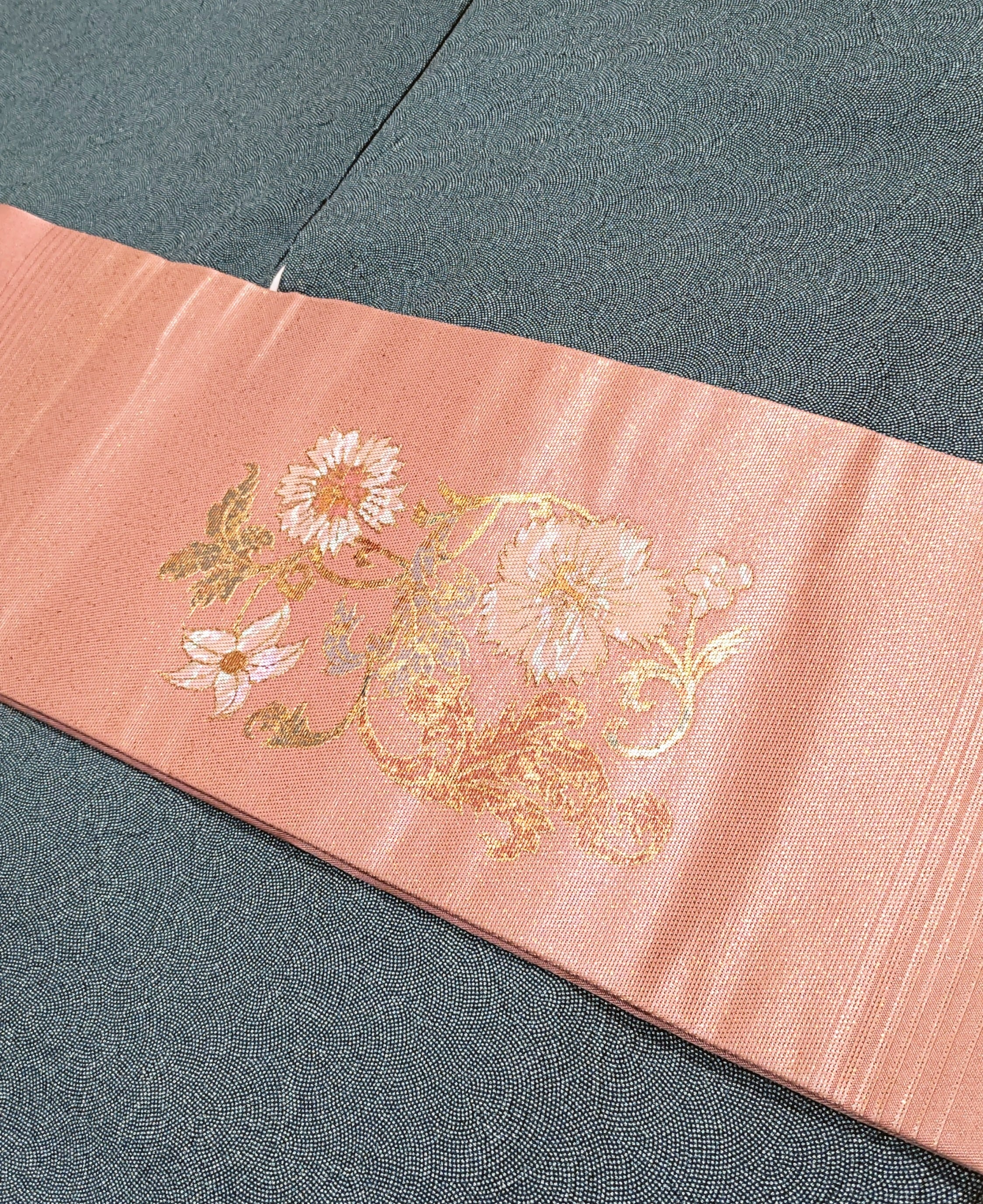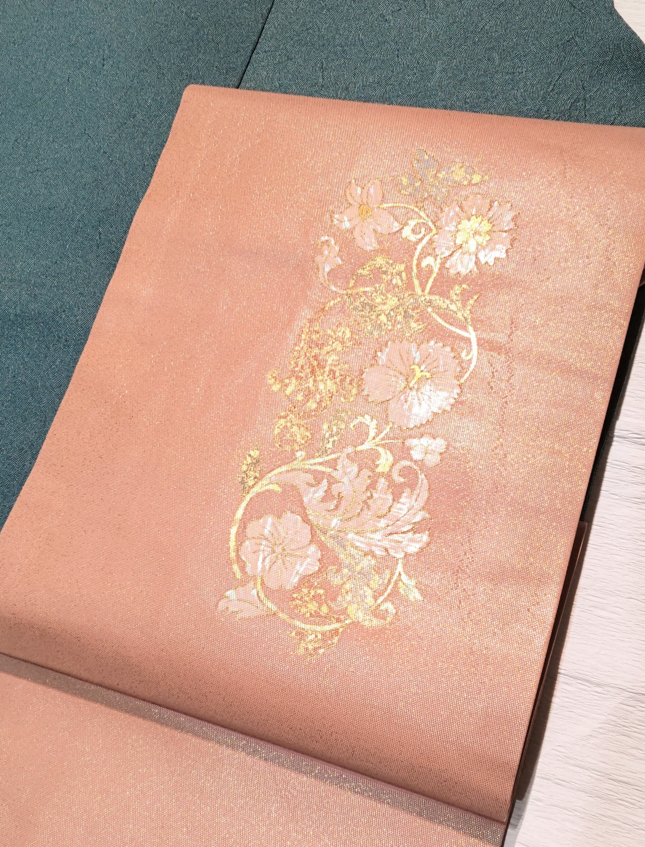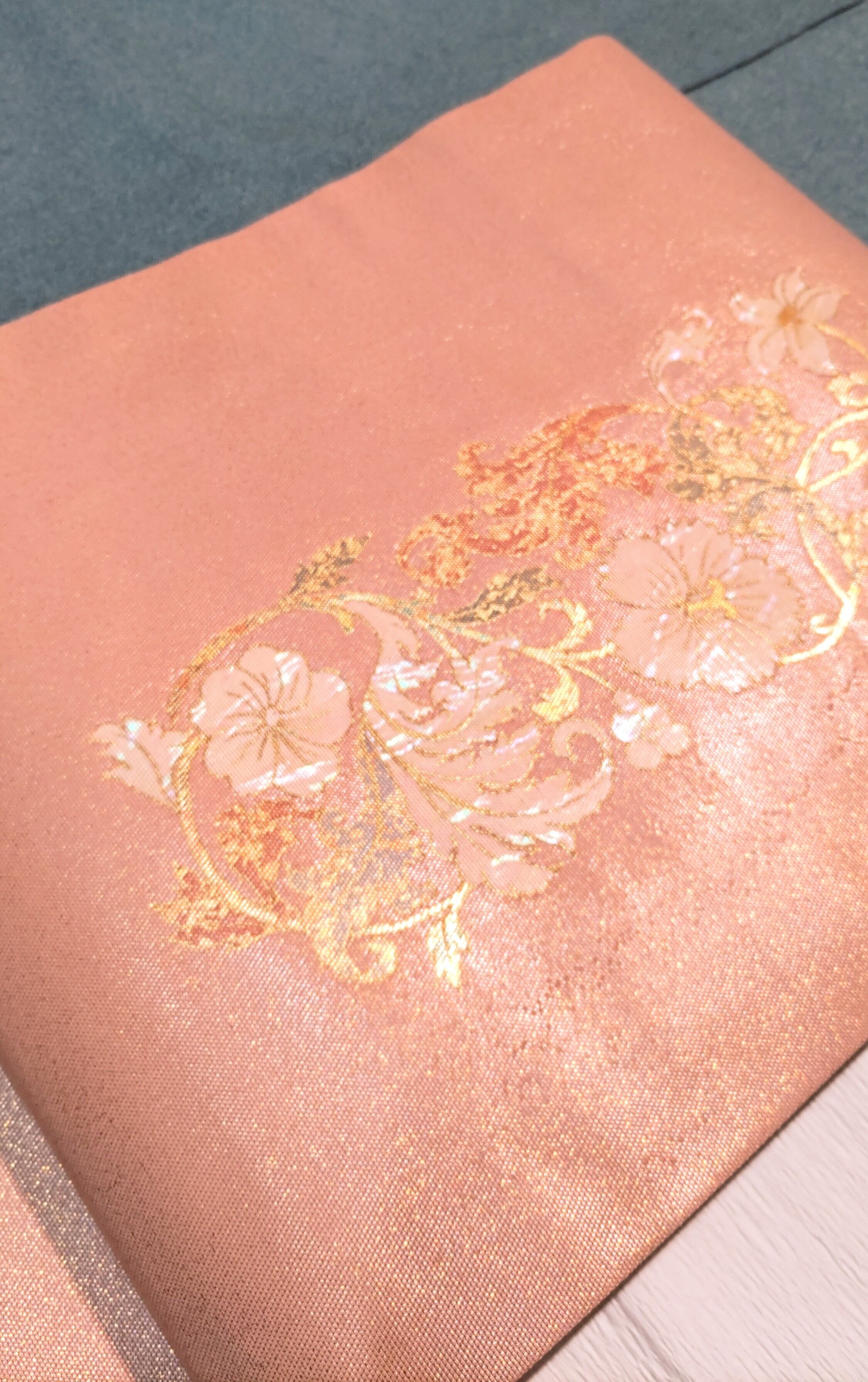 美しい螺鈿のピンクベージュ色の名古屋帯です。