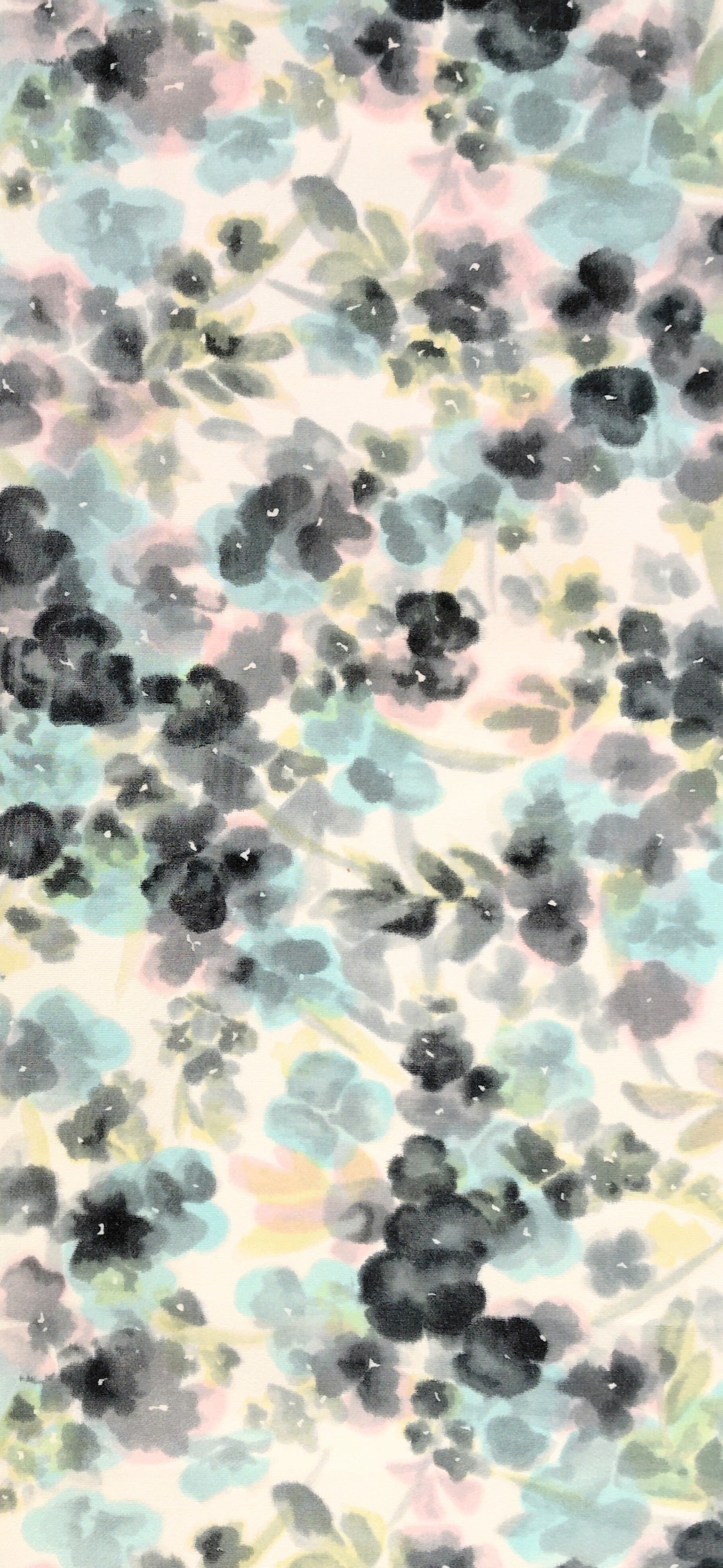 白地に水彩画のような淡い水色、淡いピンク色、淡い緑色、淡い黄色、墨色のお花のシルエットが優しく可愛い印象の小紋です。