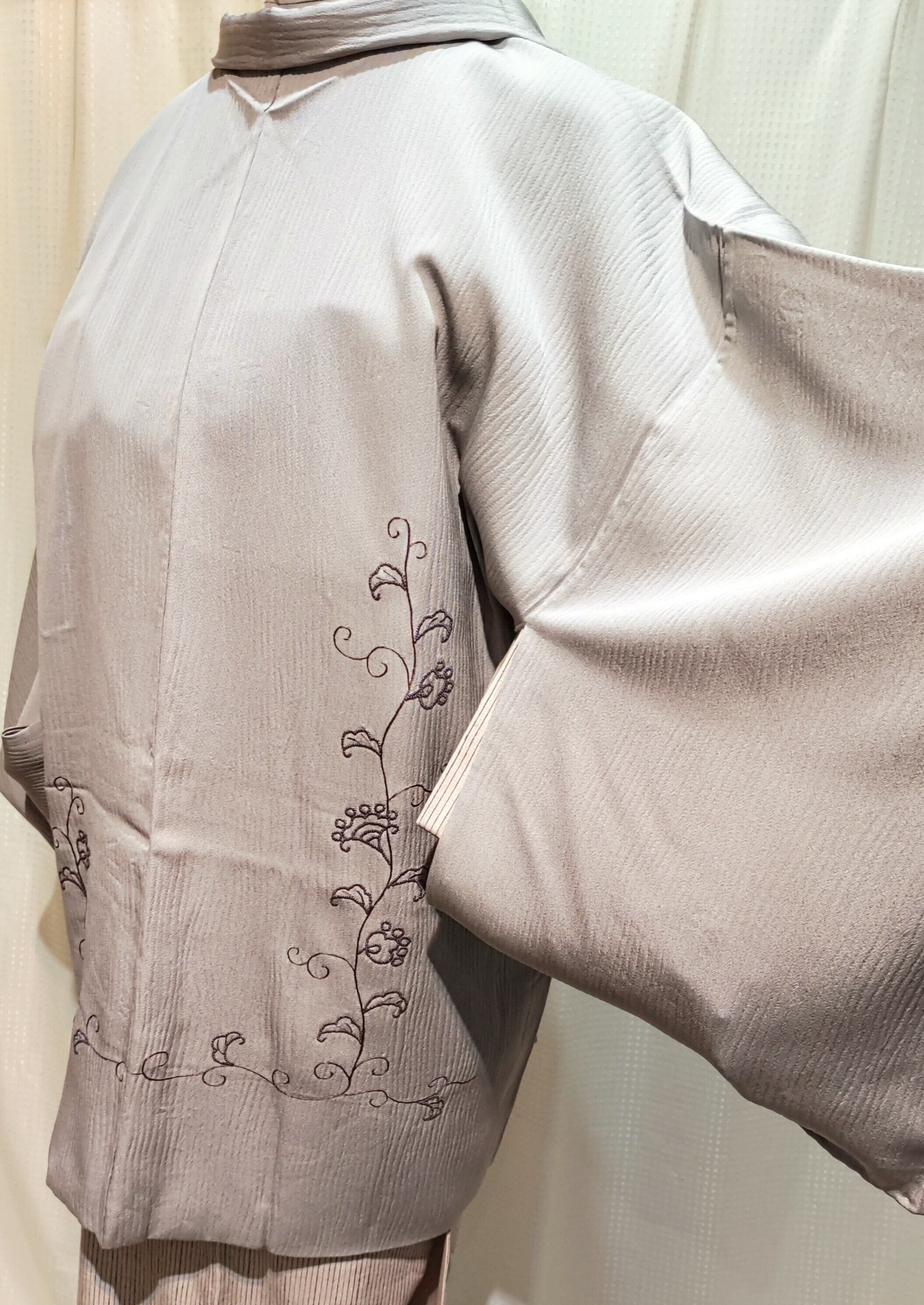 グレー地に相良刺繍の羽織り〜貝紫色〜です。