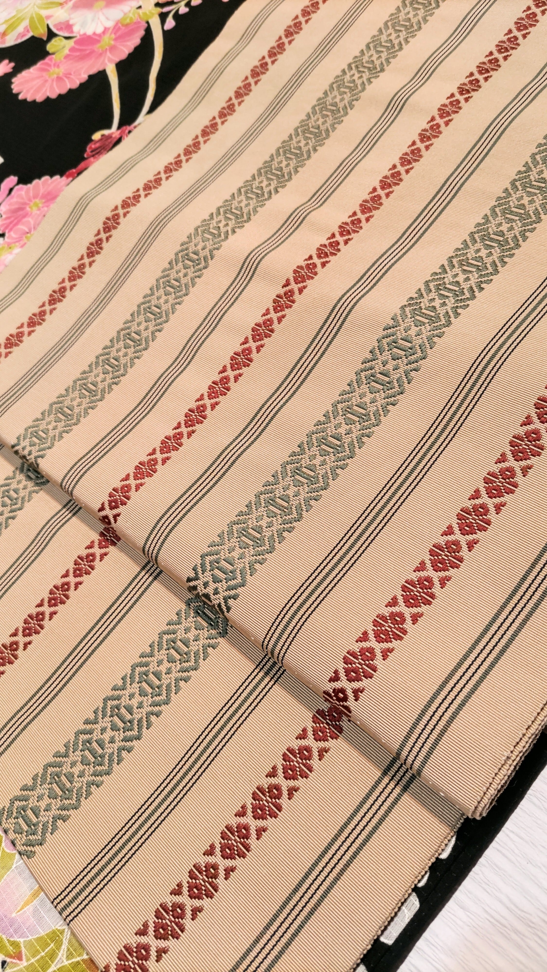 ミルクティーのような少しくすんだベージュ色の地に、淡い緑青色、薄い赤色の献上柄。
