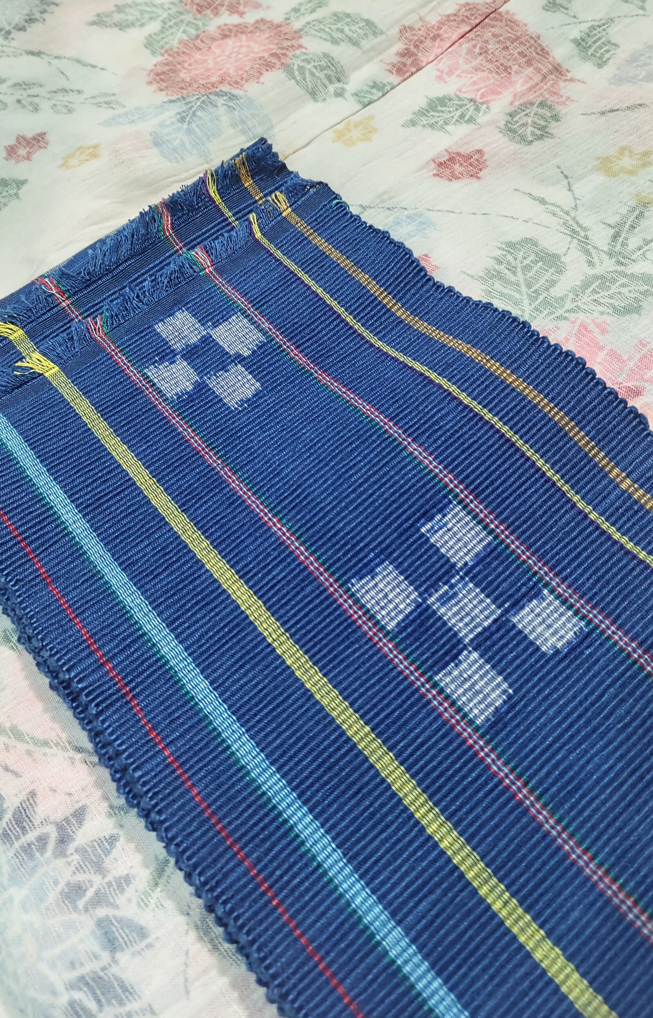 八重山みんさーの半幅帯 青色地にカラフルボーダー柄です。