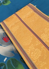 地紋で唐草花模様、その上下を飾るのは赤茶色、抹茶色、紫色、青色、赤色、白色の極めて細いボーダー柄。
