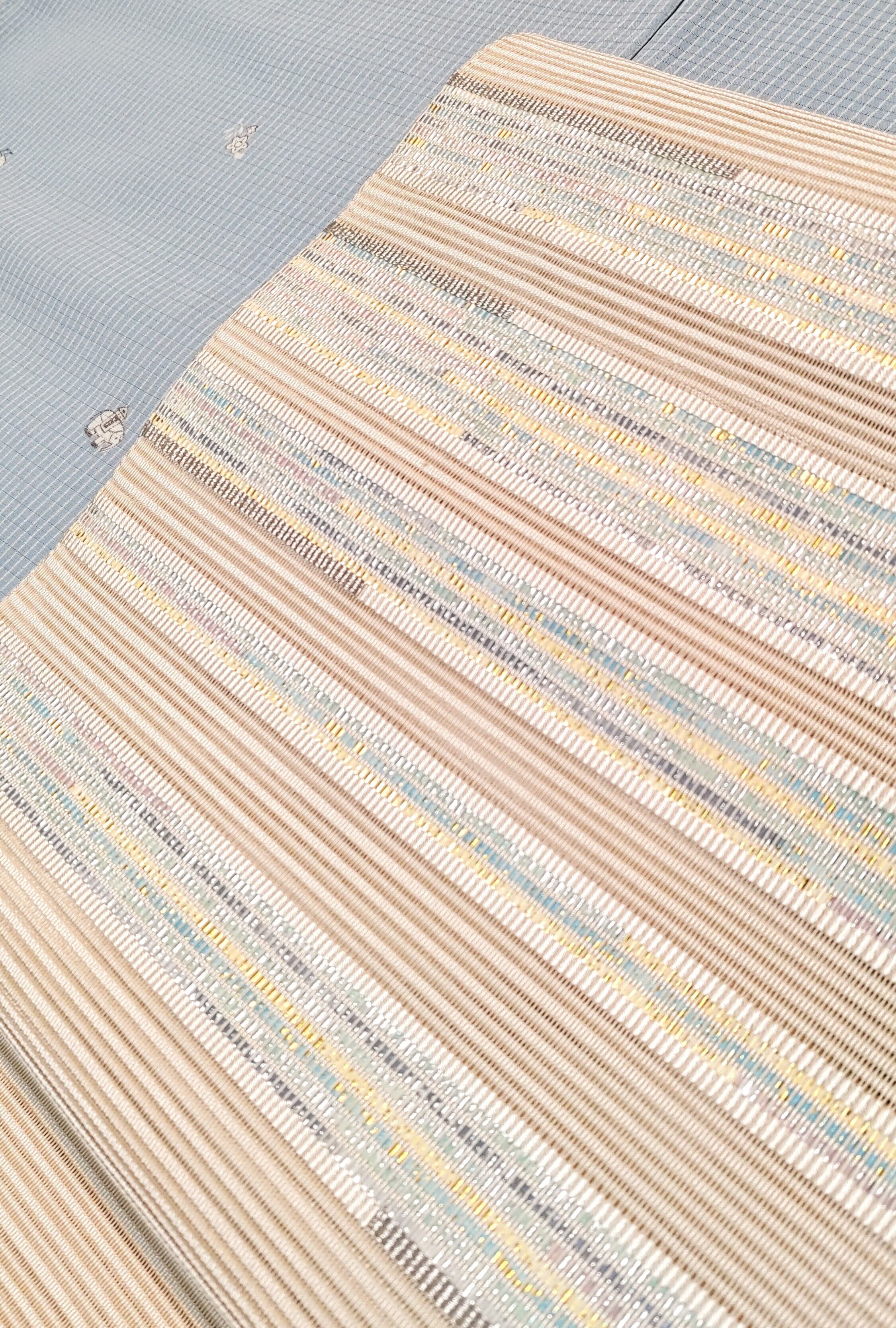 白地(アイボリー系の柔らかな白)に淡いお色と銀糸の色合いが涼しげで、夏のお着物や上質な浴衣と相性抜群◎
