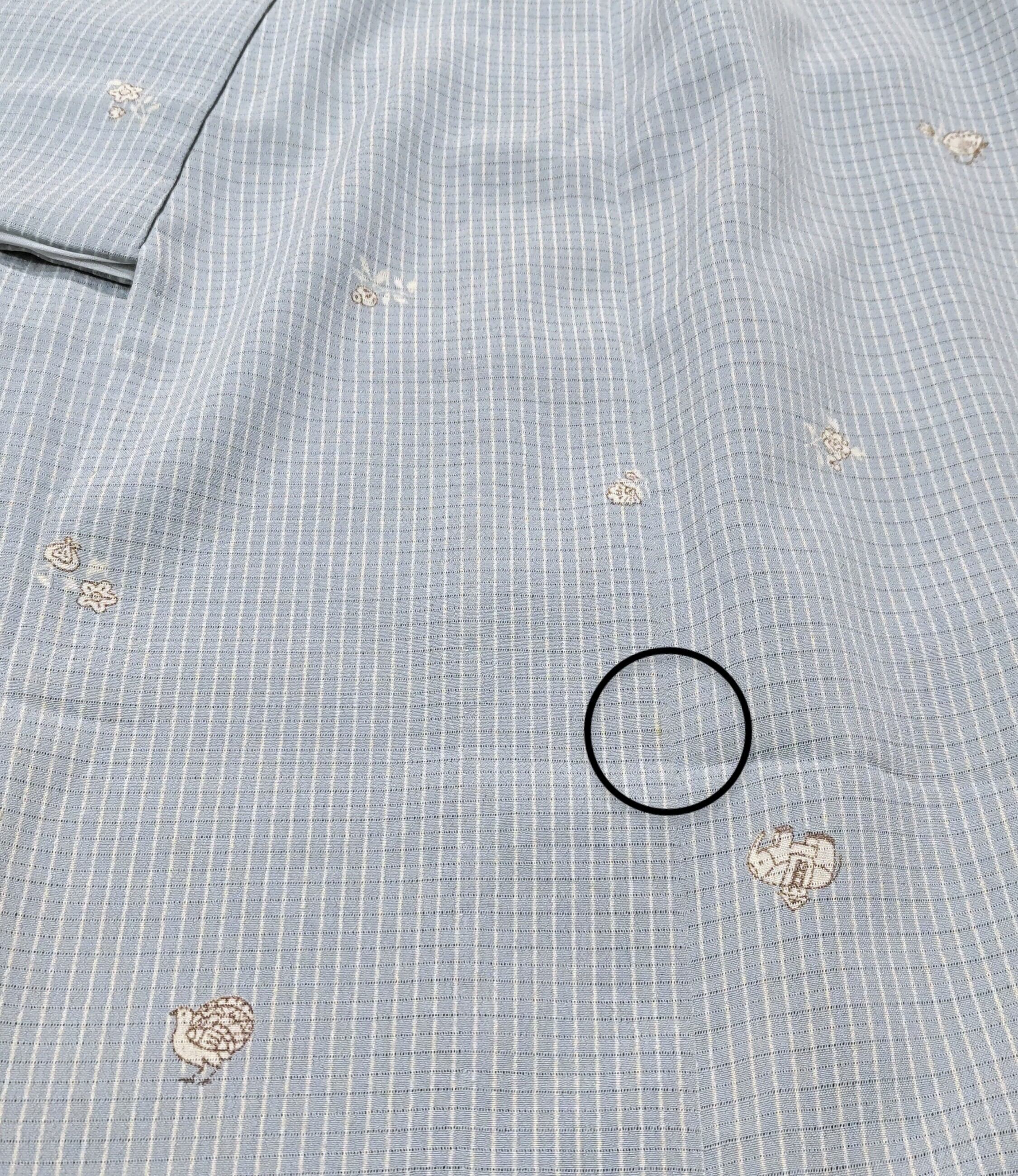 (衿と衿裏に小さなシミ、上前にも小さなシミがありますが、どれも目立たない程度です。)