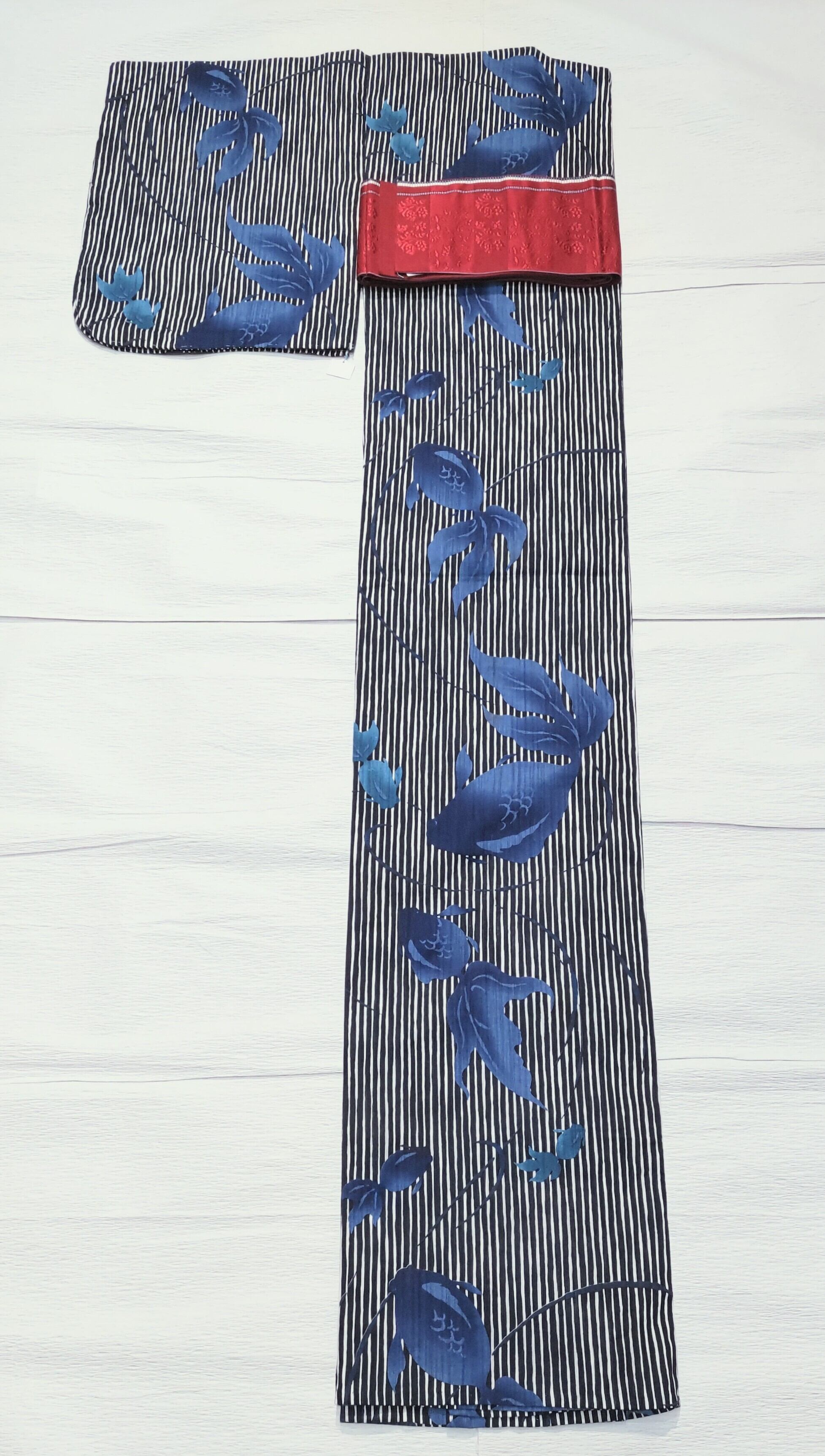 濃紺✕白ストライプに青金魚柄の浴衣です。