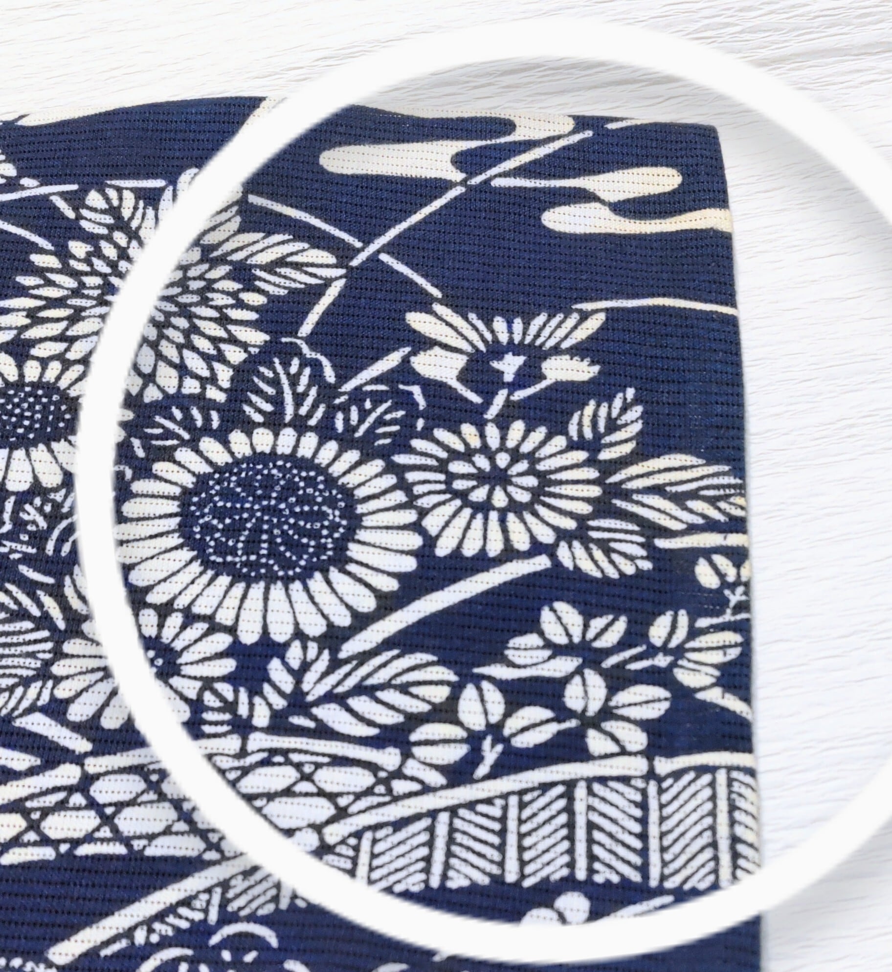 そんな綿絽の生地に長板中形を表裏を寸分違わずに糊付けをして、染め上げる技術……さすが職人さんのなせる技です。