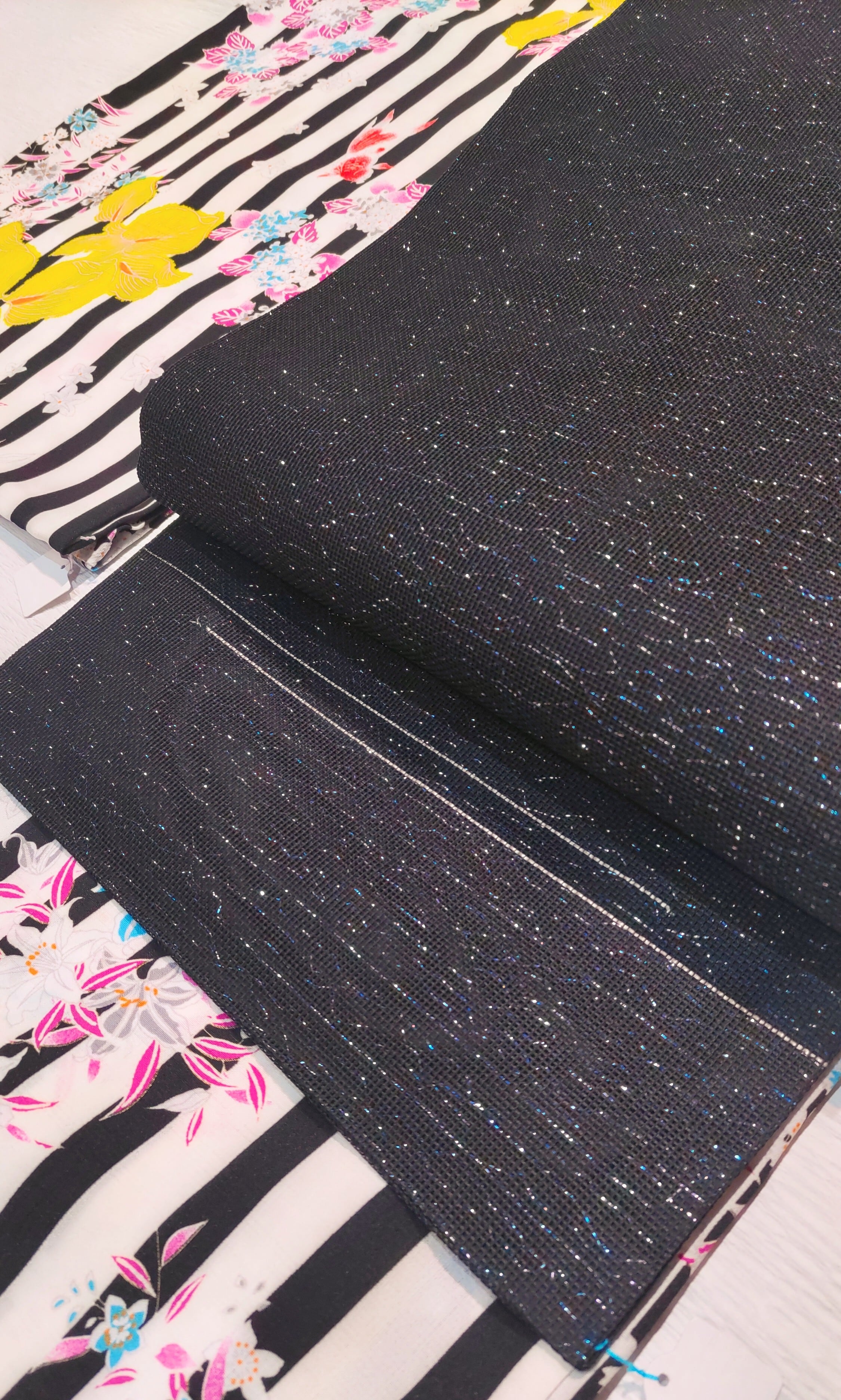 黒地にピンク色と水色のキラキラ 夏名古屋帯