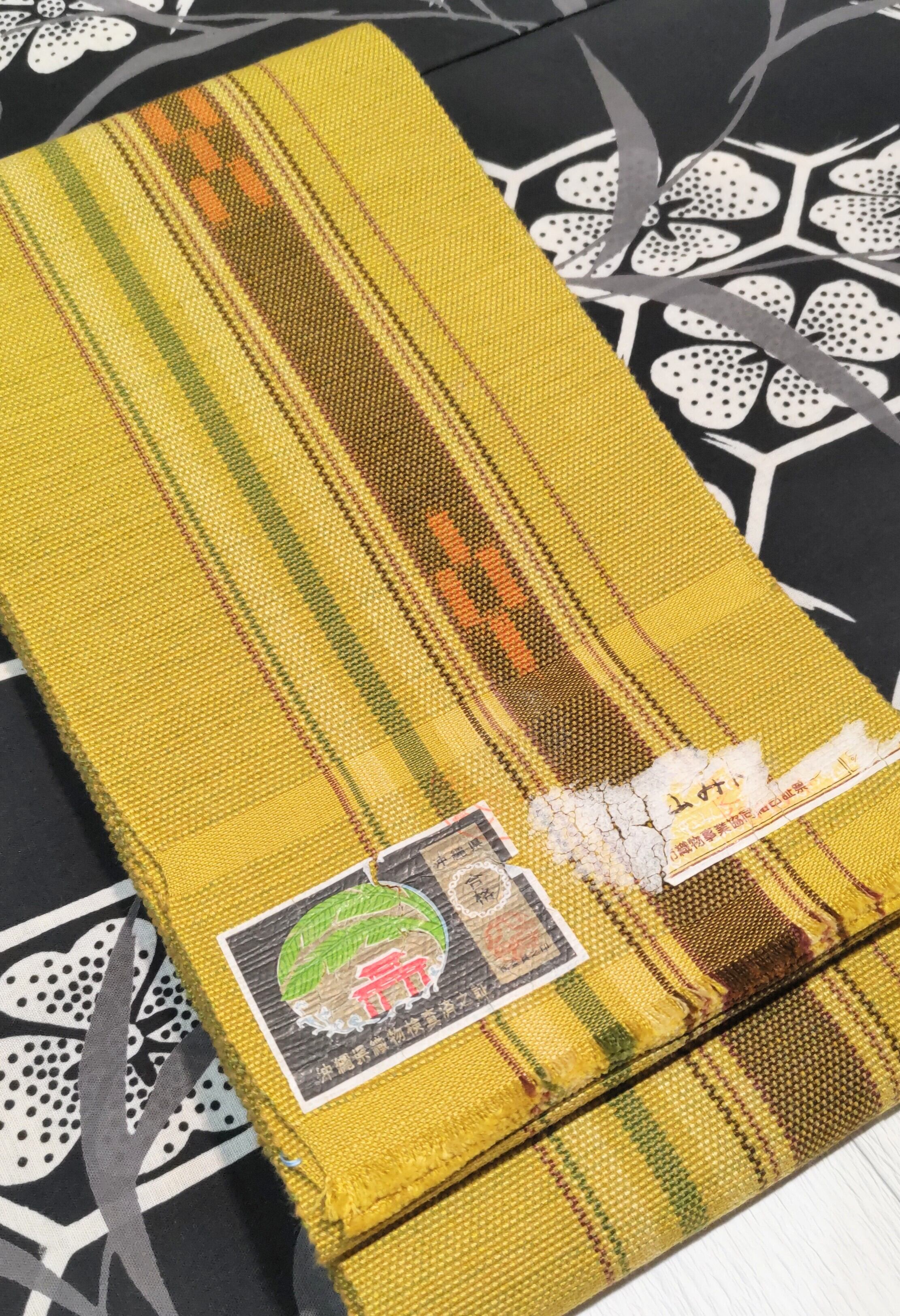 八重山みんさーの半幅帯 緑茶色 証紙つきです。