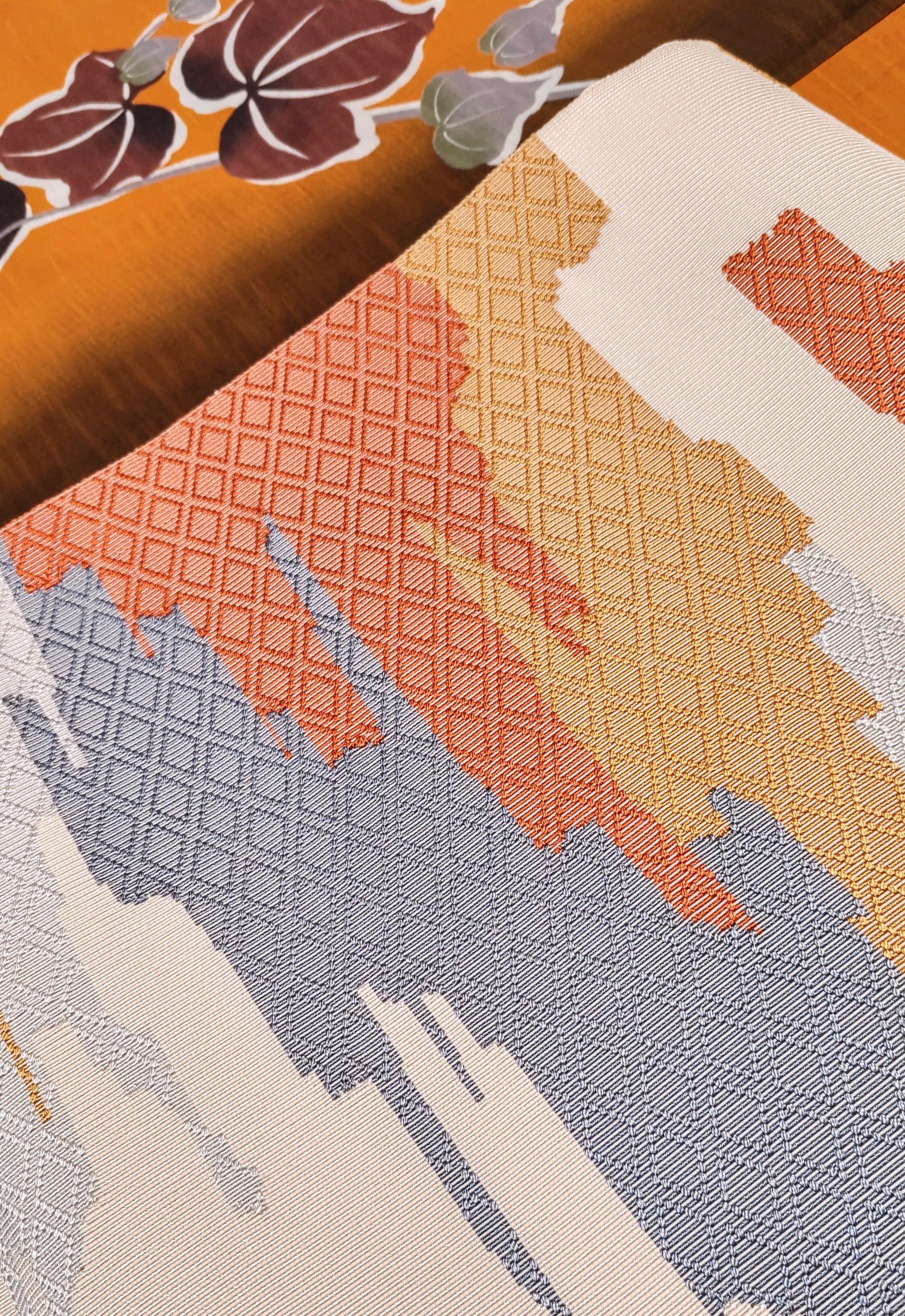 その枠の中は菱形という古典的で素敵な帯ですので、季節は問わず(真夏や真冬以外)、様々な色柄のお着物に合わせて頂けます◎