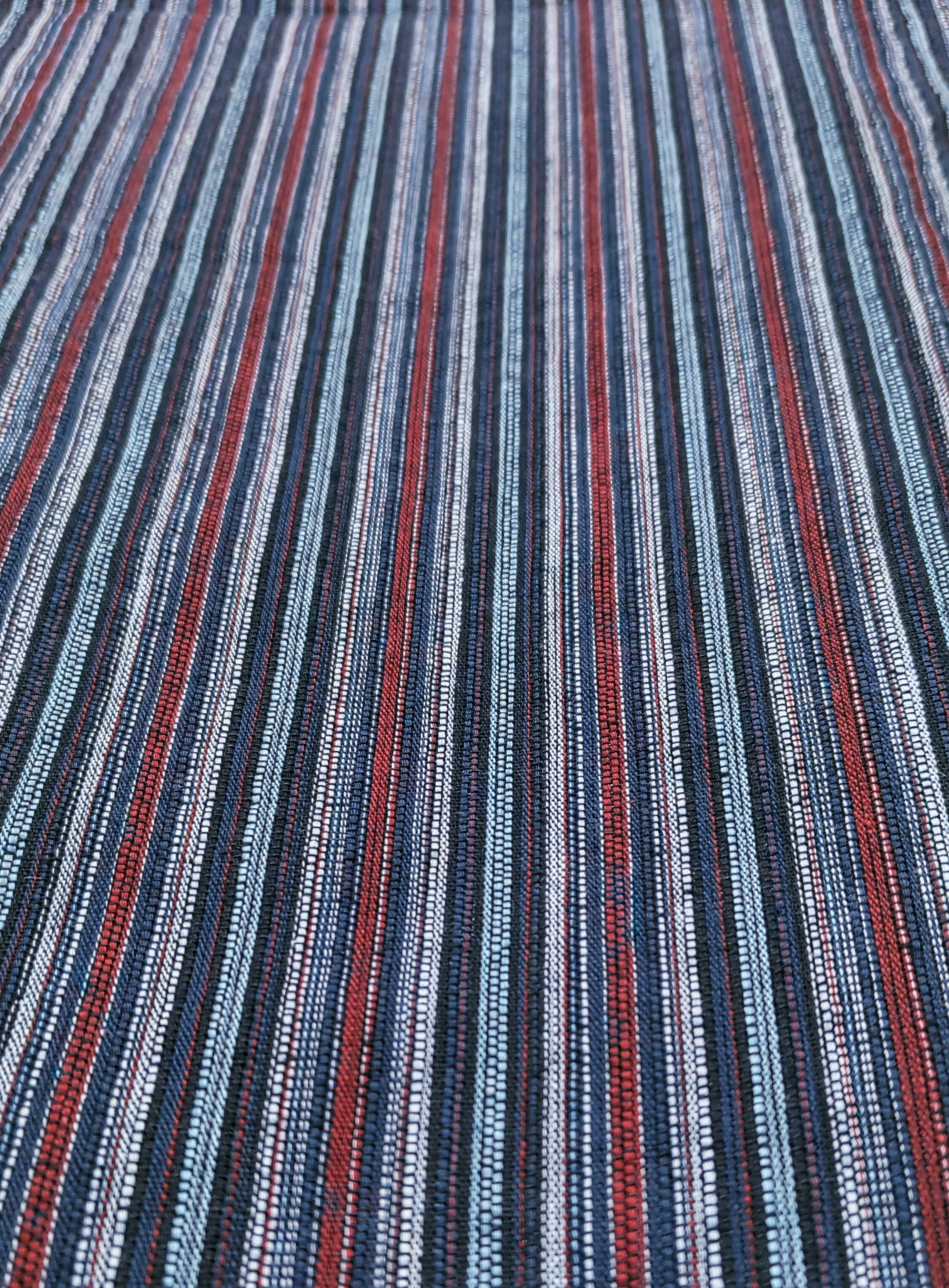 こちらは濃い紺地、赤色、白色、水色の綺麗な縞柄(ストライプ柄)になっています。