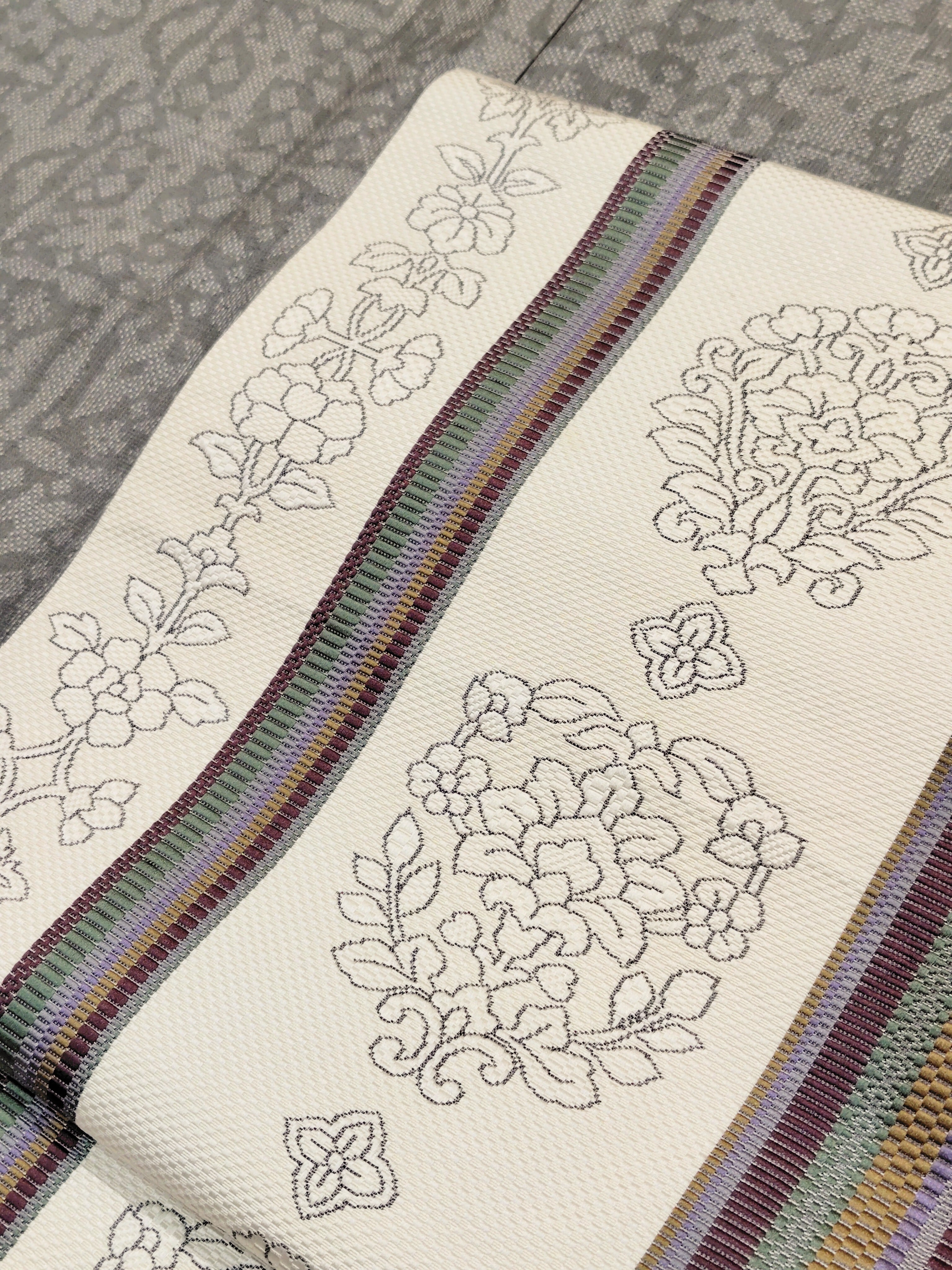 白地に渋い差し色 唐草花柄の博多織り名古屋帯