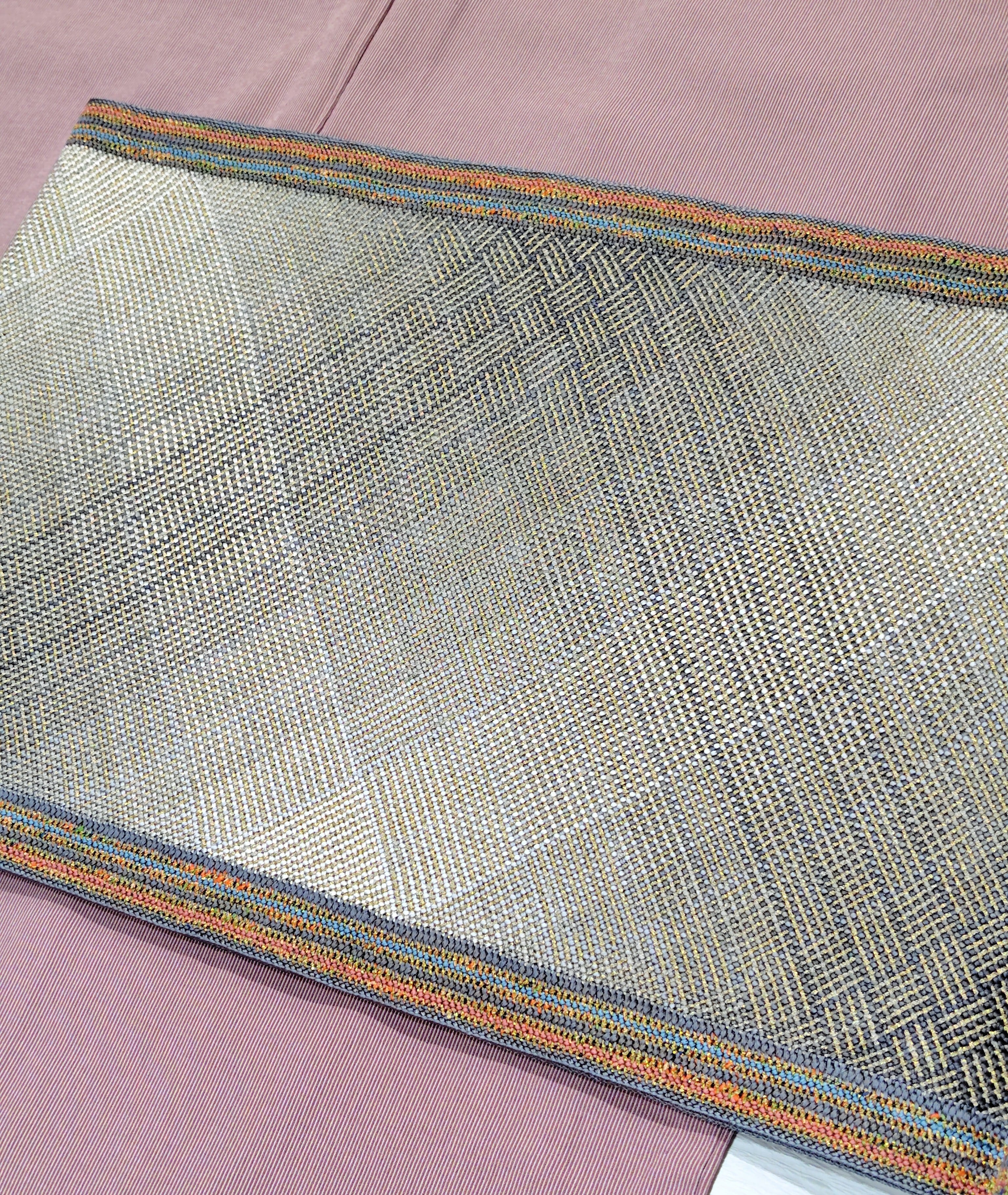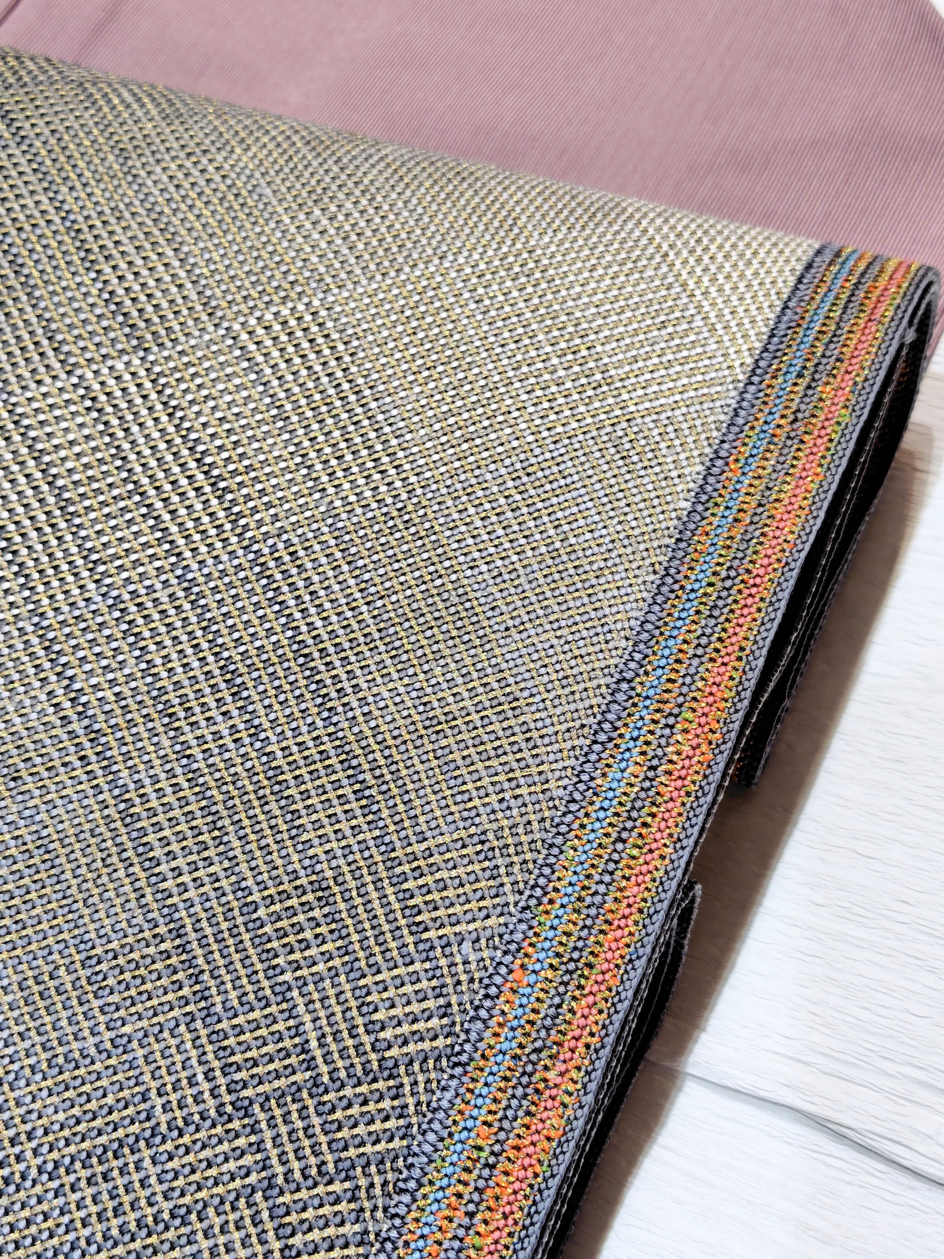 金糸、オレンジ色、ピンクベージュ色、紺色、青色の差し色が両端に入っています。