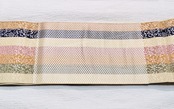 生成り色の地に、金茶色、紺色、くすんだ淡い青みピンク色、くすんだ淡い抹茶色の組み合わせが、とても優しくシックな雰囲気。