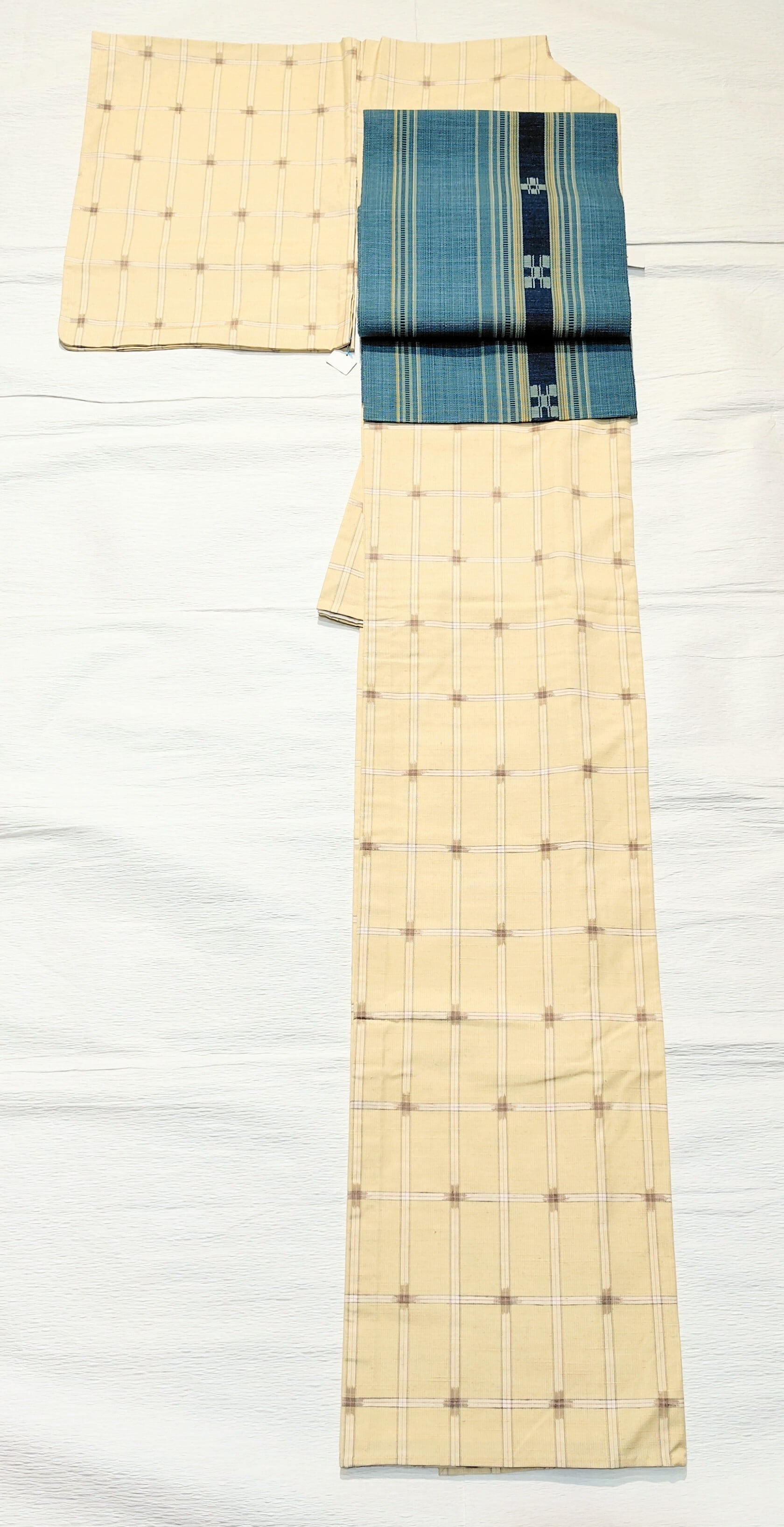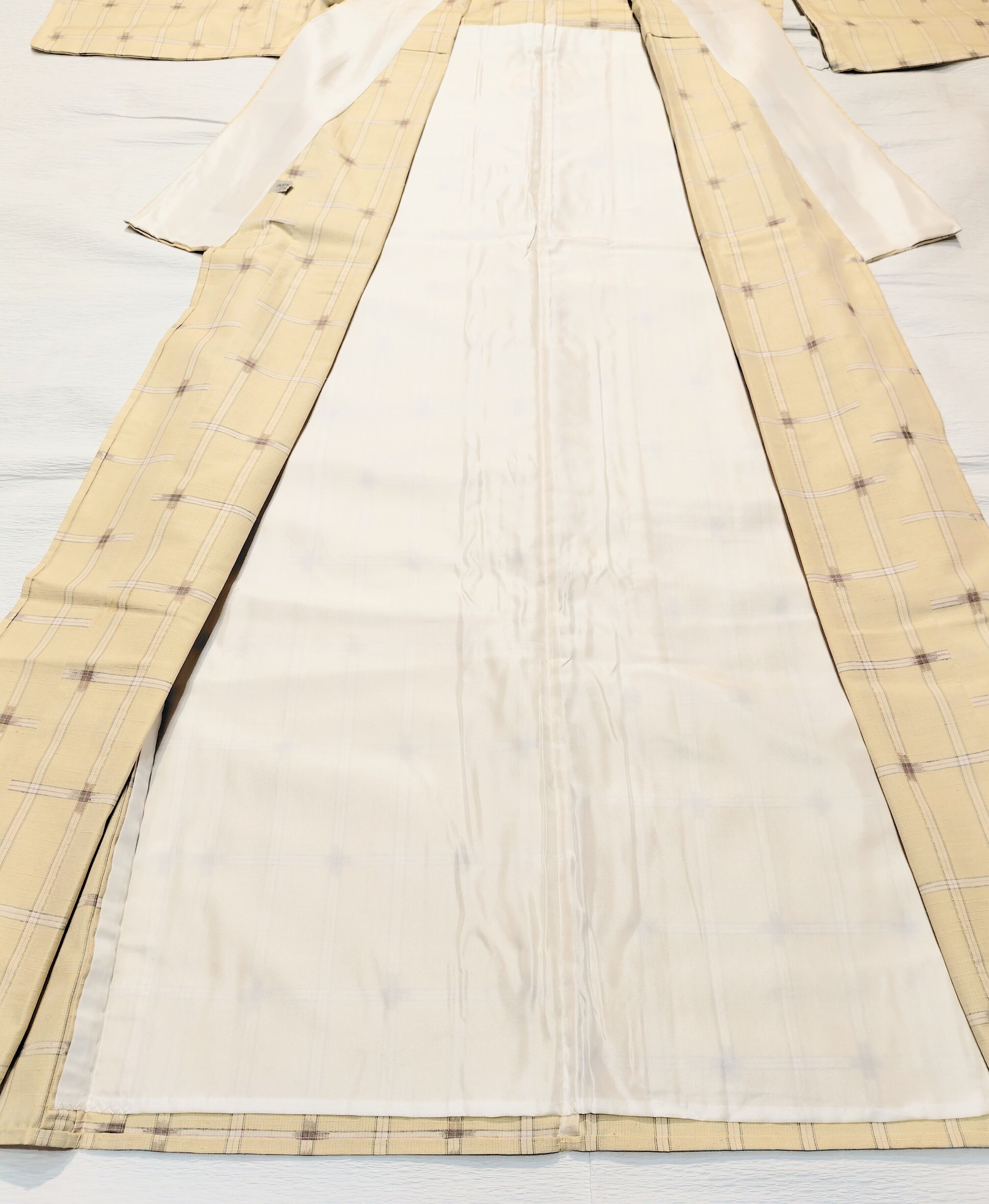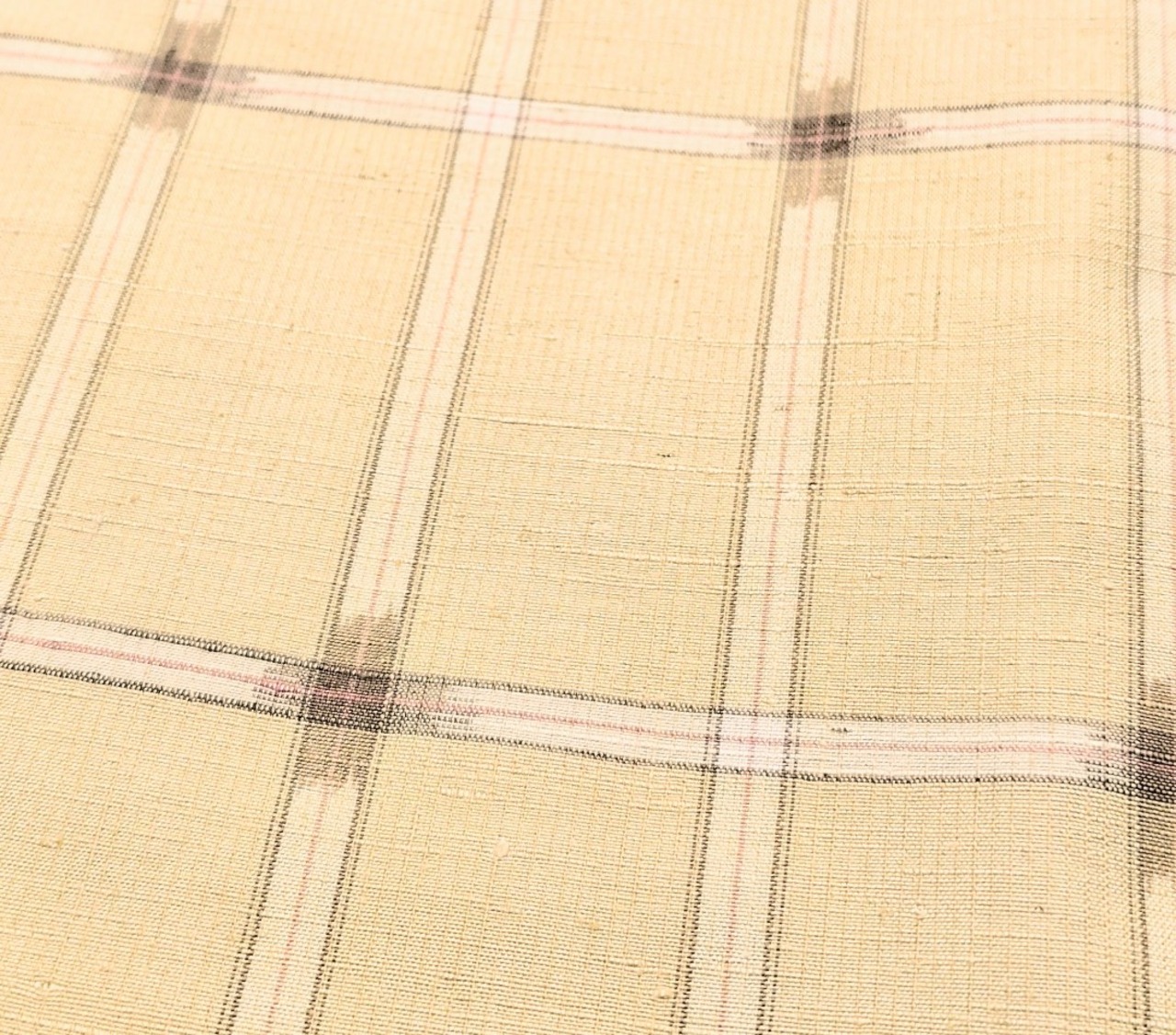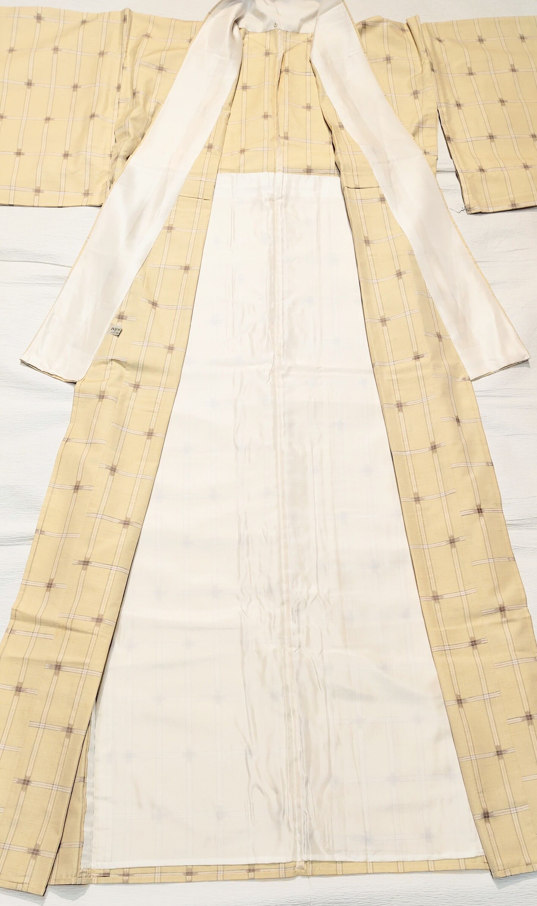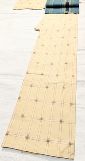 生成り地にグレー色と白色のチェック柄(格子柄)のシンプルな紬の単衣です。