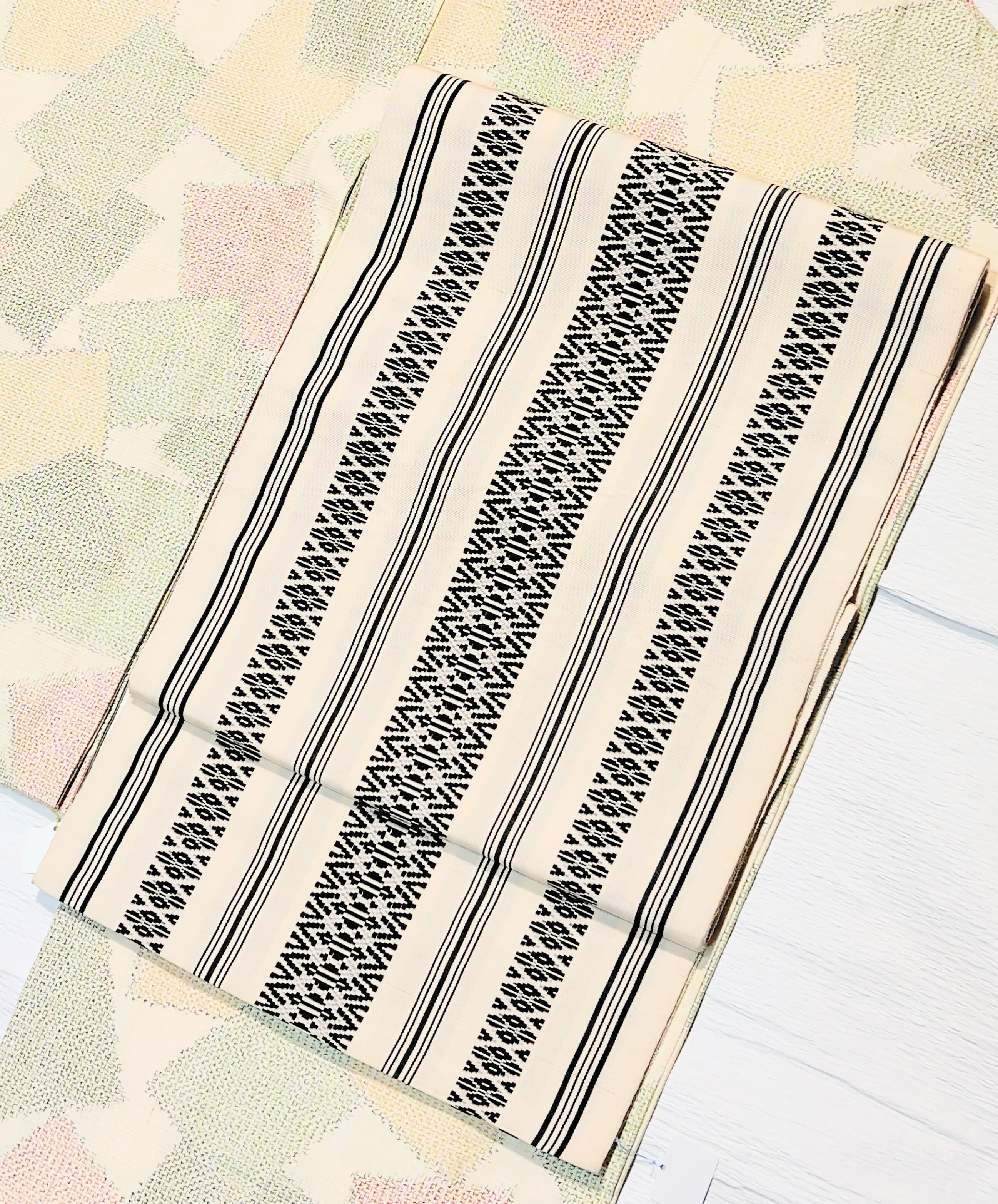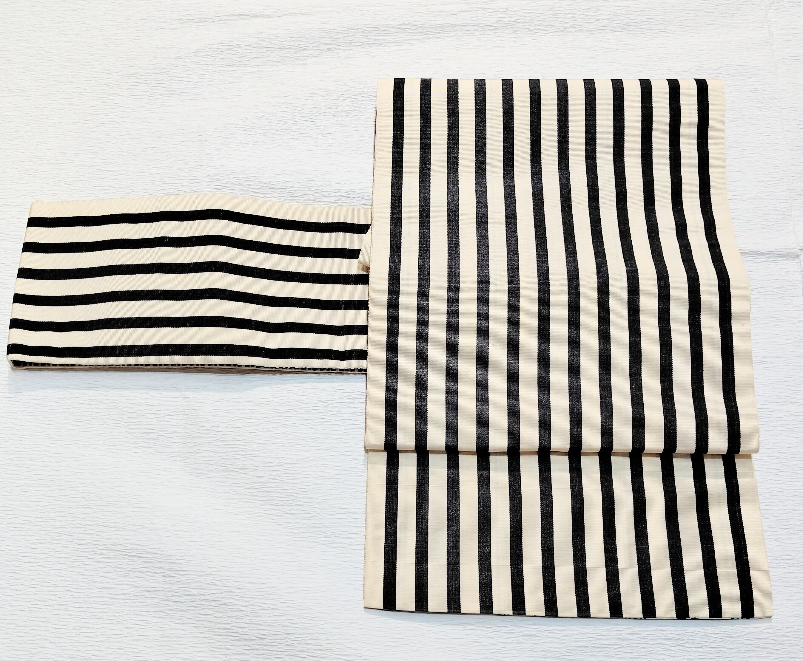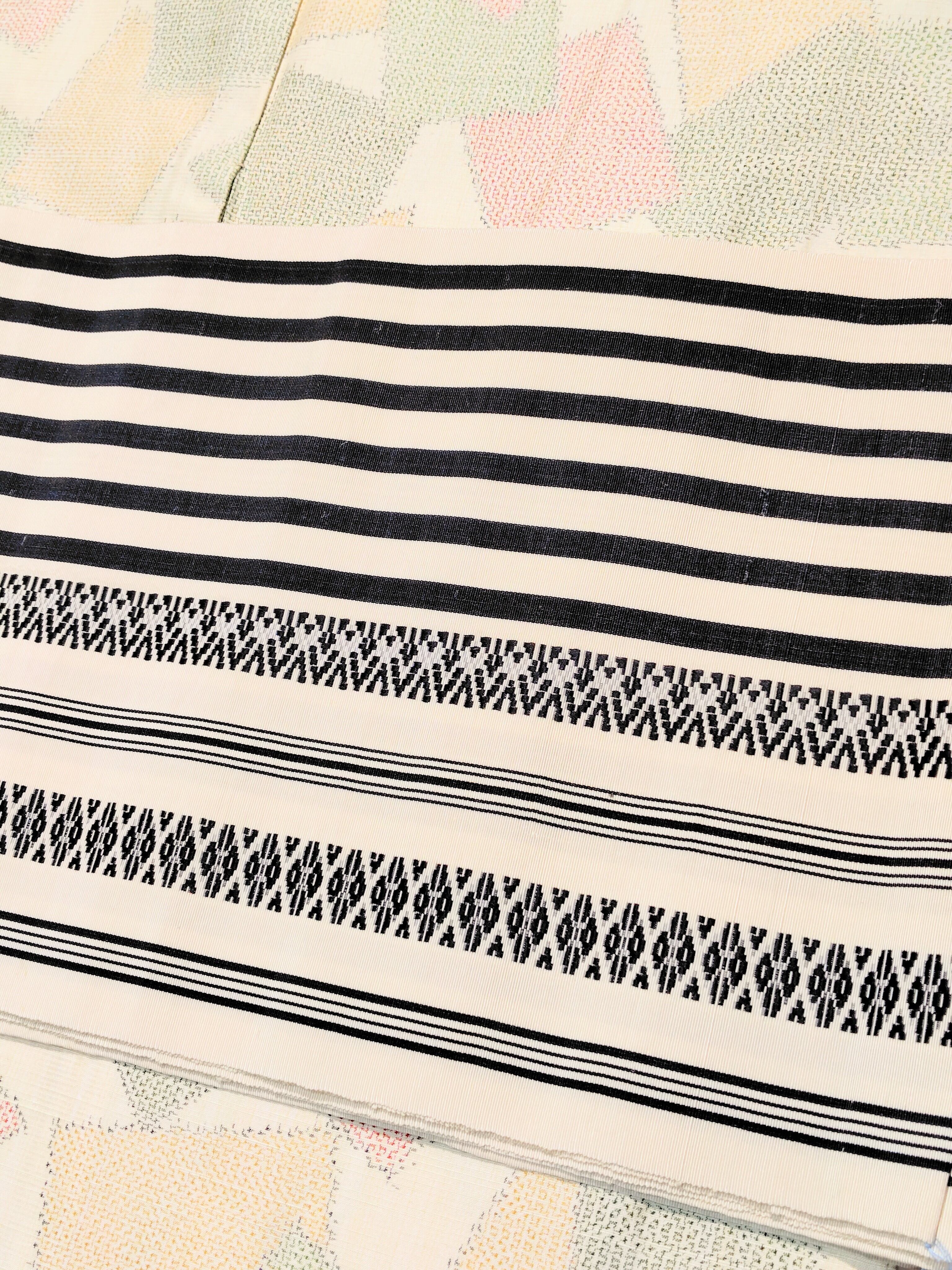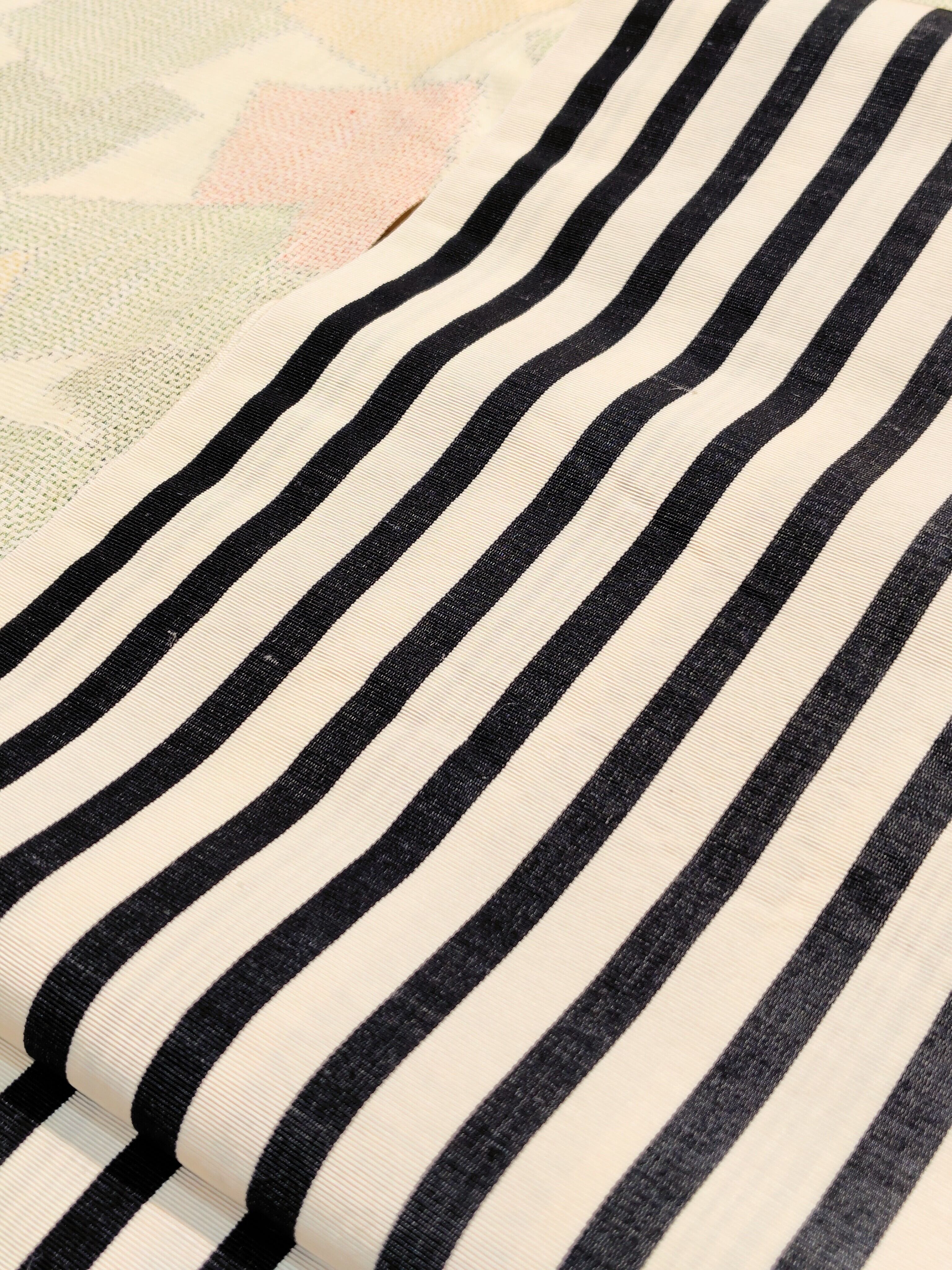 白黒ボーダーと献上柄の博多織 名古屋帯です。