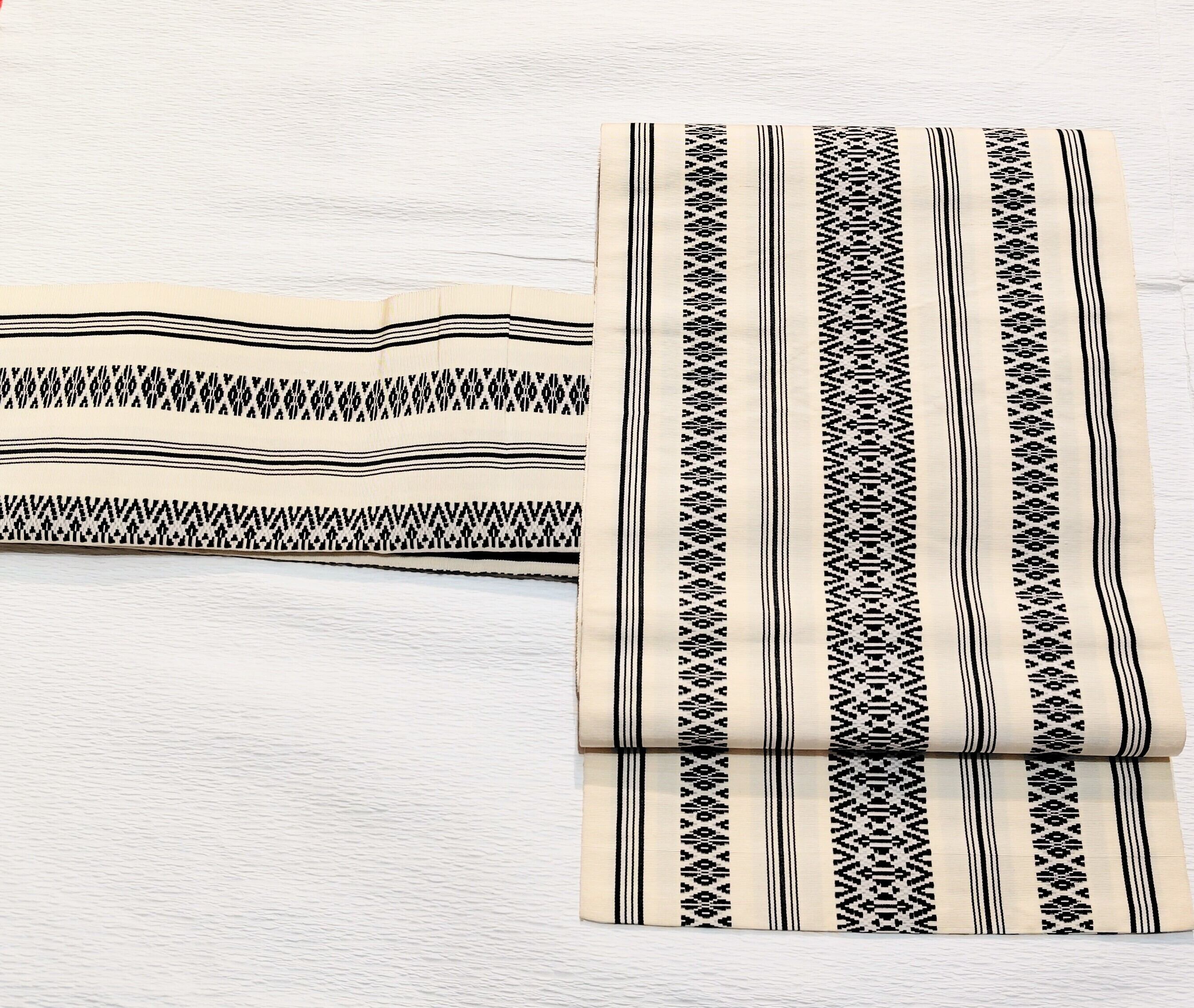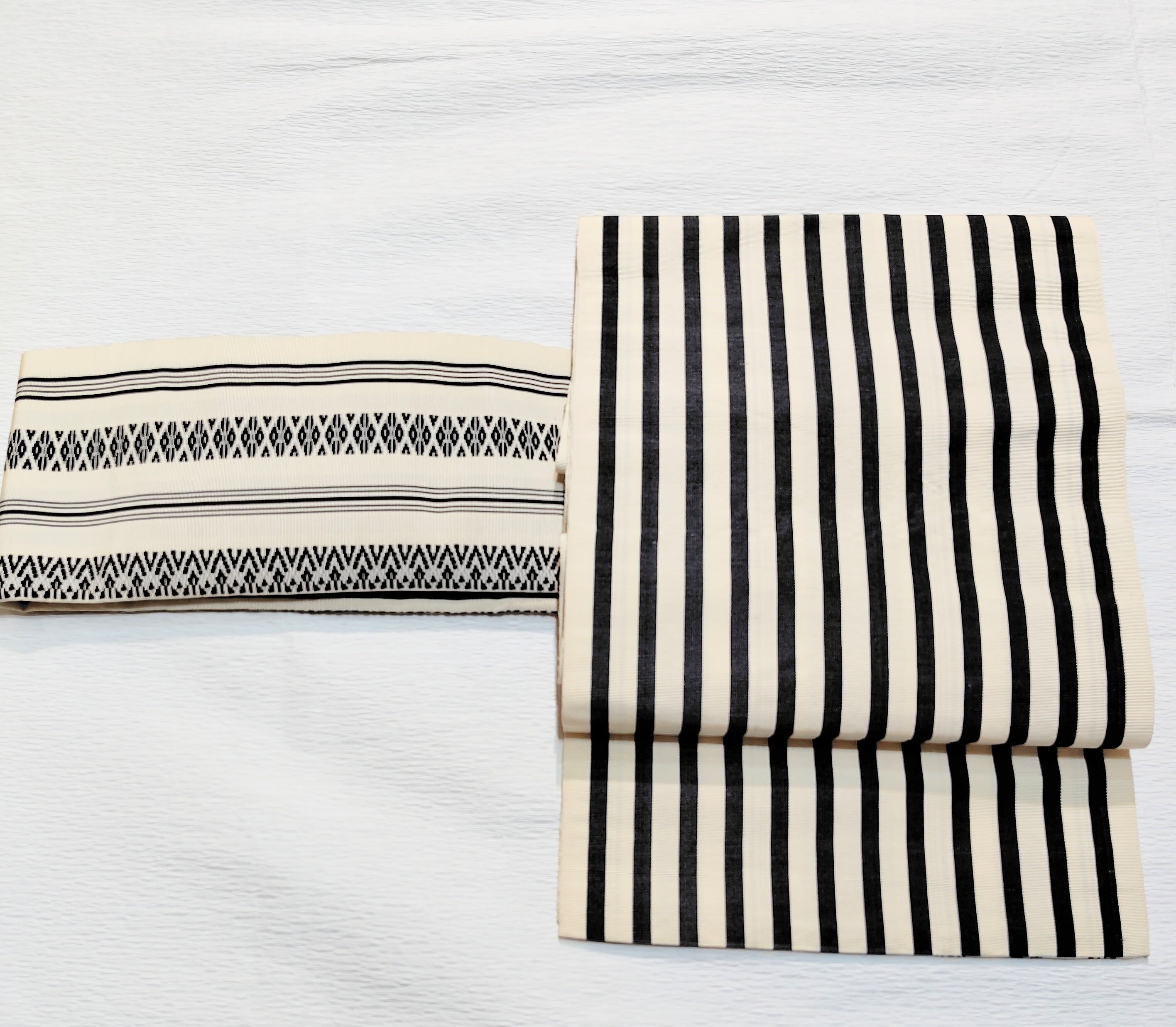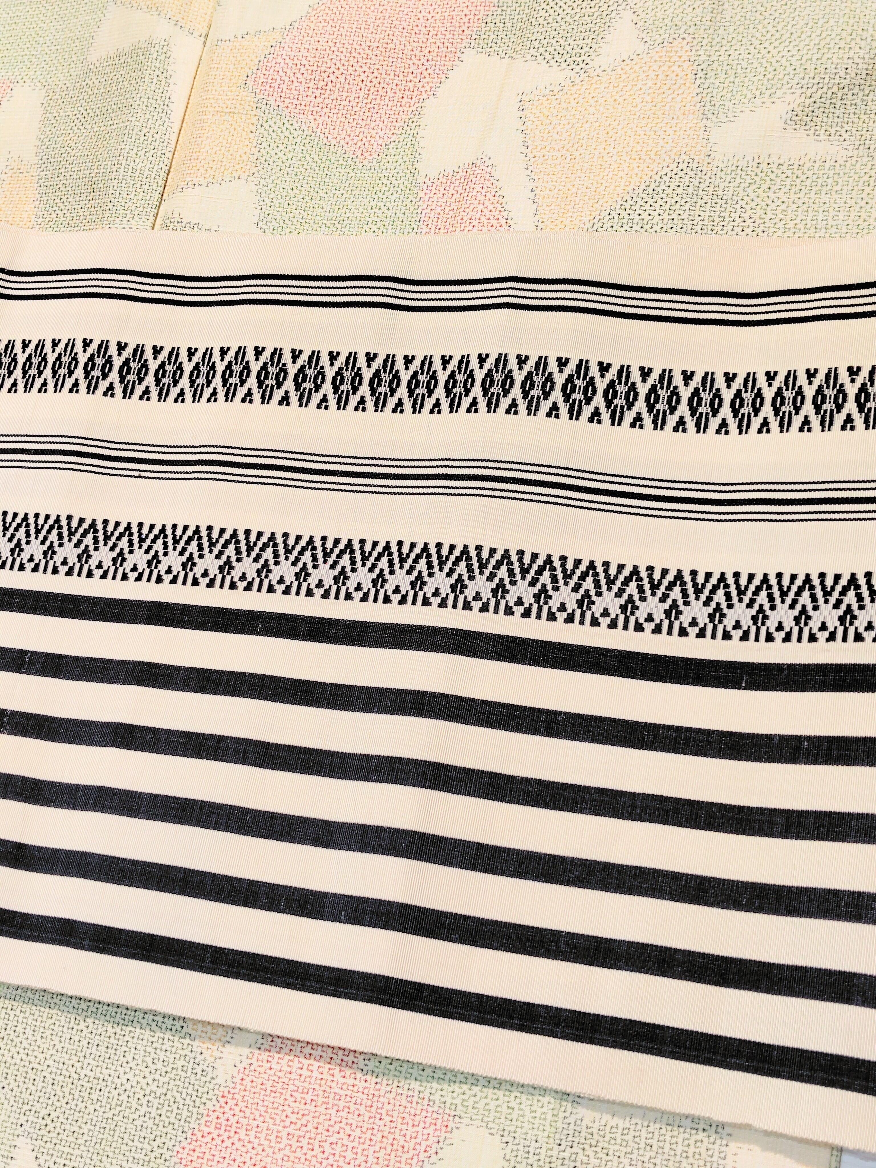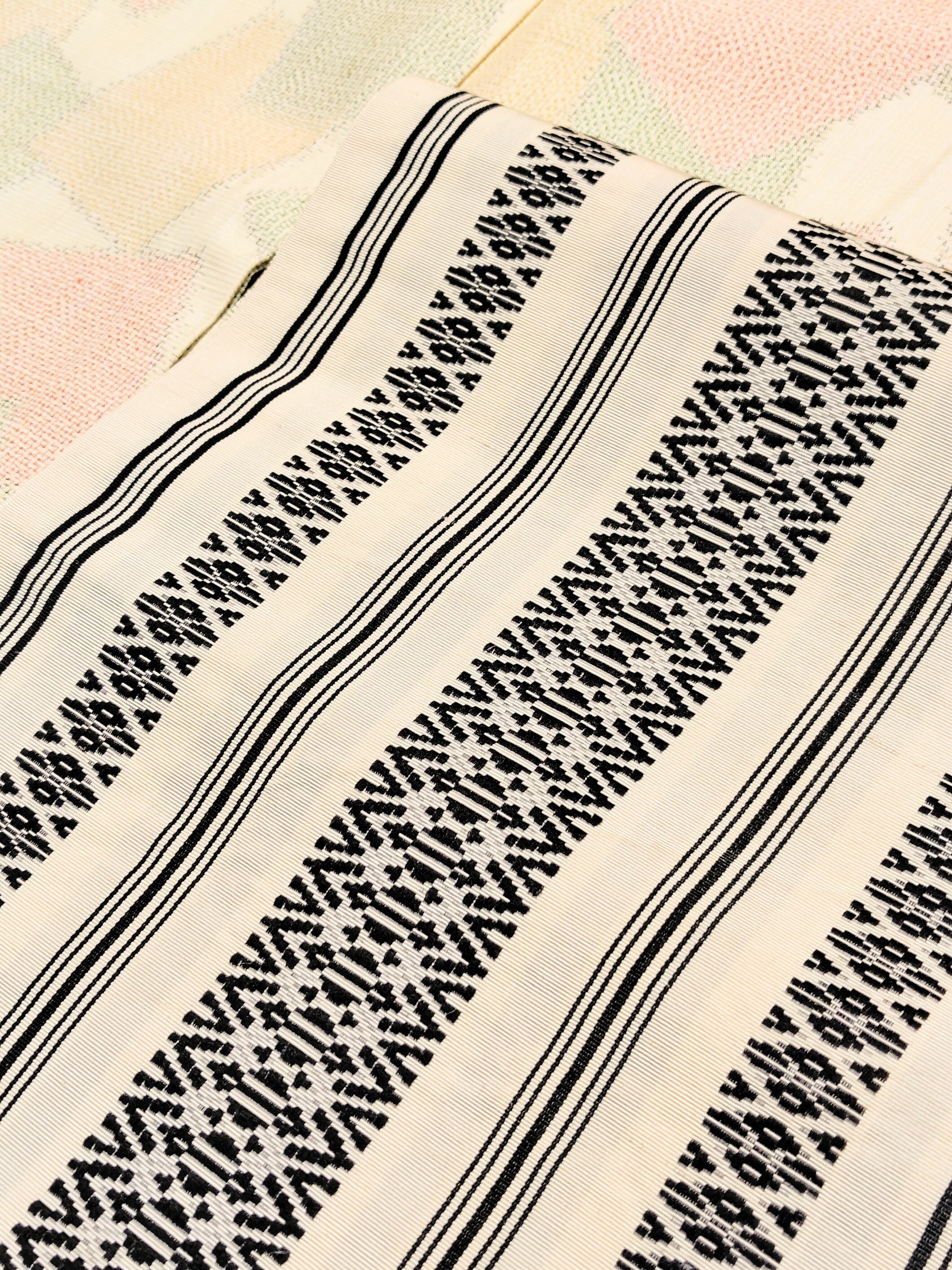 白黒ボーダーと献上柄の博多織 名古屋帯です。