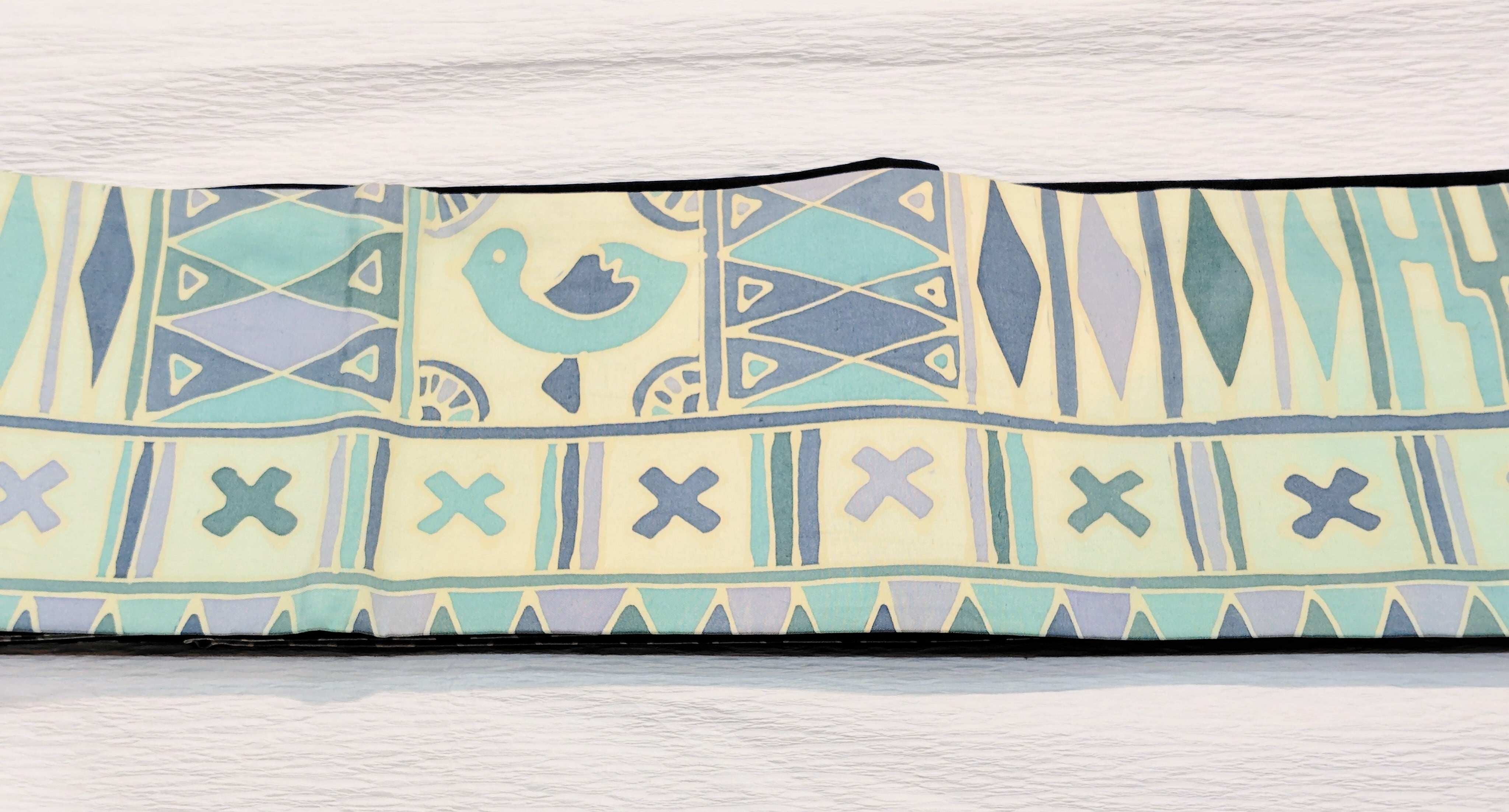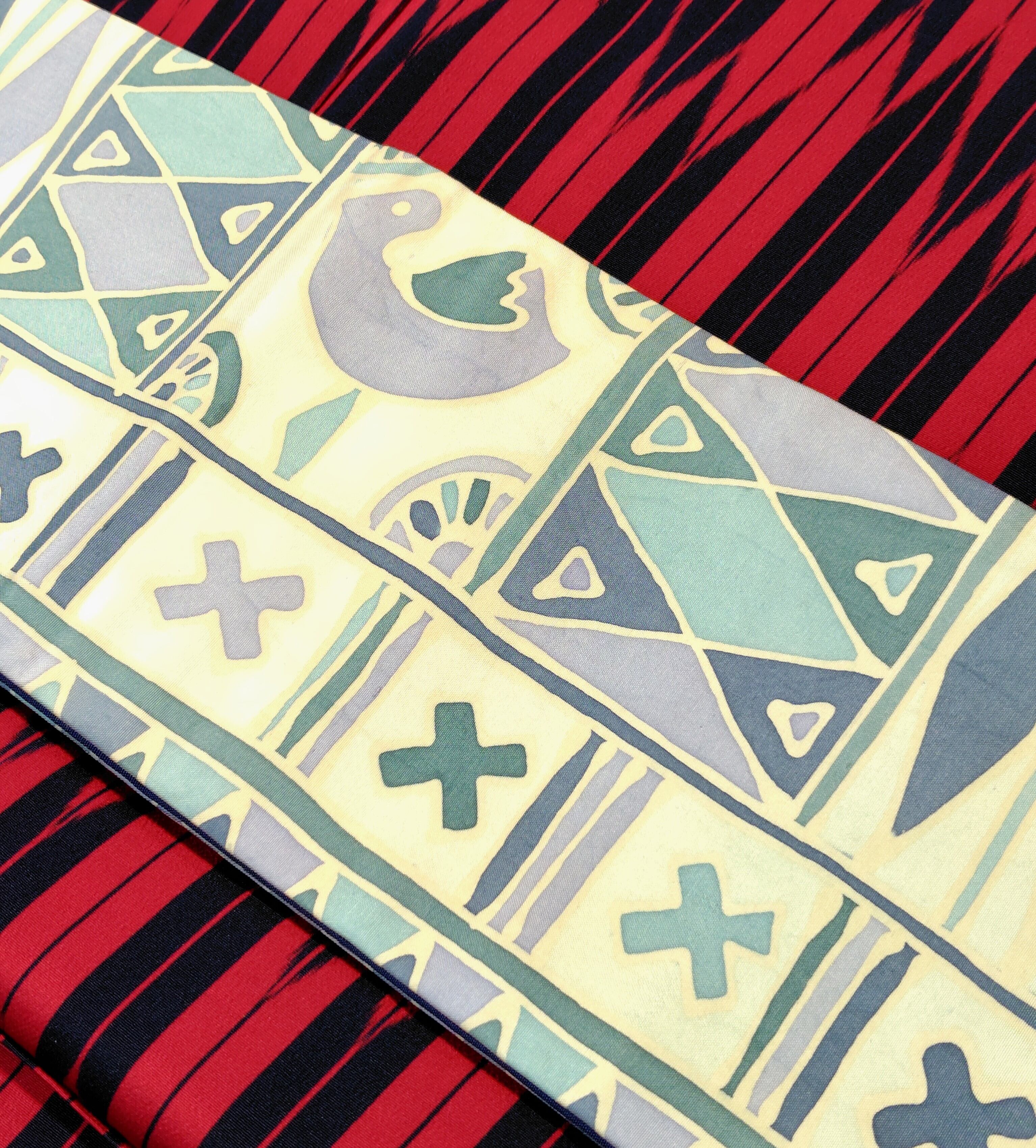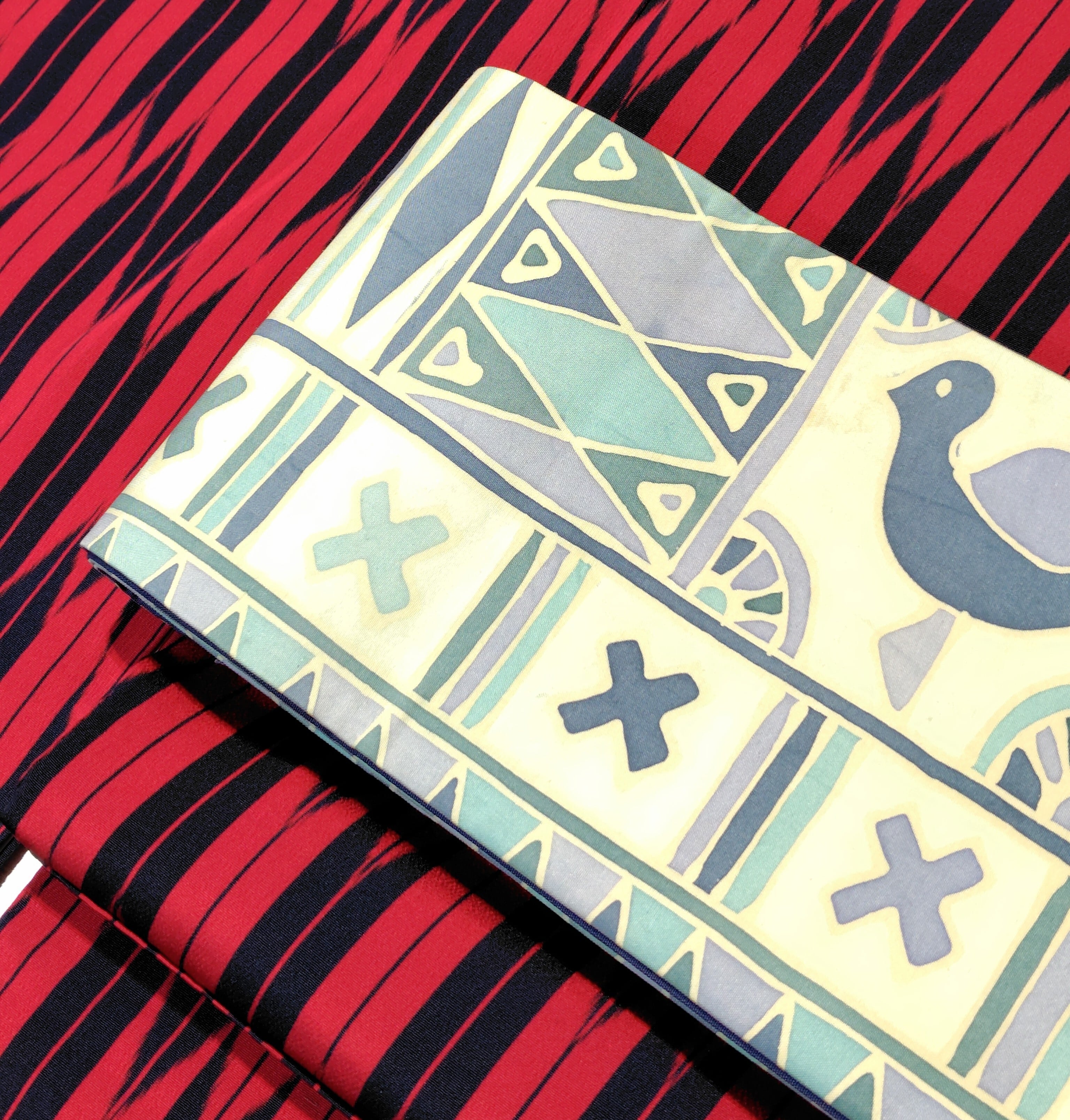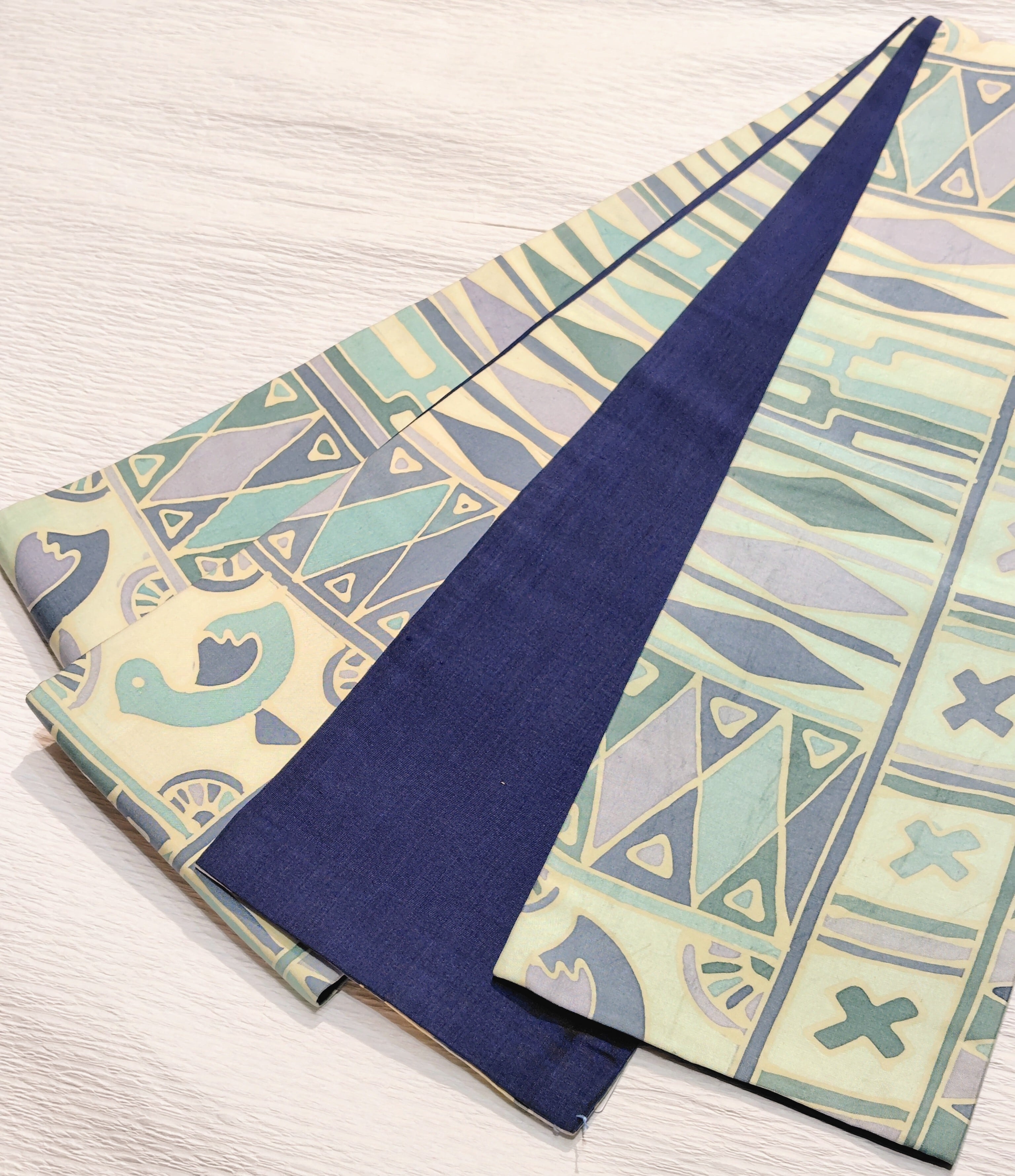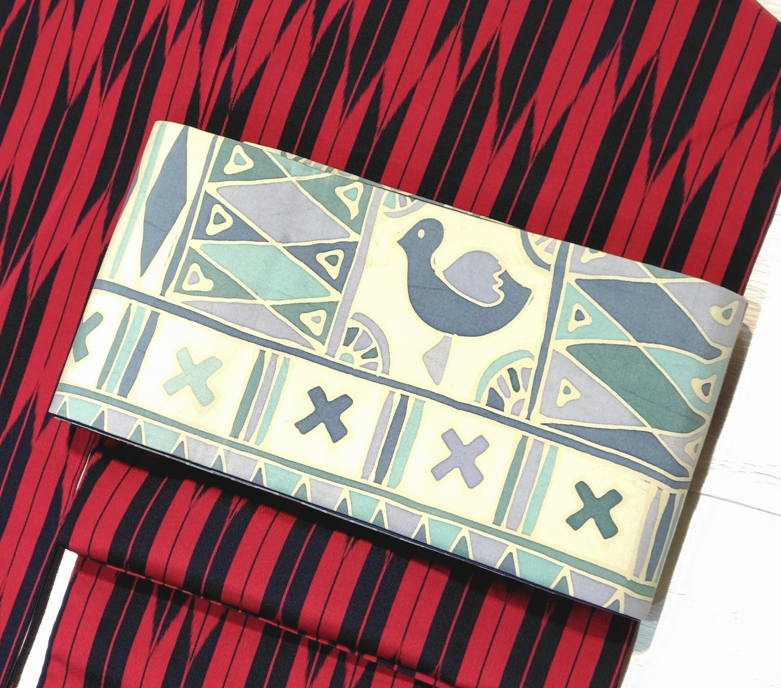 まるでアンティークの昼夜帯の仕立て直し品のような色柄の半幅帯。