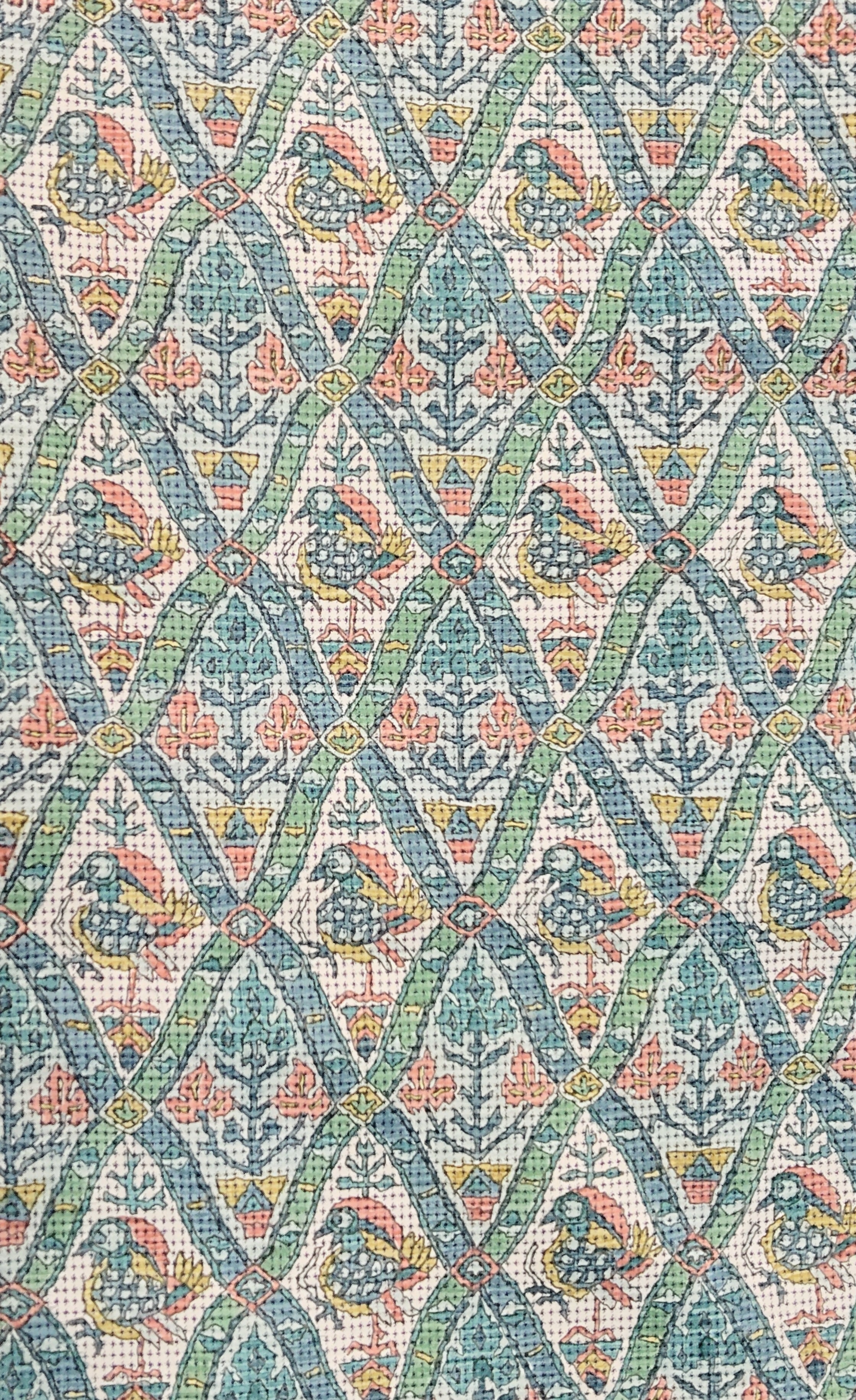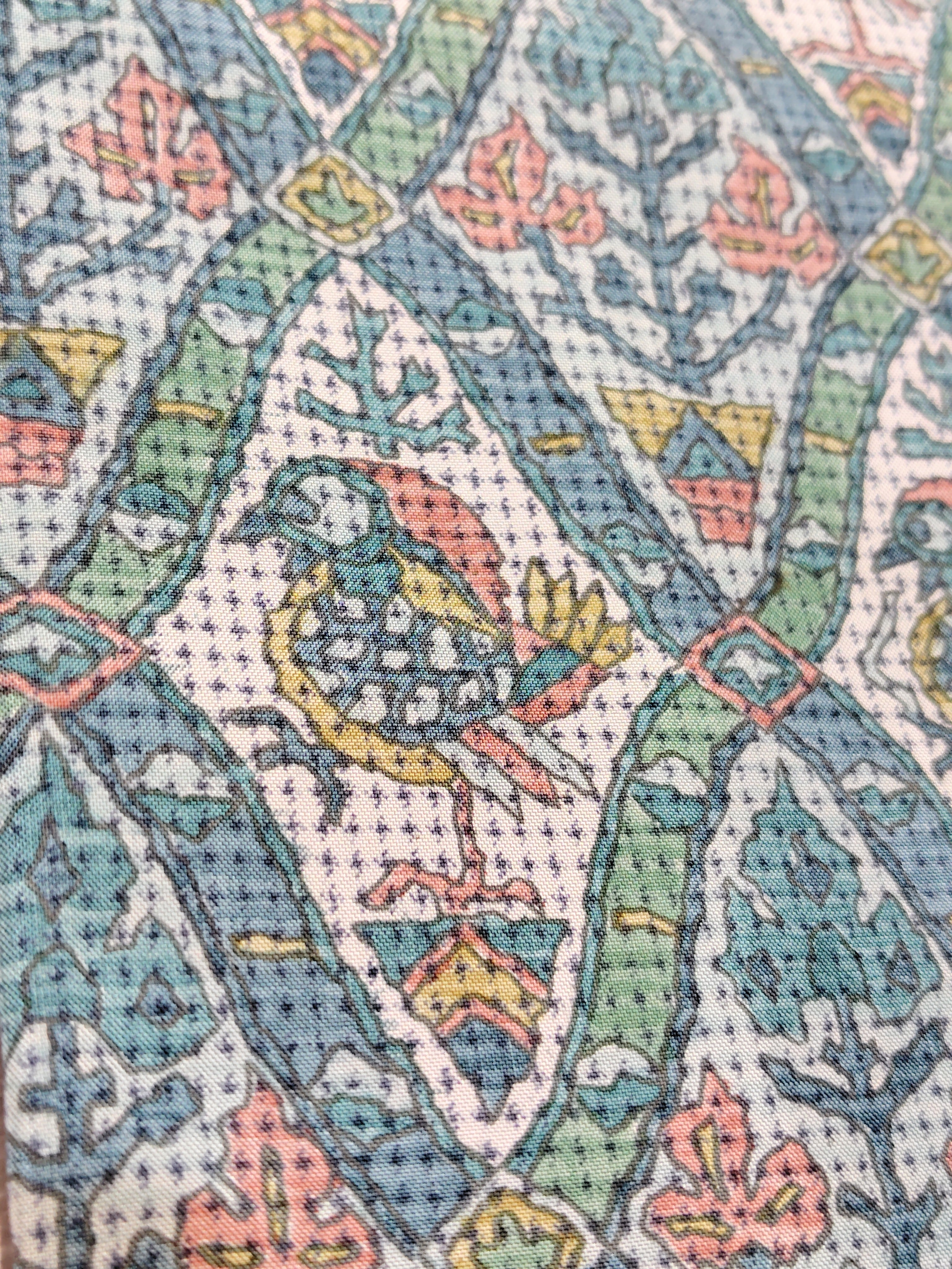絵本に出てくるようなカラフルな鳥さんは個性的で愛らしく、また周りを囲う縁取りの形や唐花のような架空の草花も素敵です。