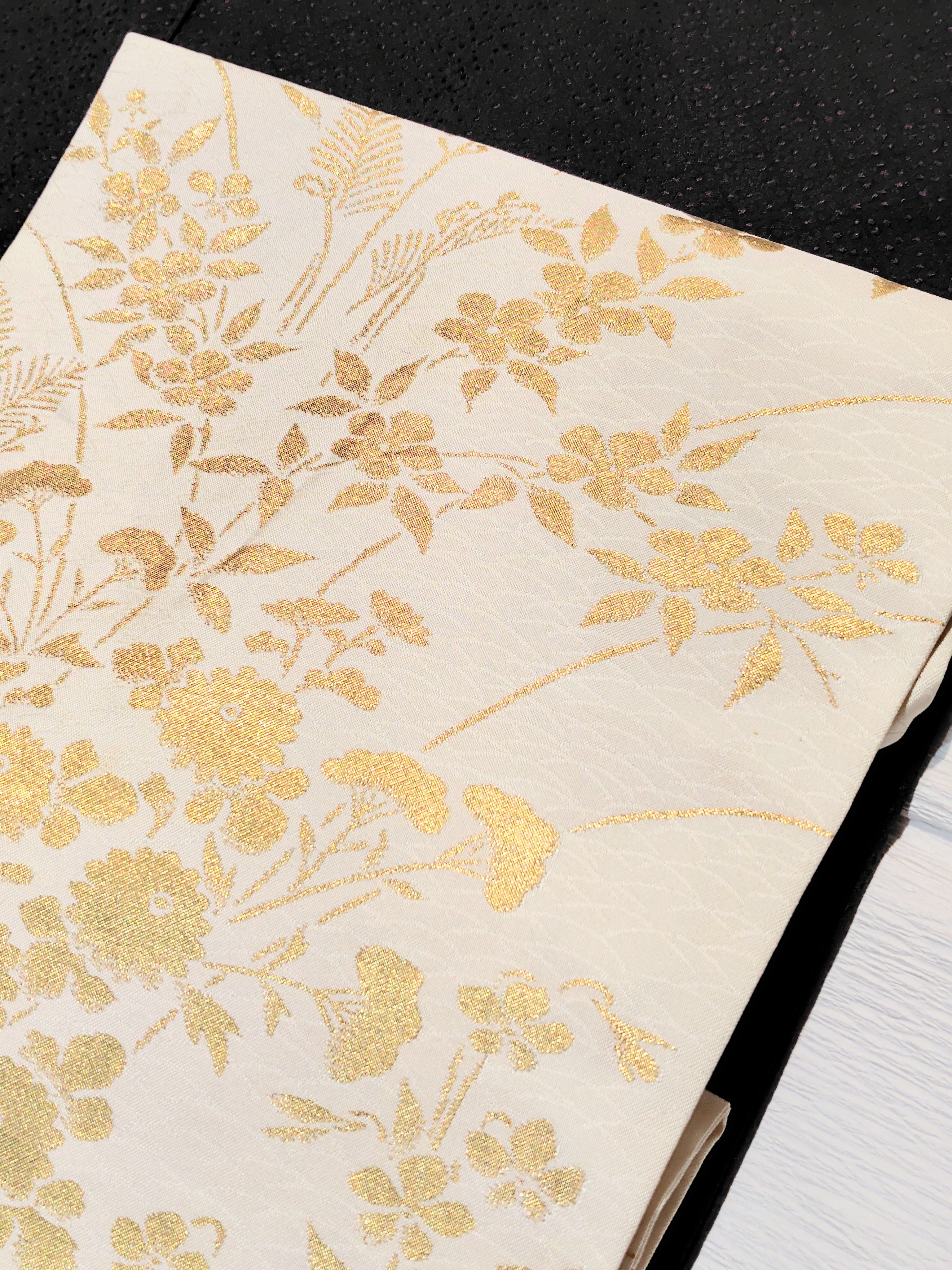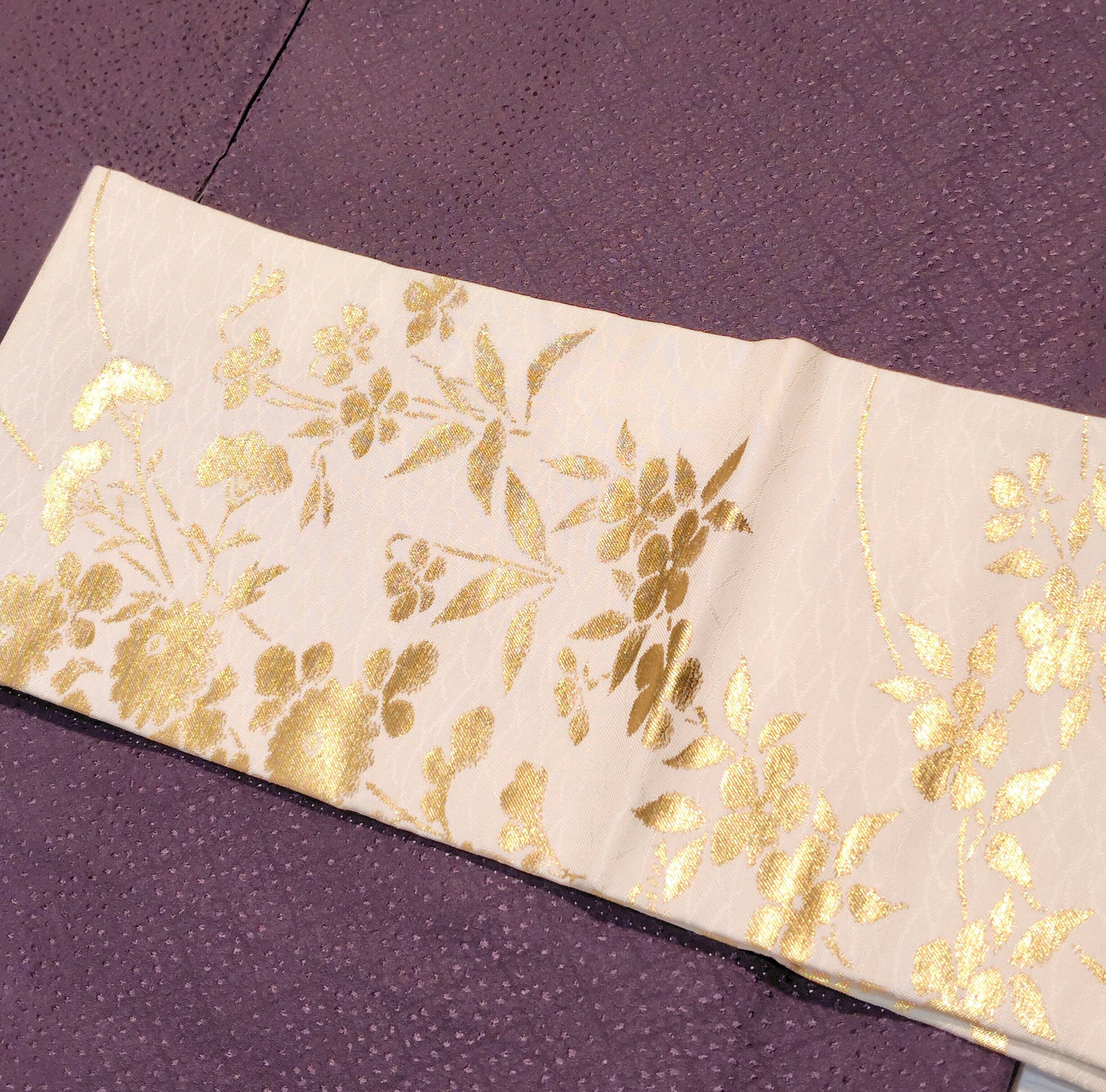 白地に金糸でお花柄のシンプルな名古屋帯。シンプルゆえに図案の美しさが際立ちます。