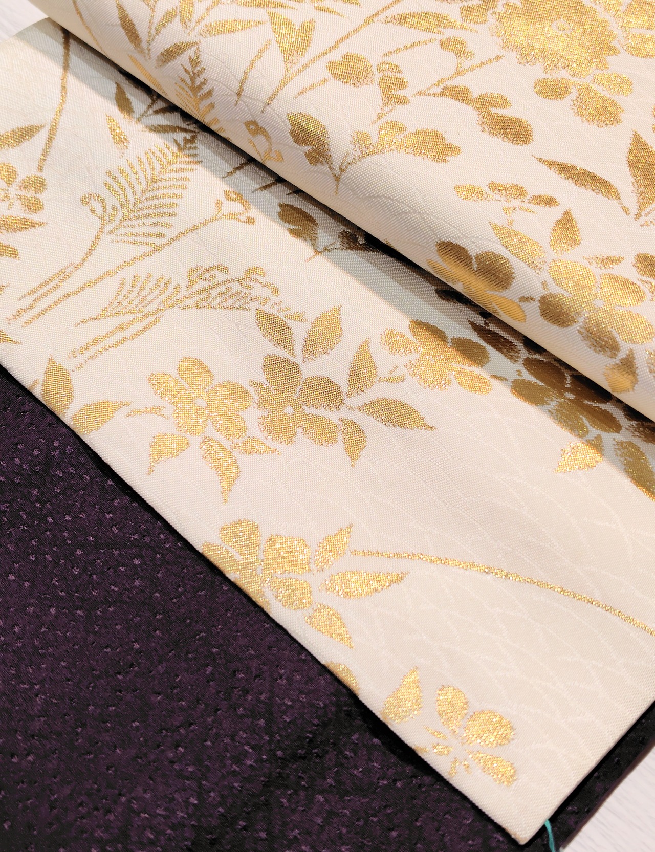 白地に金糸 秋の草花と菫柄の名古屋帯