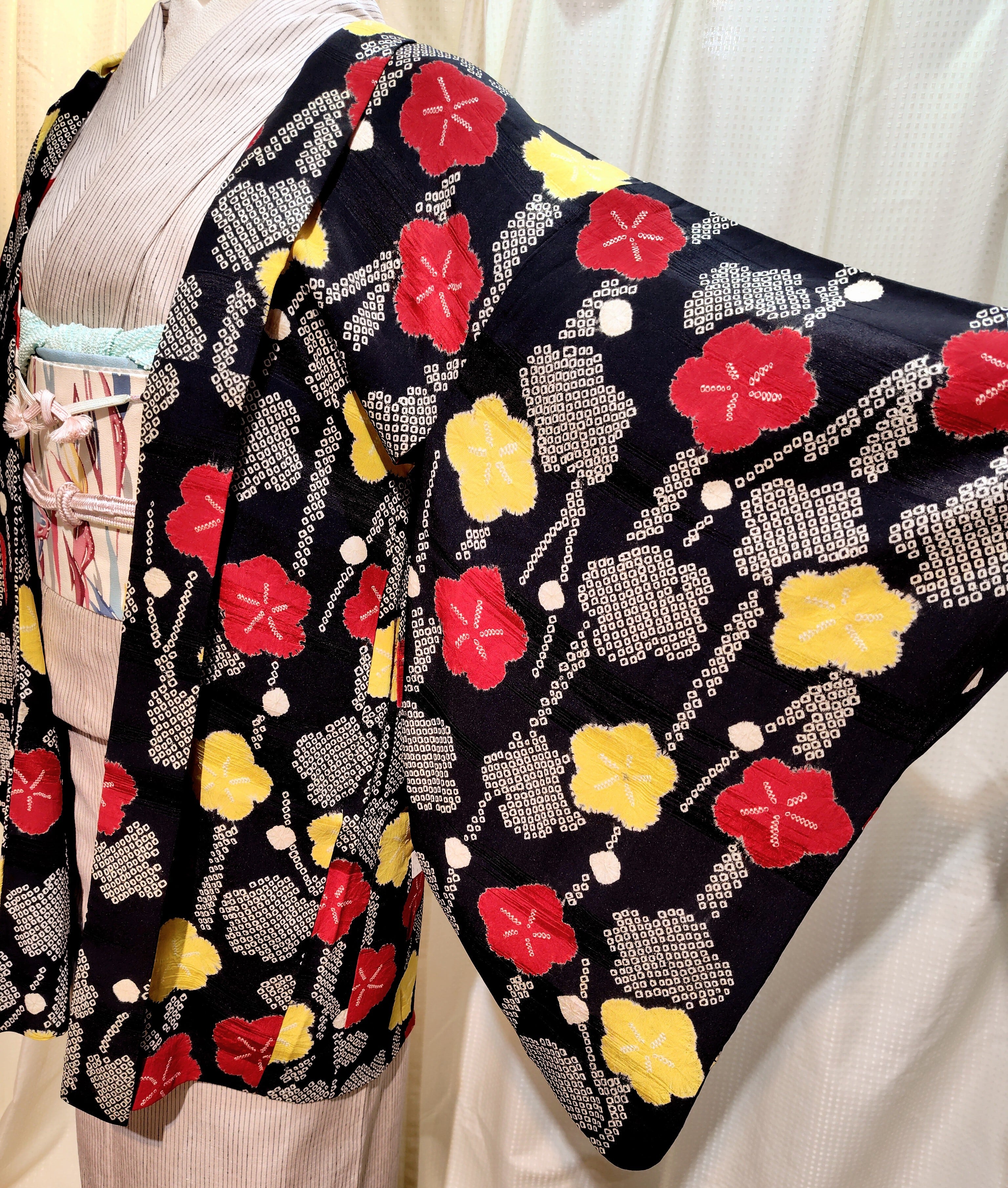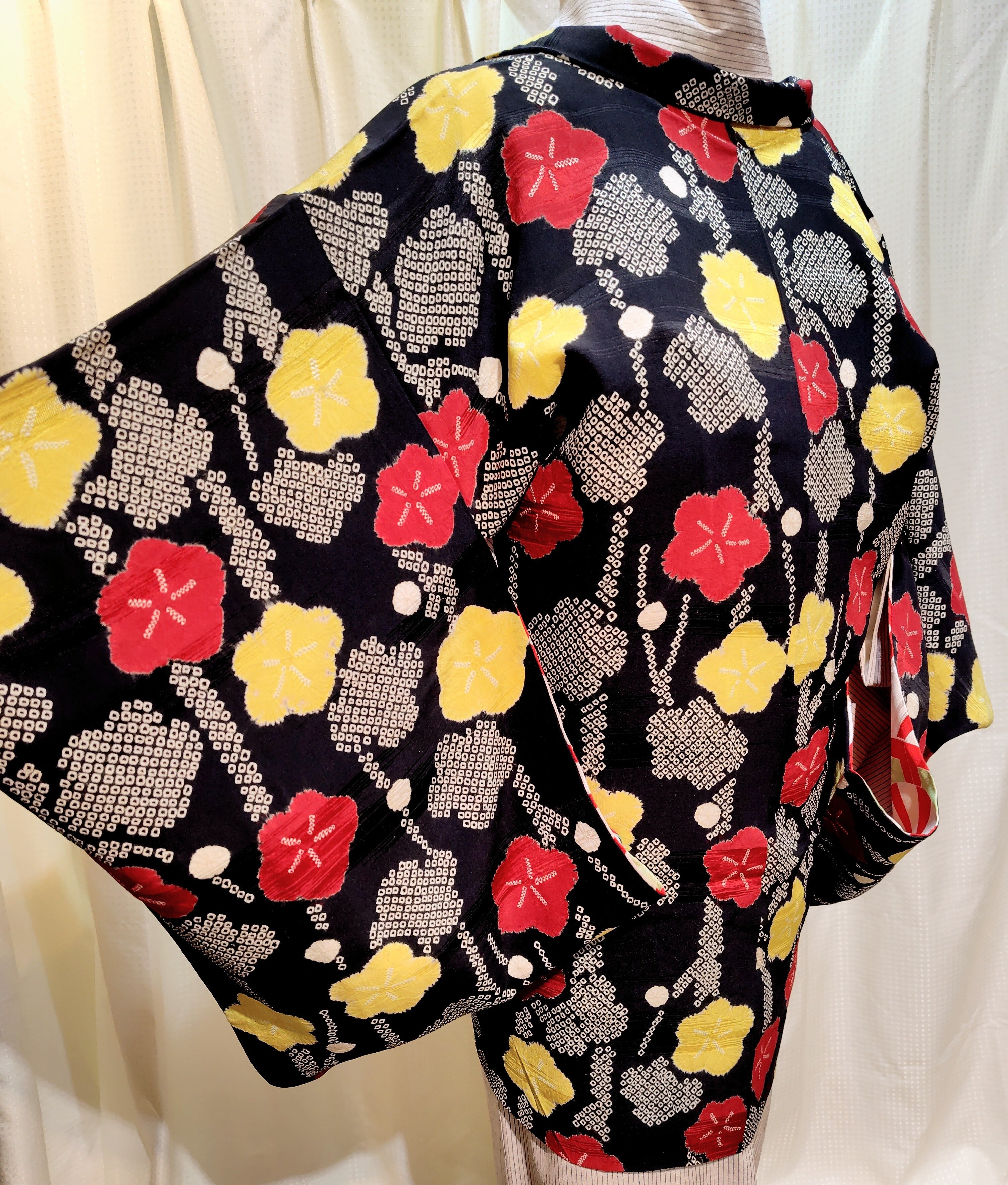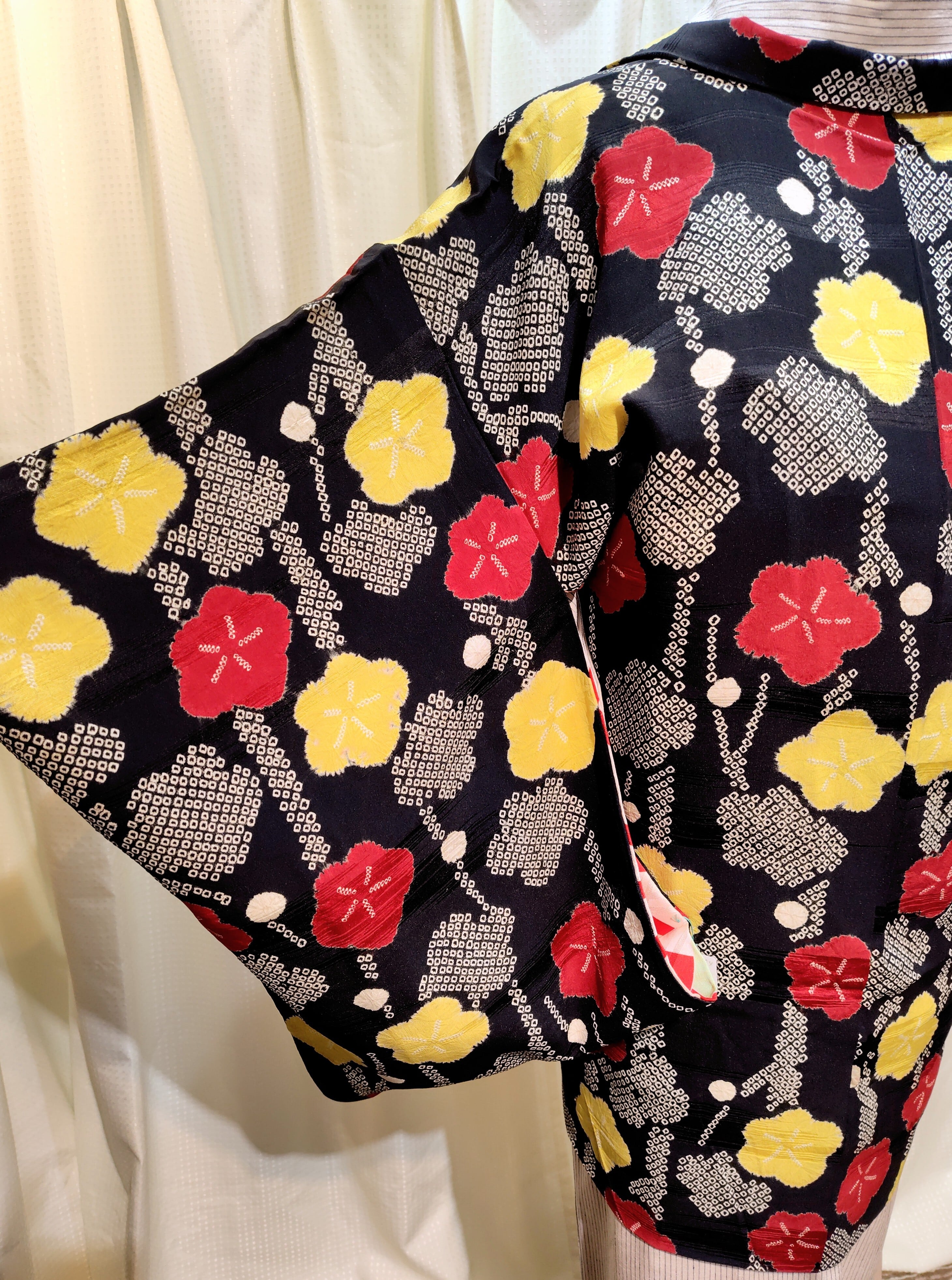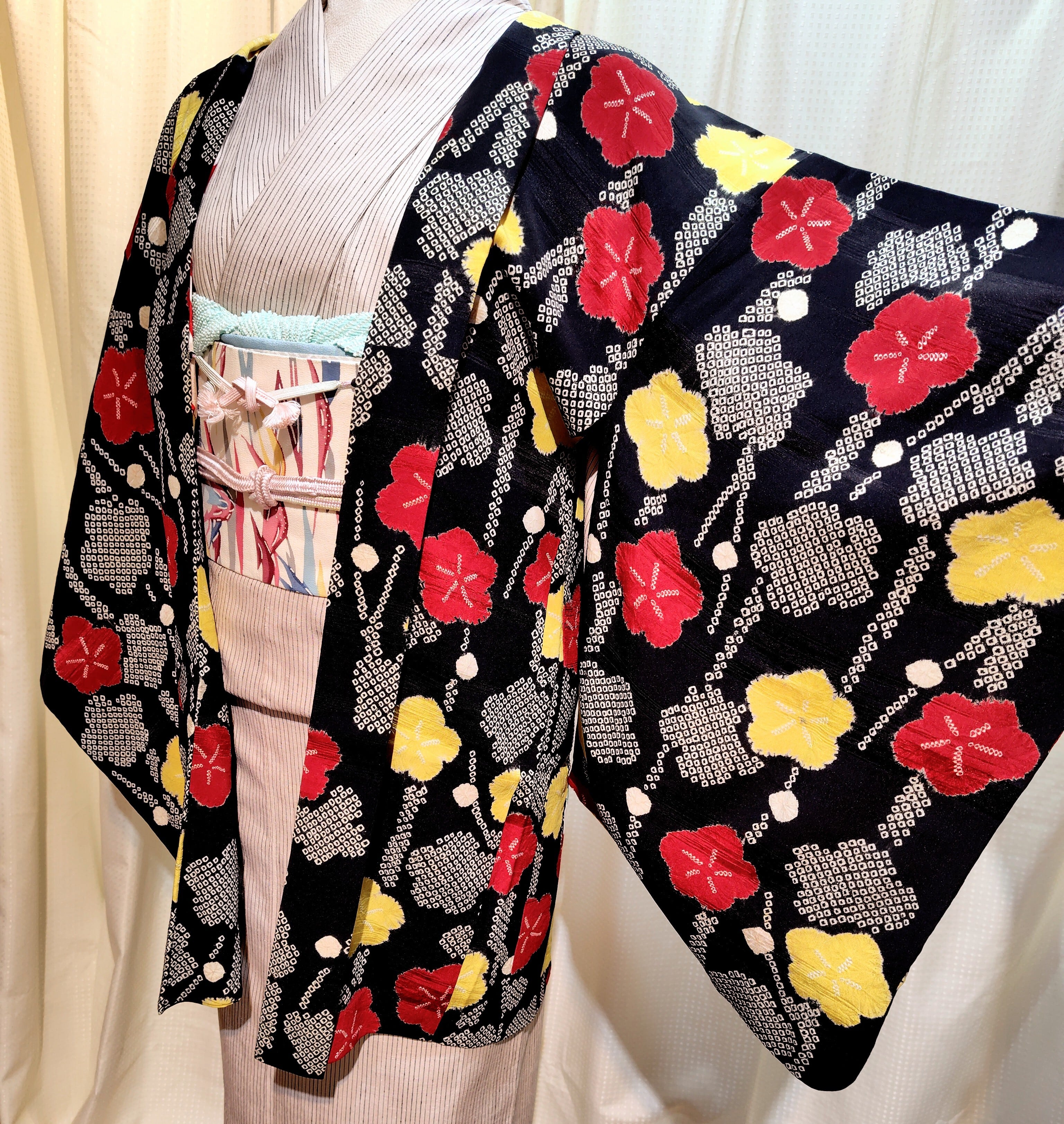 アンティーク 黒地に絞りの羽織り〜赤色、黄色、白色の梅柄〜