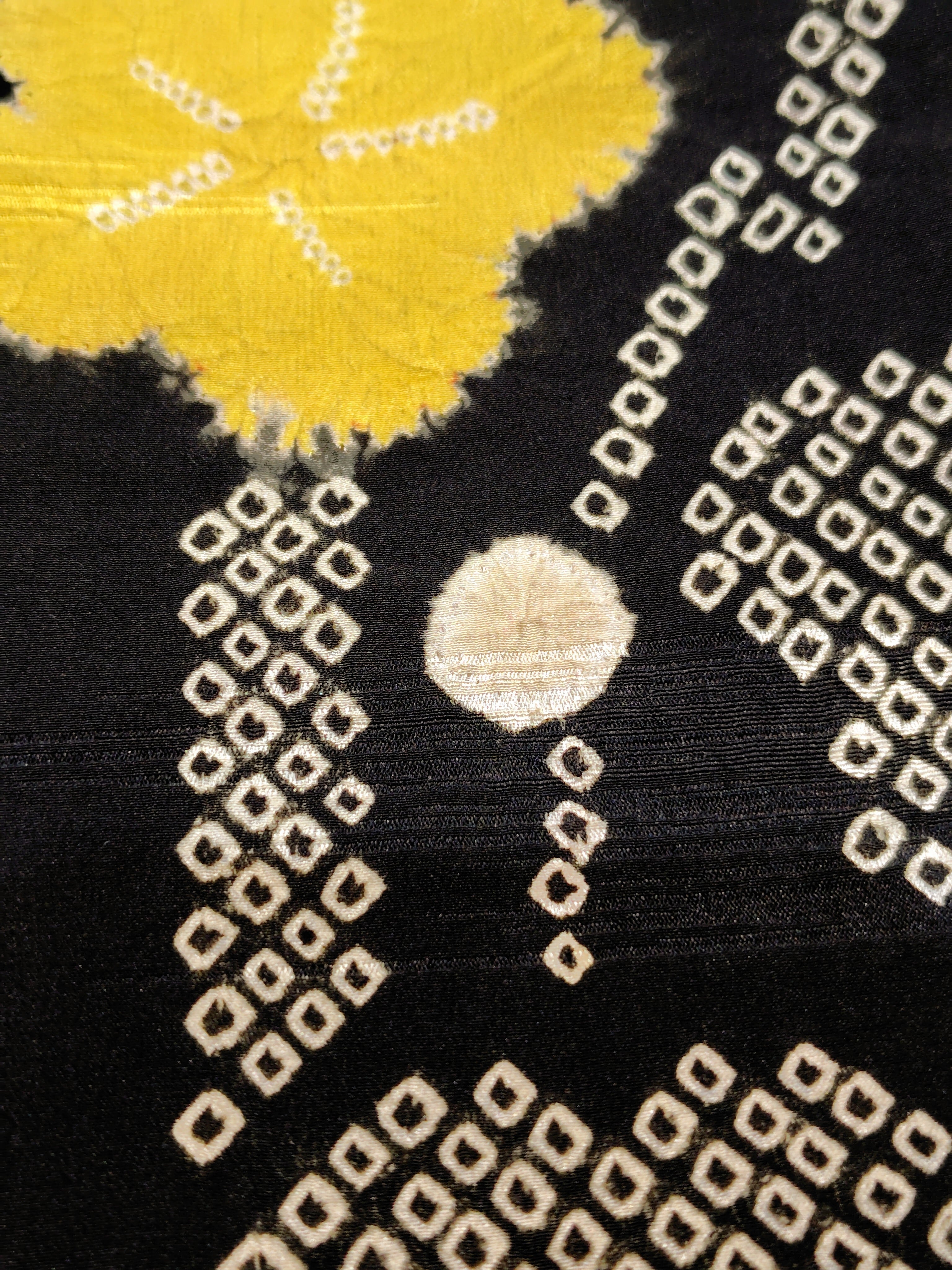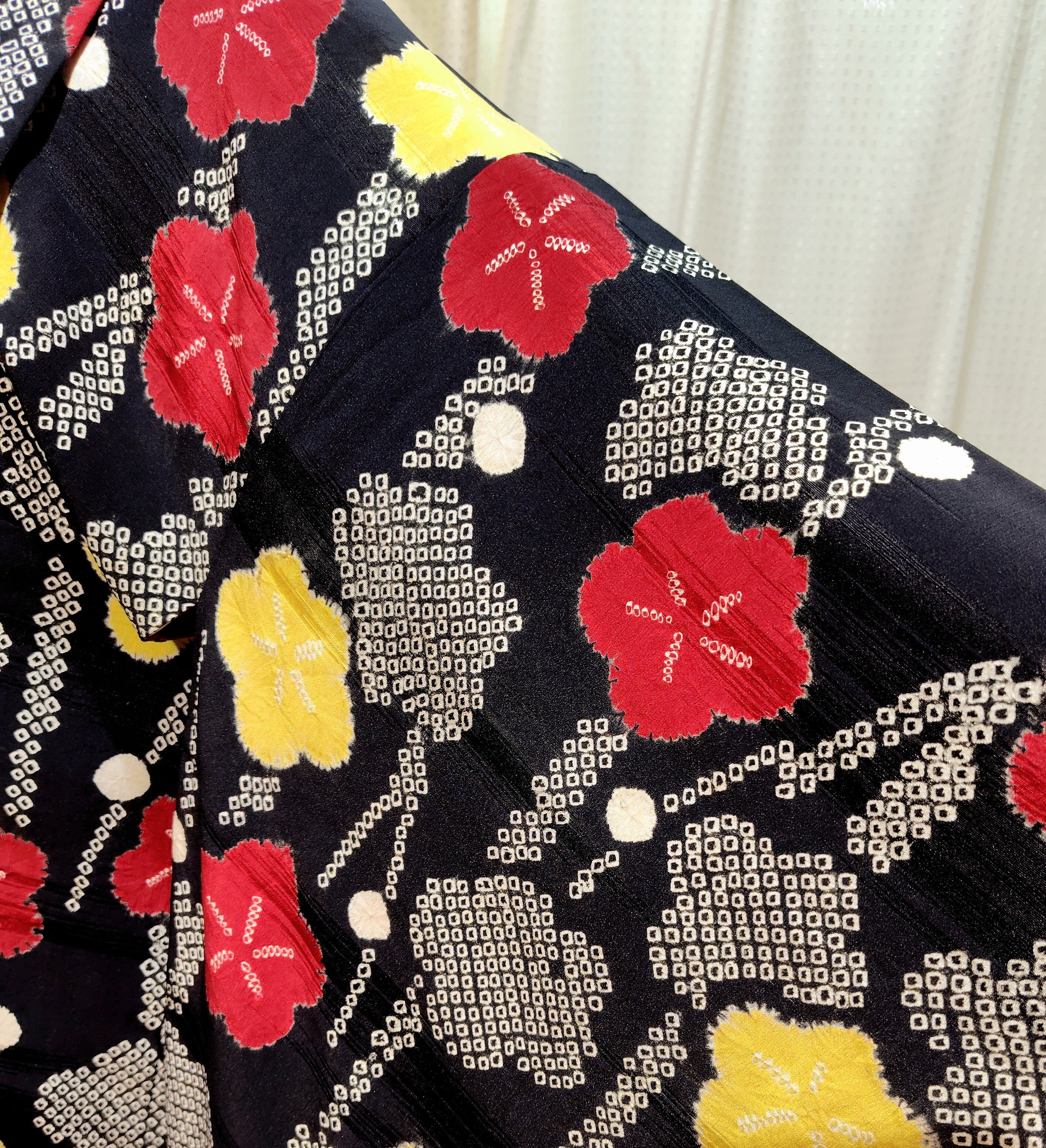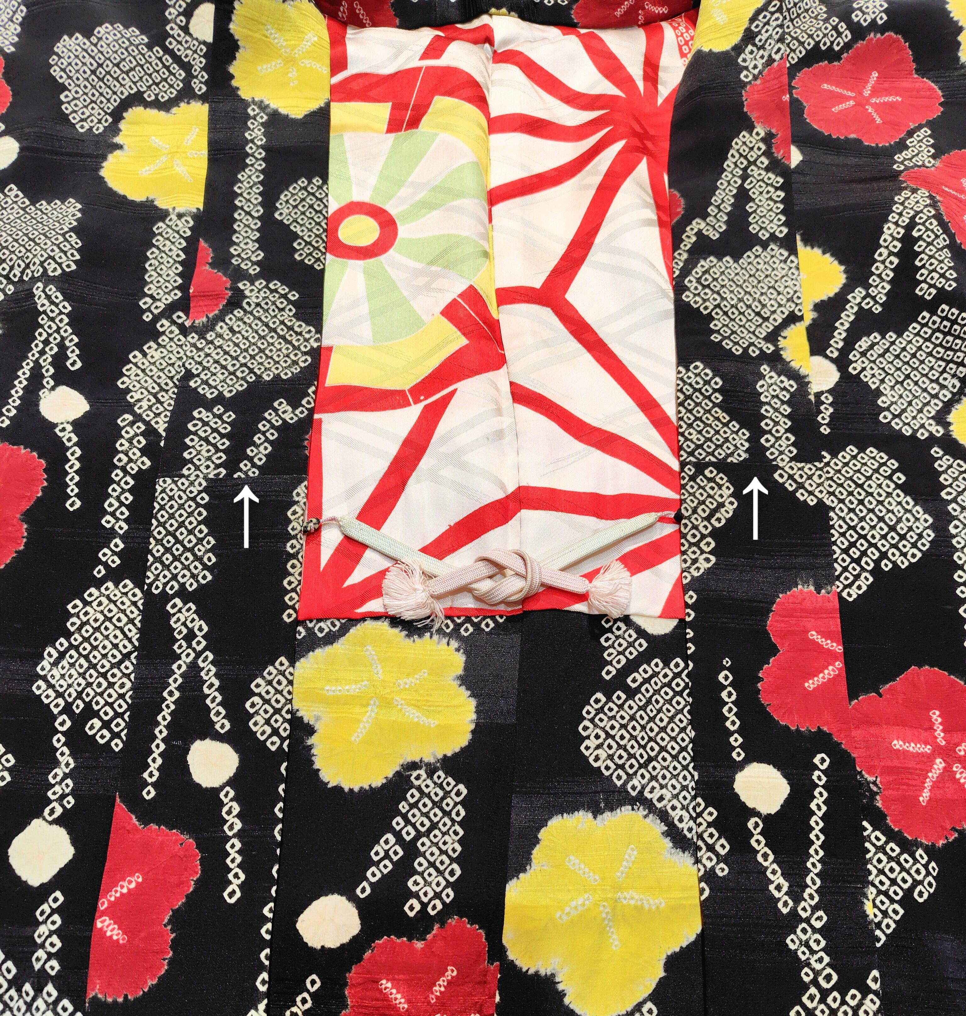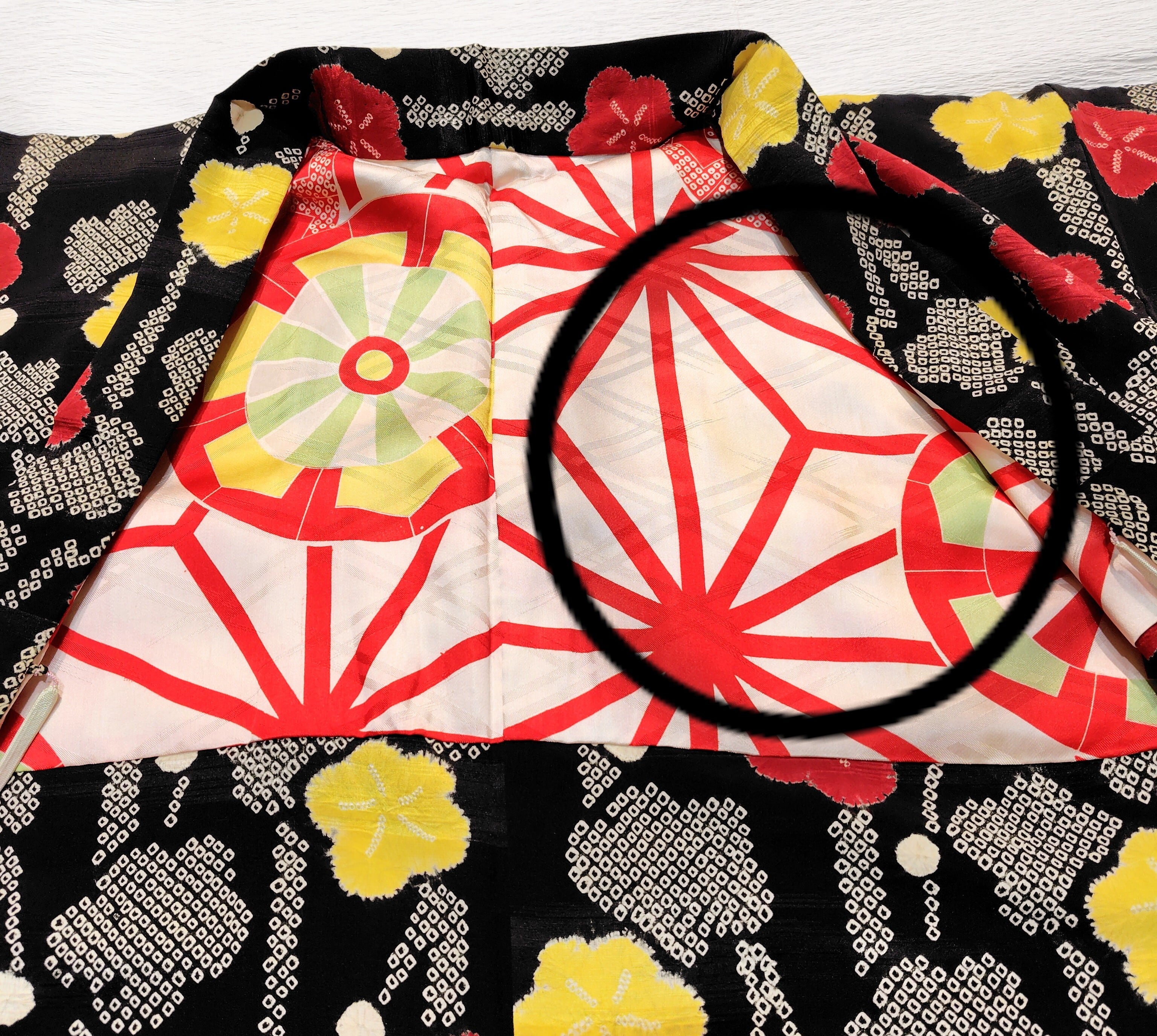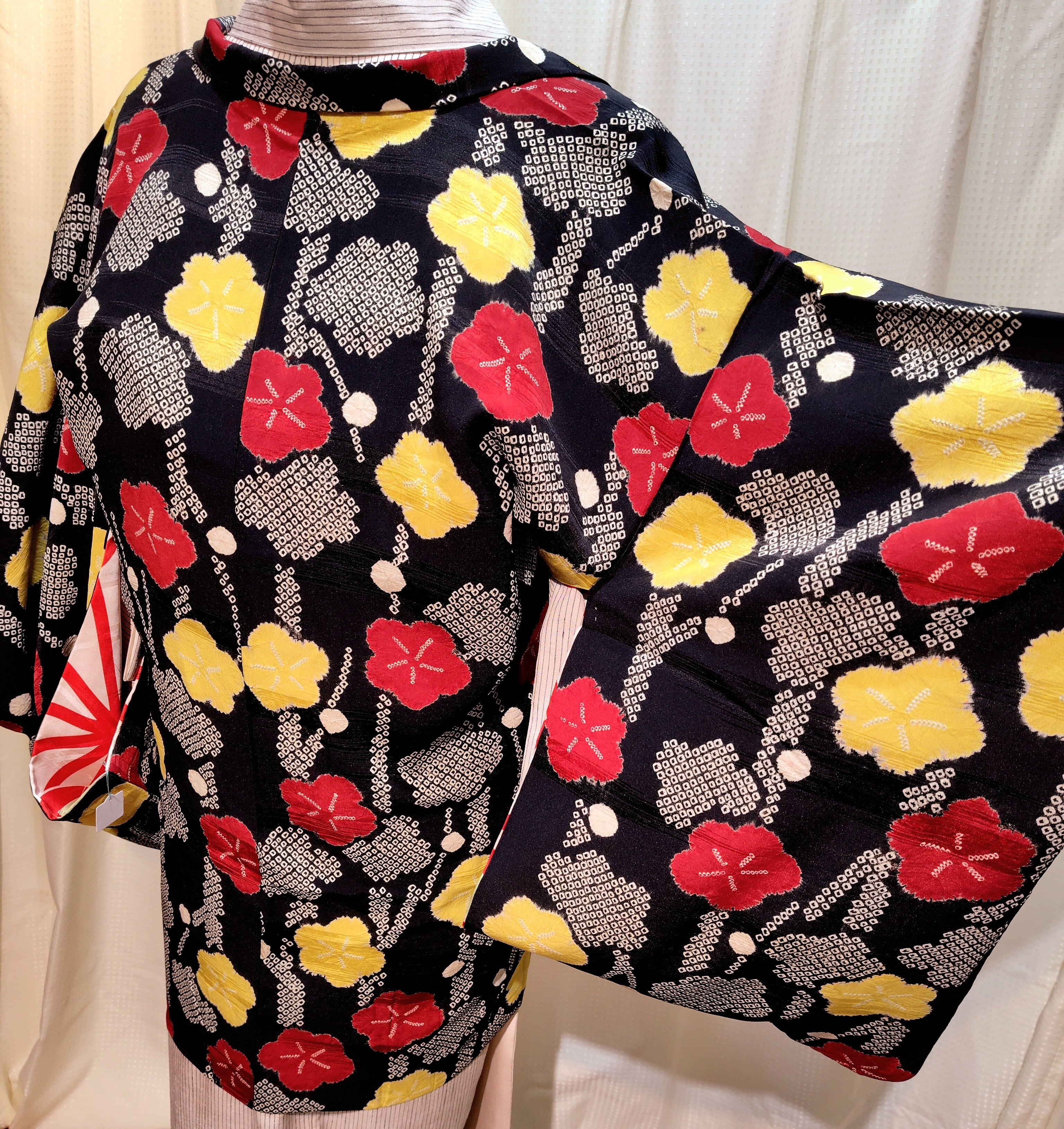 アンティーク 黒地に絞りの羽織り〜赤色、黄色、白色の梅柄〜