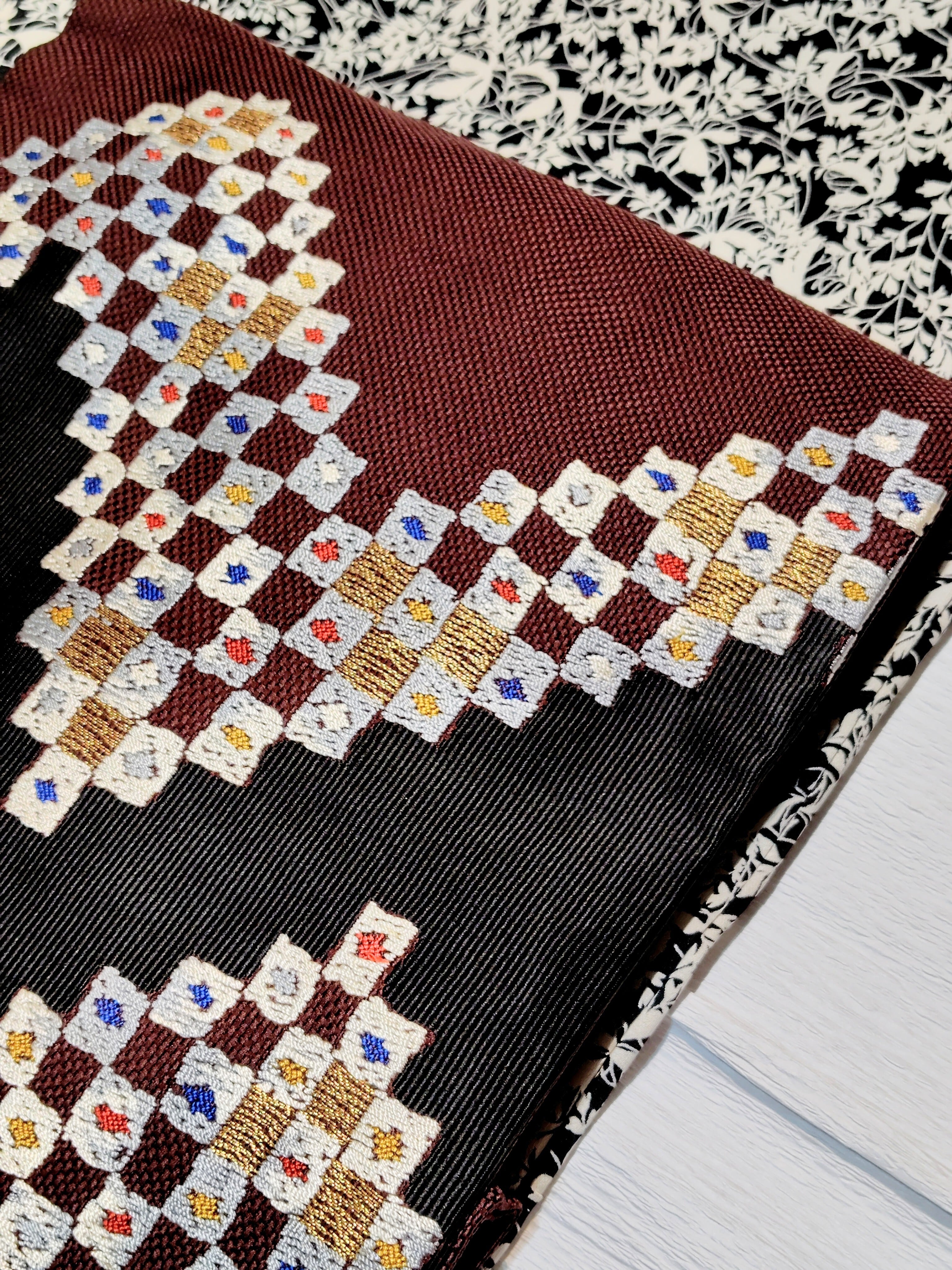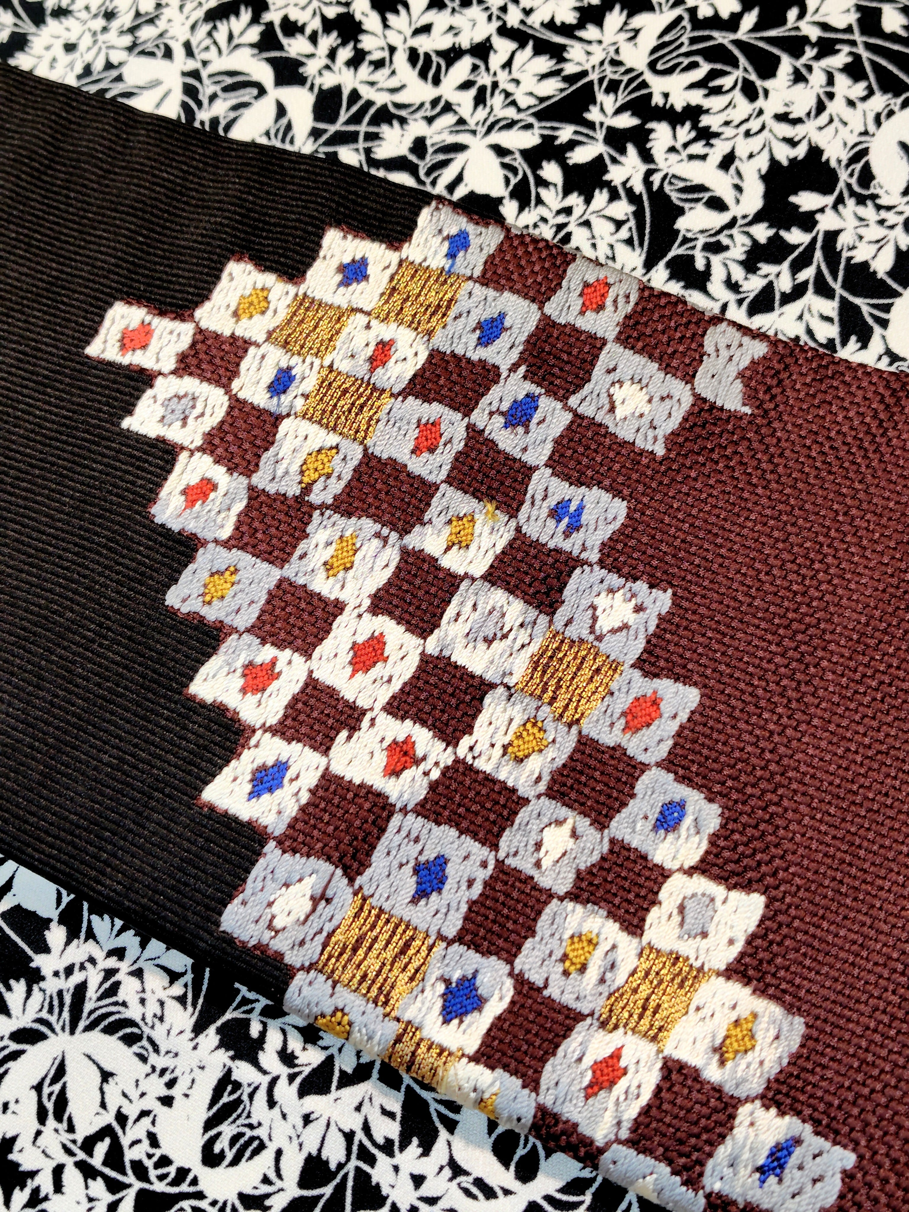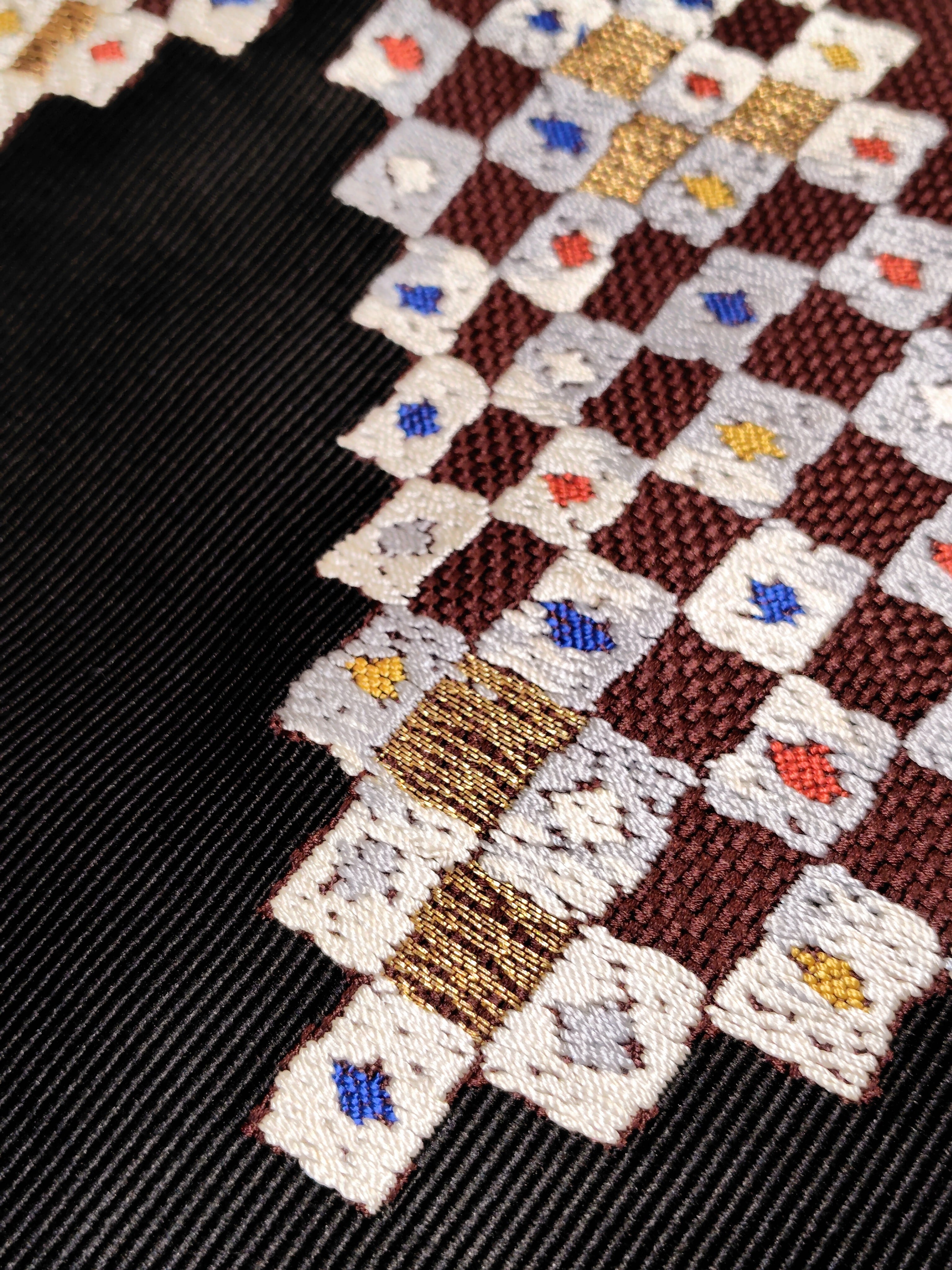 手刺繍を感じる、ふんわりとした織りでトランプカードを思わせる四角形が並び、チェス盤にもみえます。