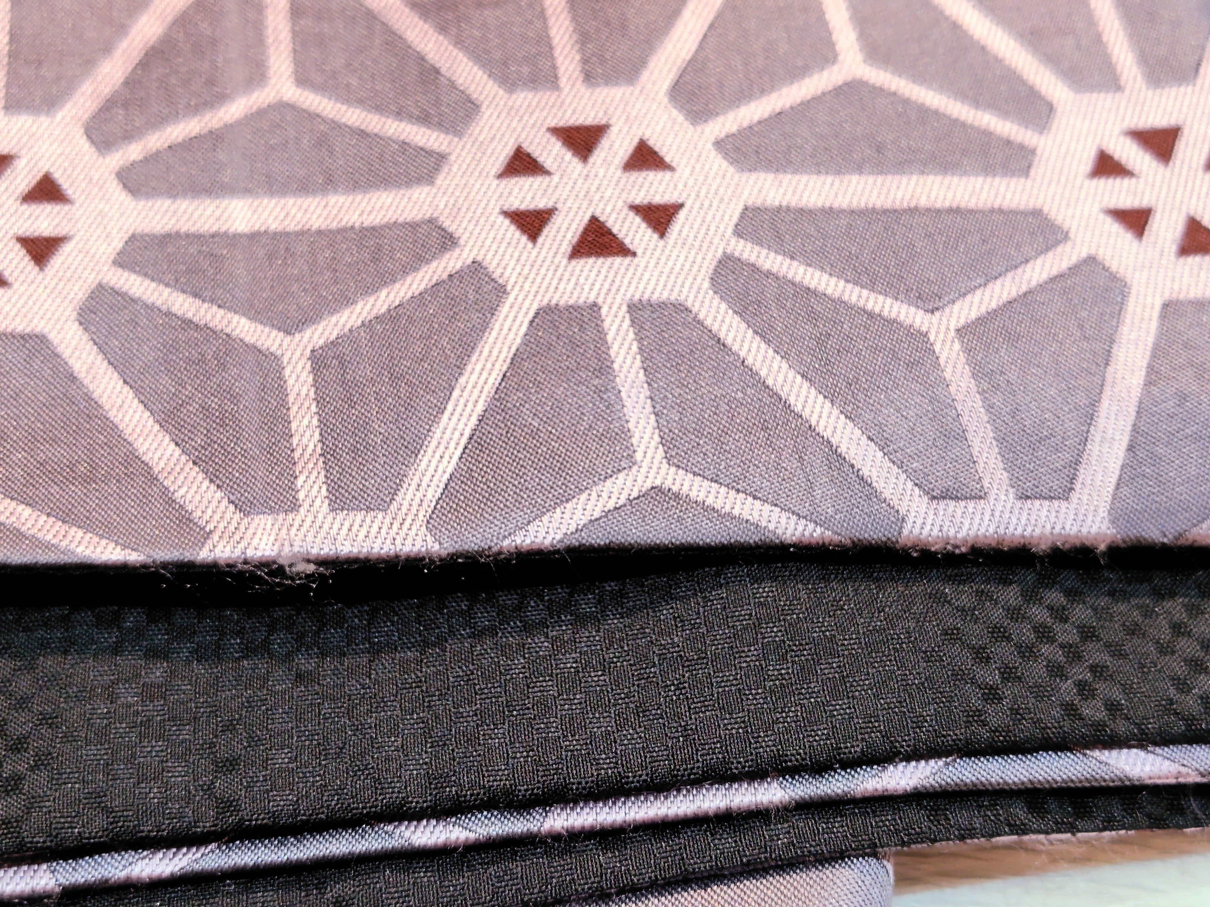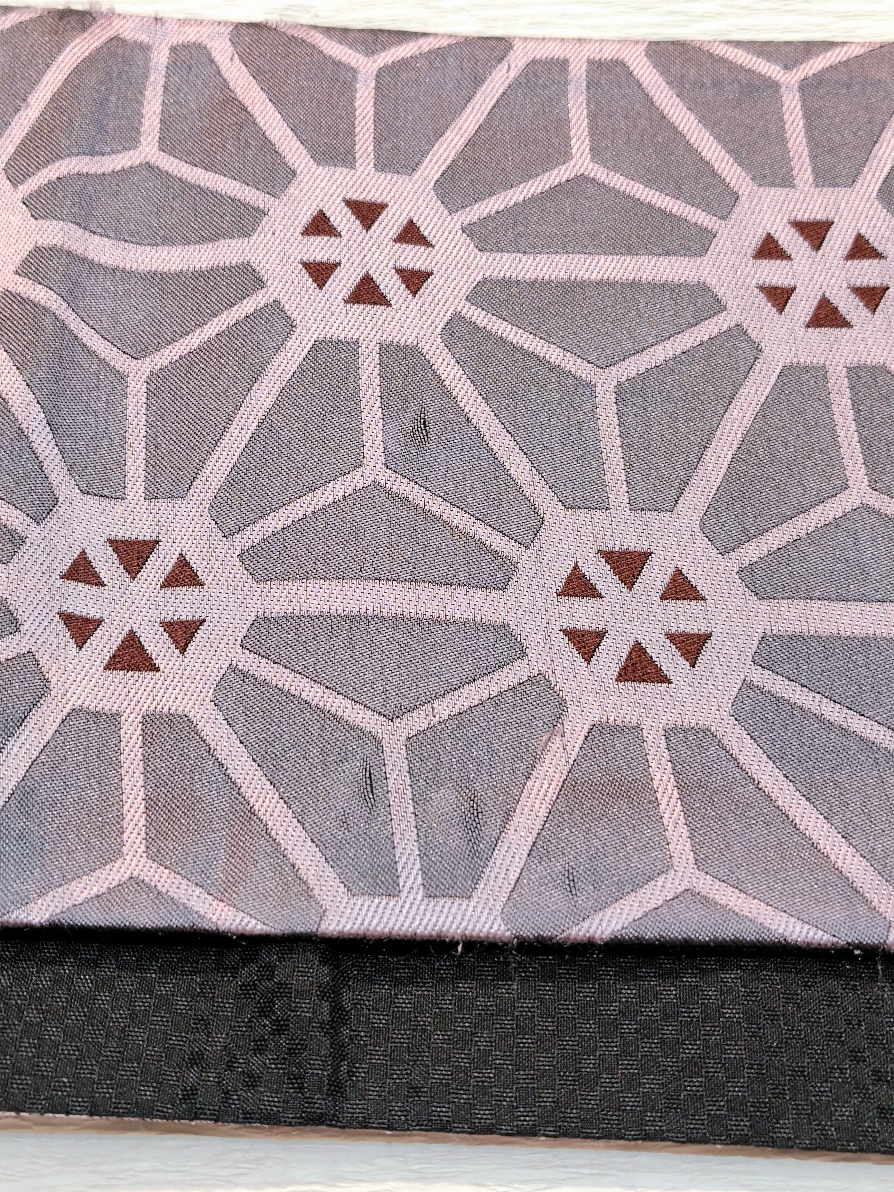 淡く薄い色の組み合わせ、淡いグレー色、淡い薄紫色、焦げ茶色で麻の葉柄。