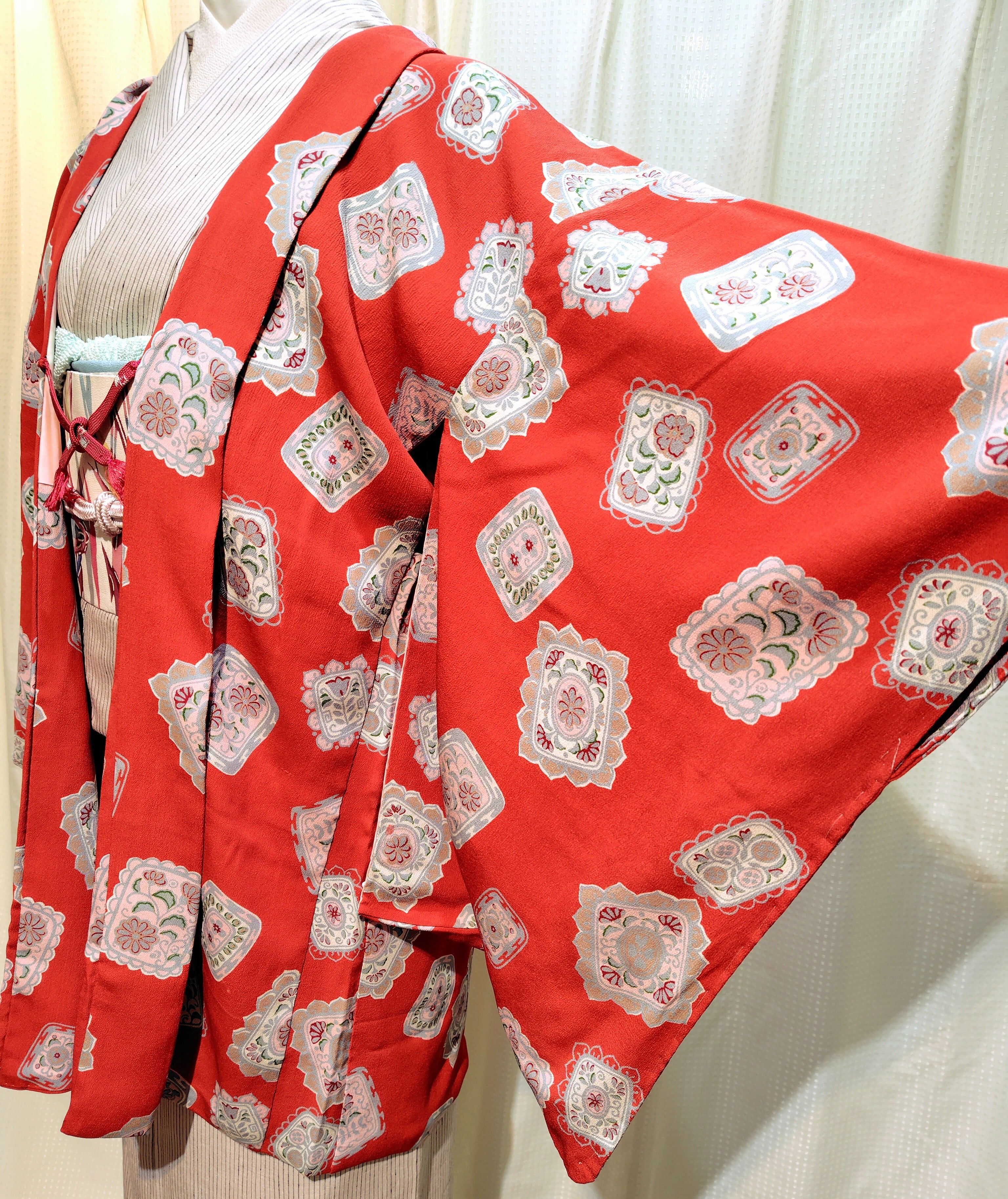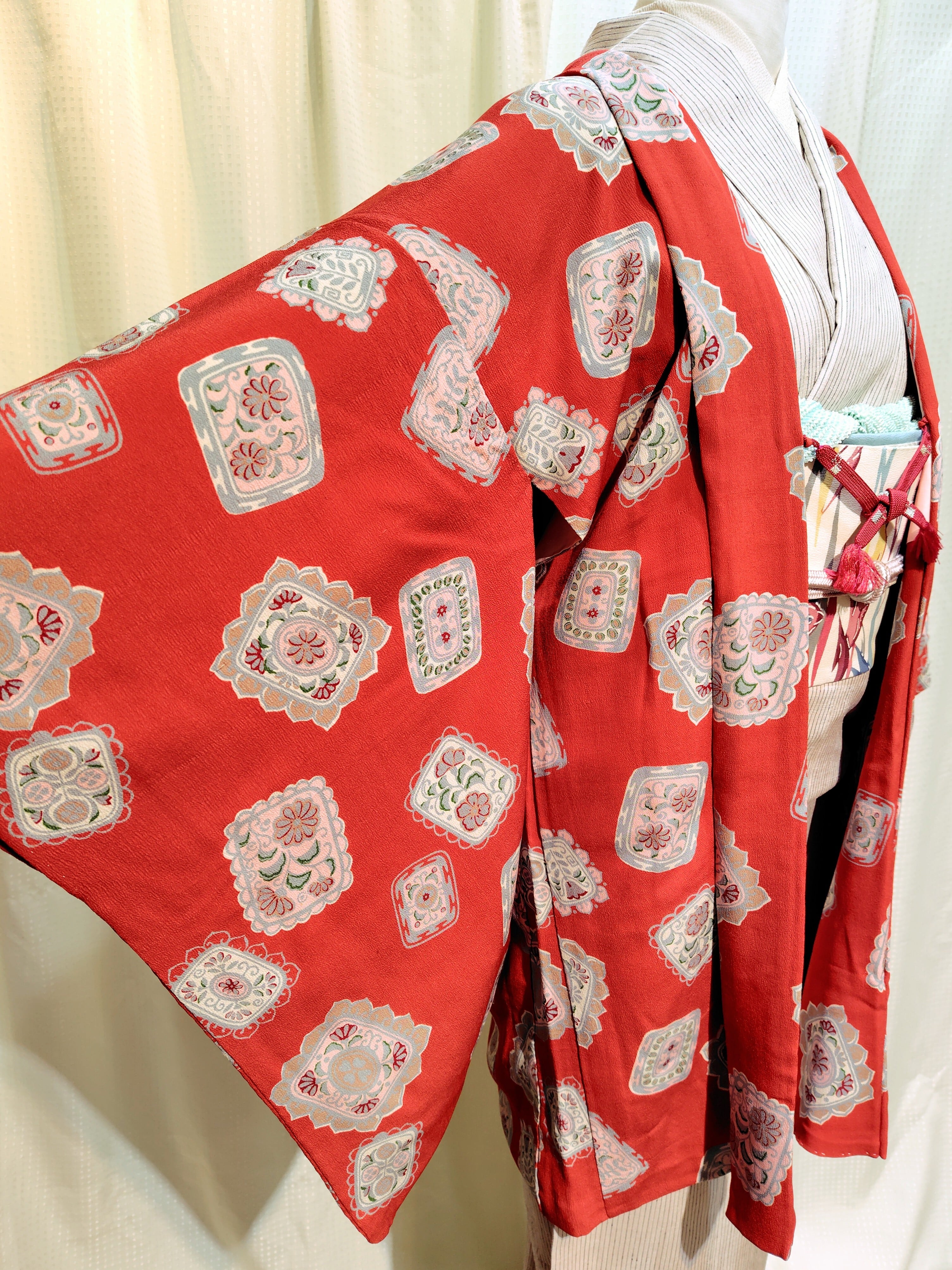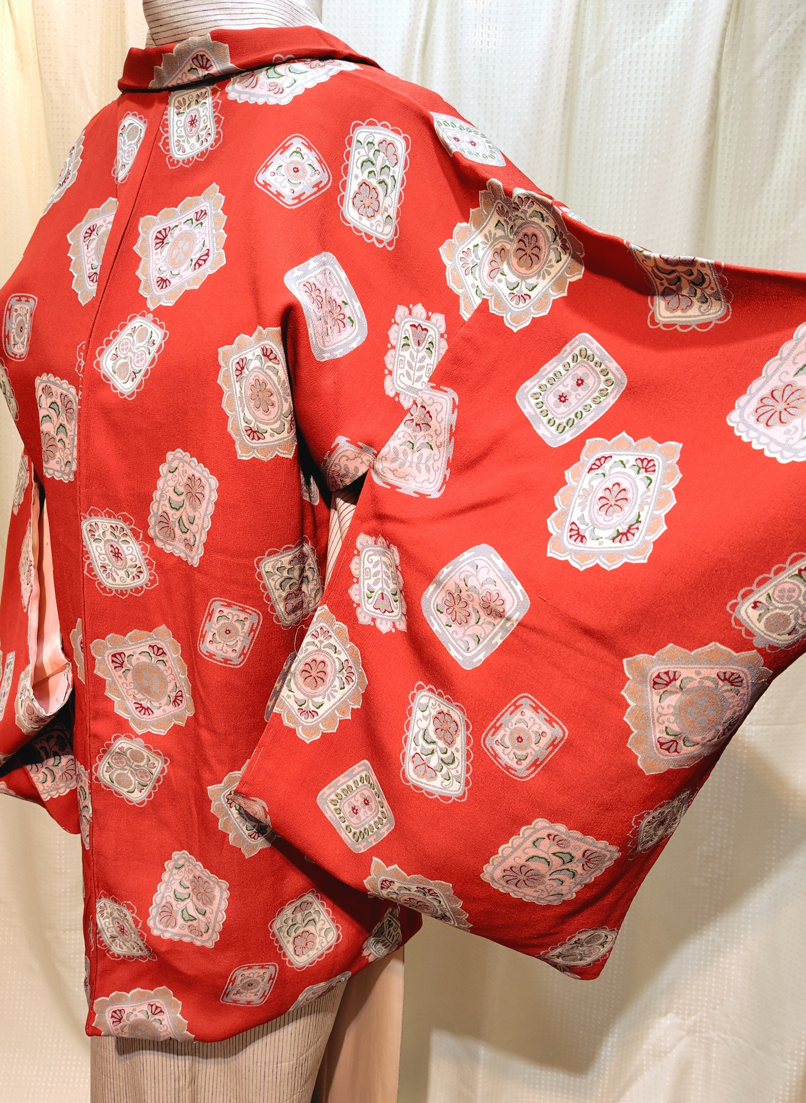 アンティーク長羽織〜朱色に西洋的なモチーフ柄〜
