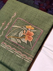 ざっくりとした紬地にスワトウ刺繍の名古屋帯です。