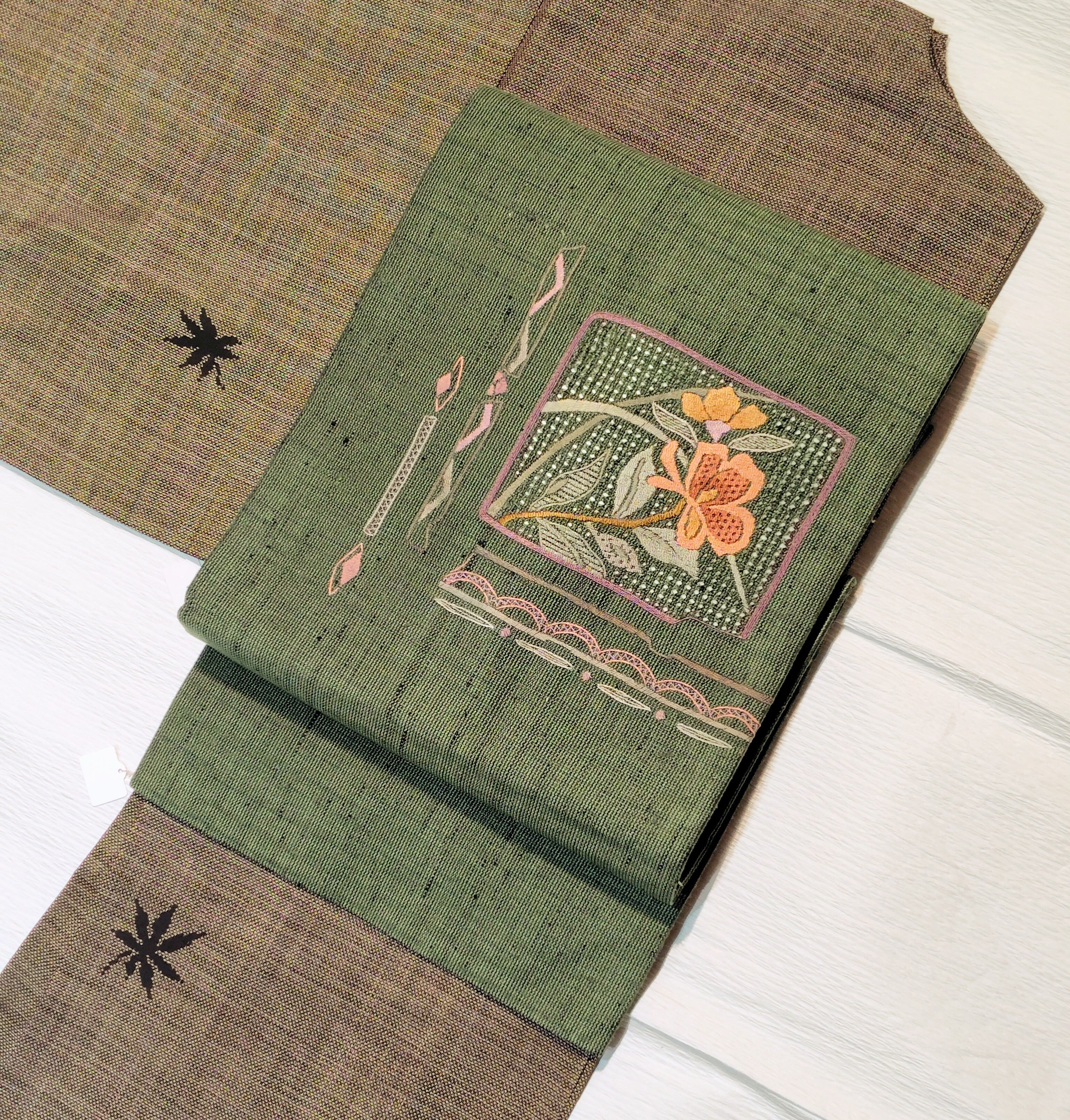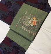 深い緑色の帯は珍しく、中でも刺繍は更にレアなお品物◎