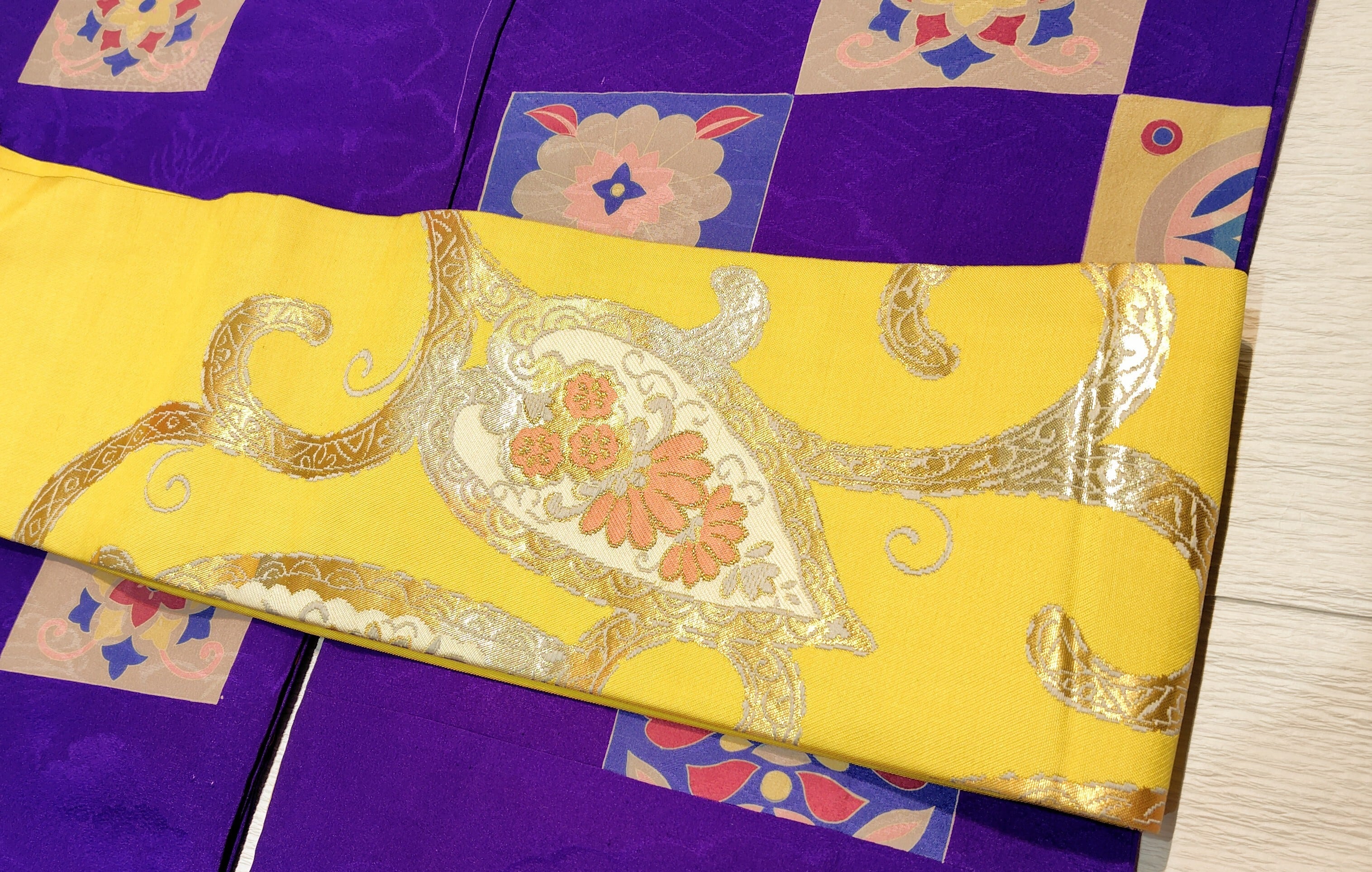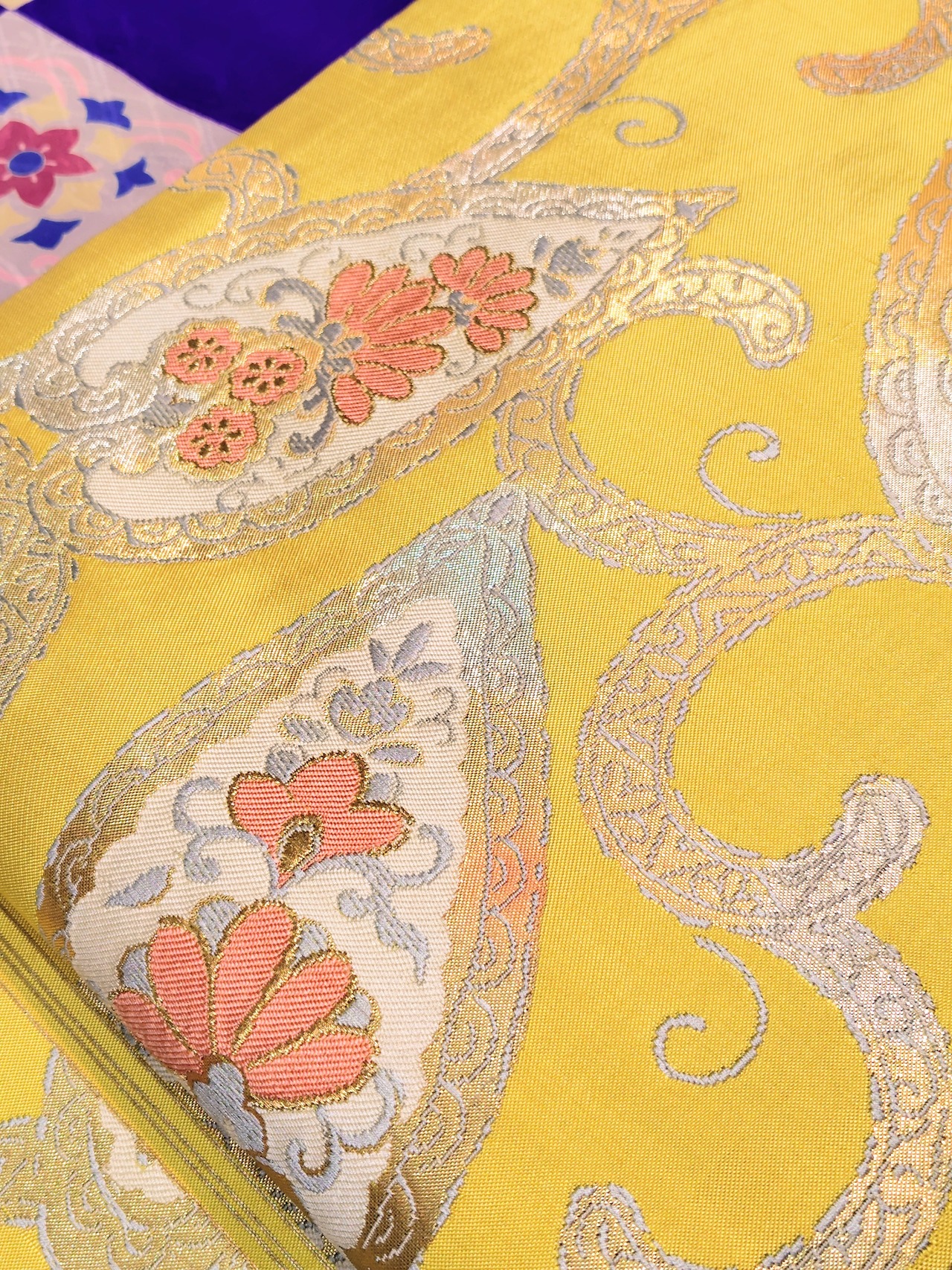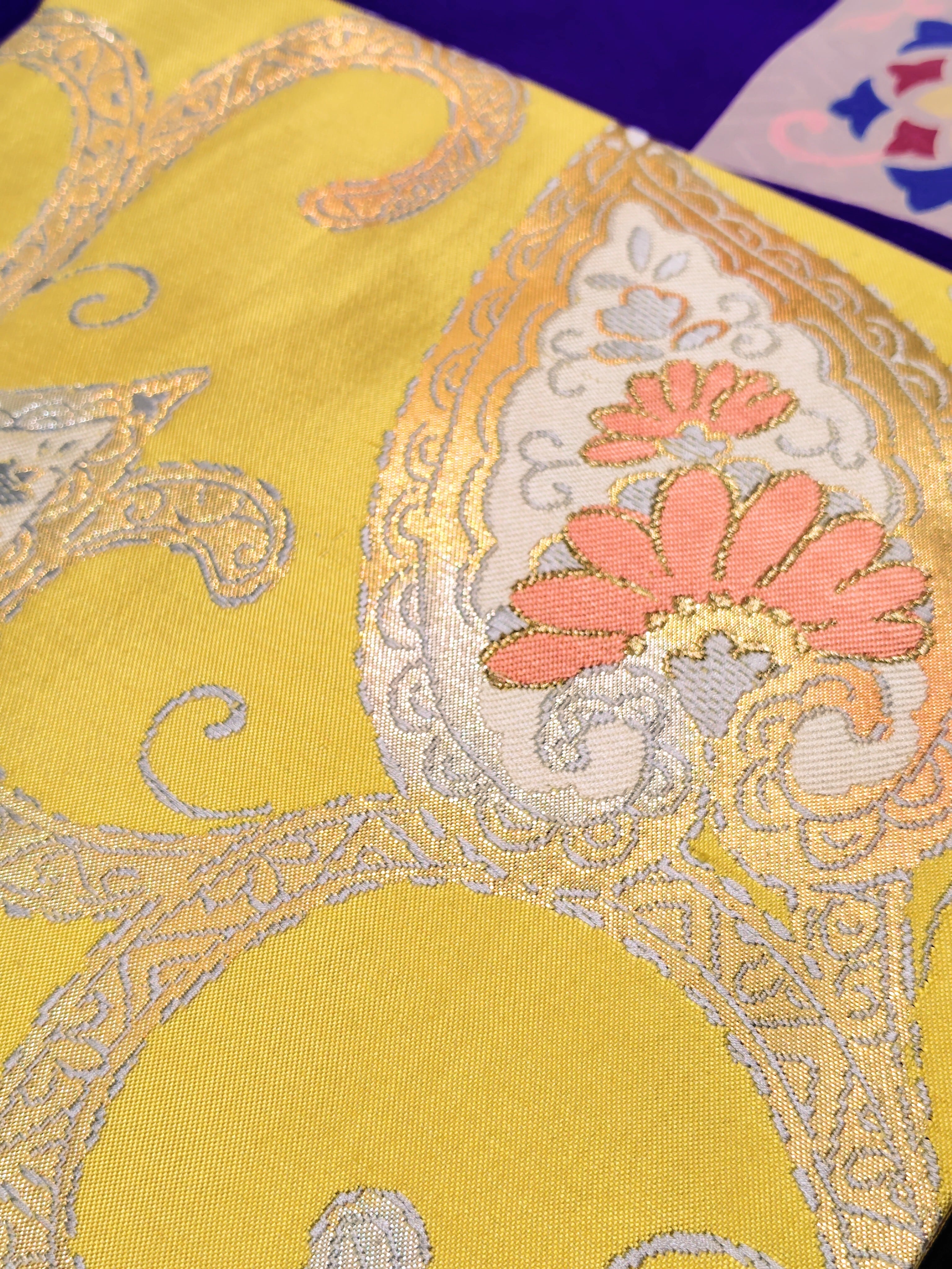 檸檬のような綺麗な黄色地に金糸、グレー色、白色、淡いサーモンピンク色で草花が入ったペイズリー柄。