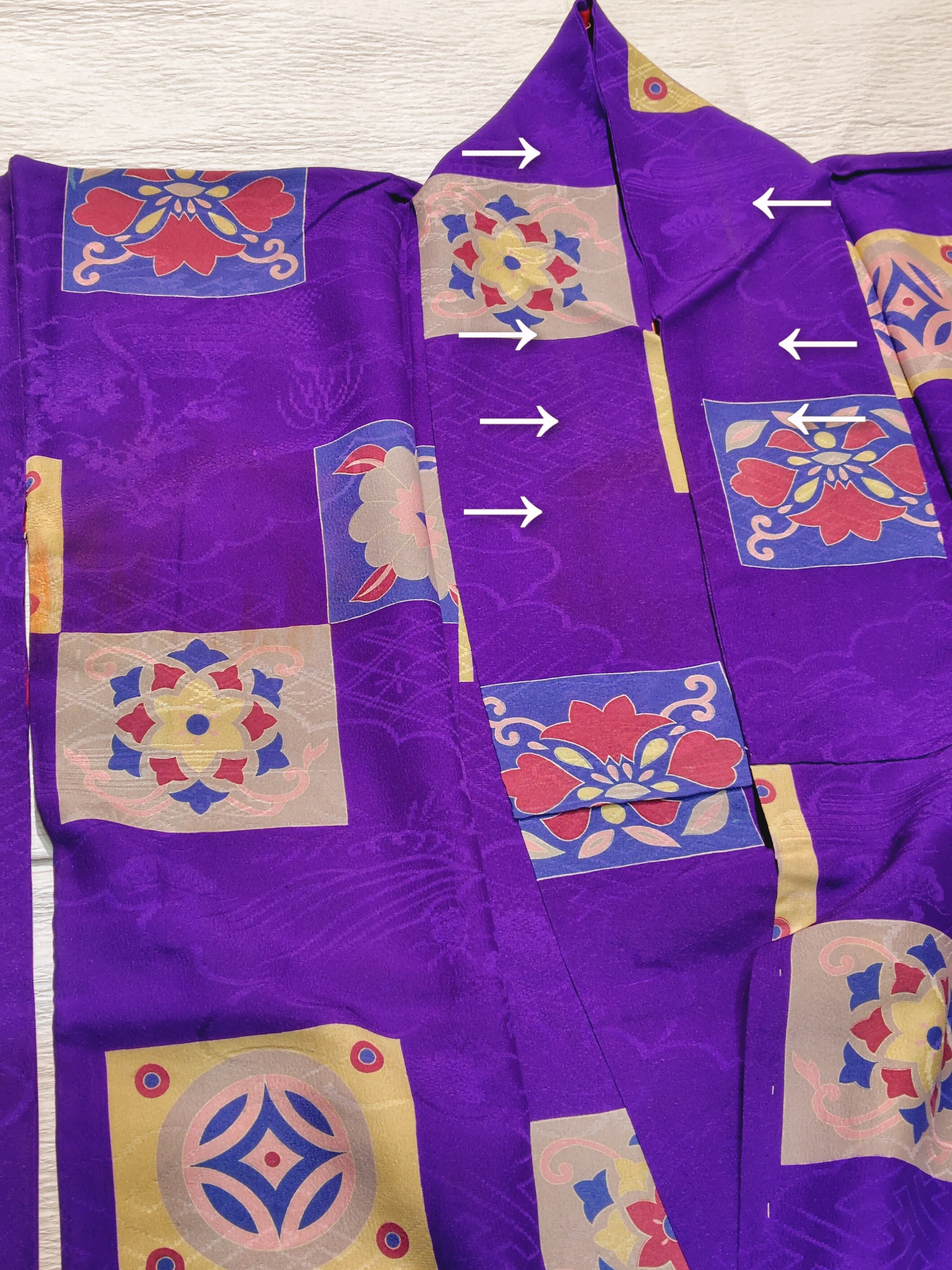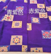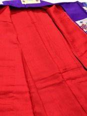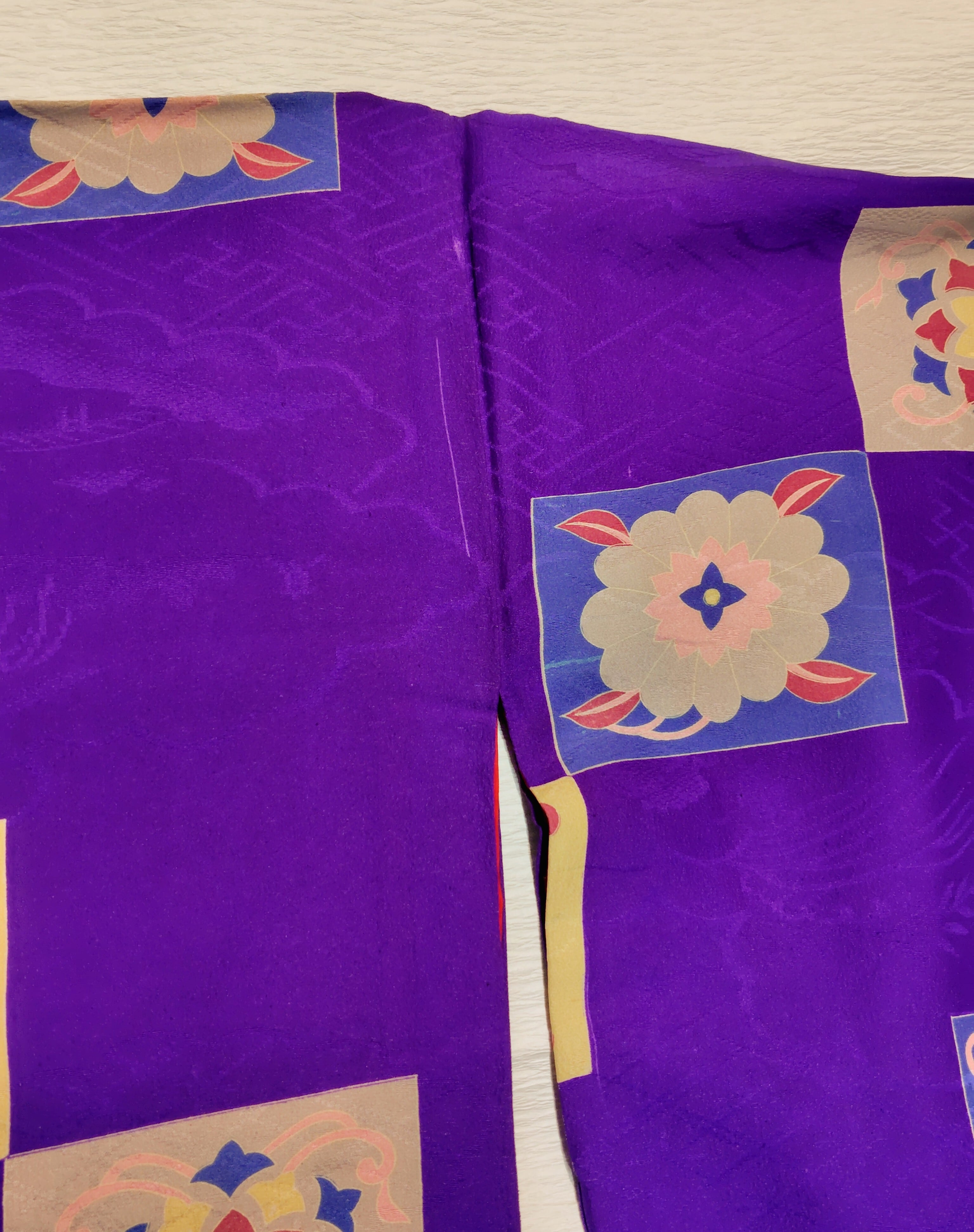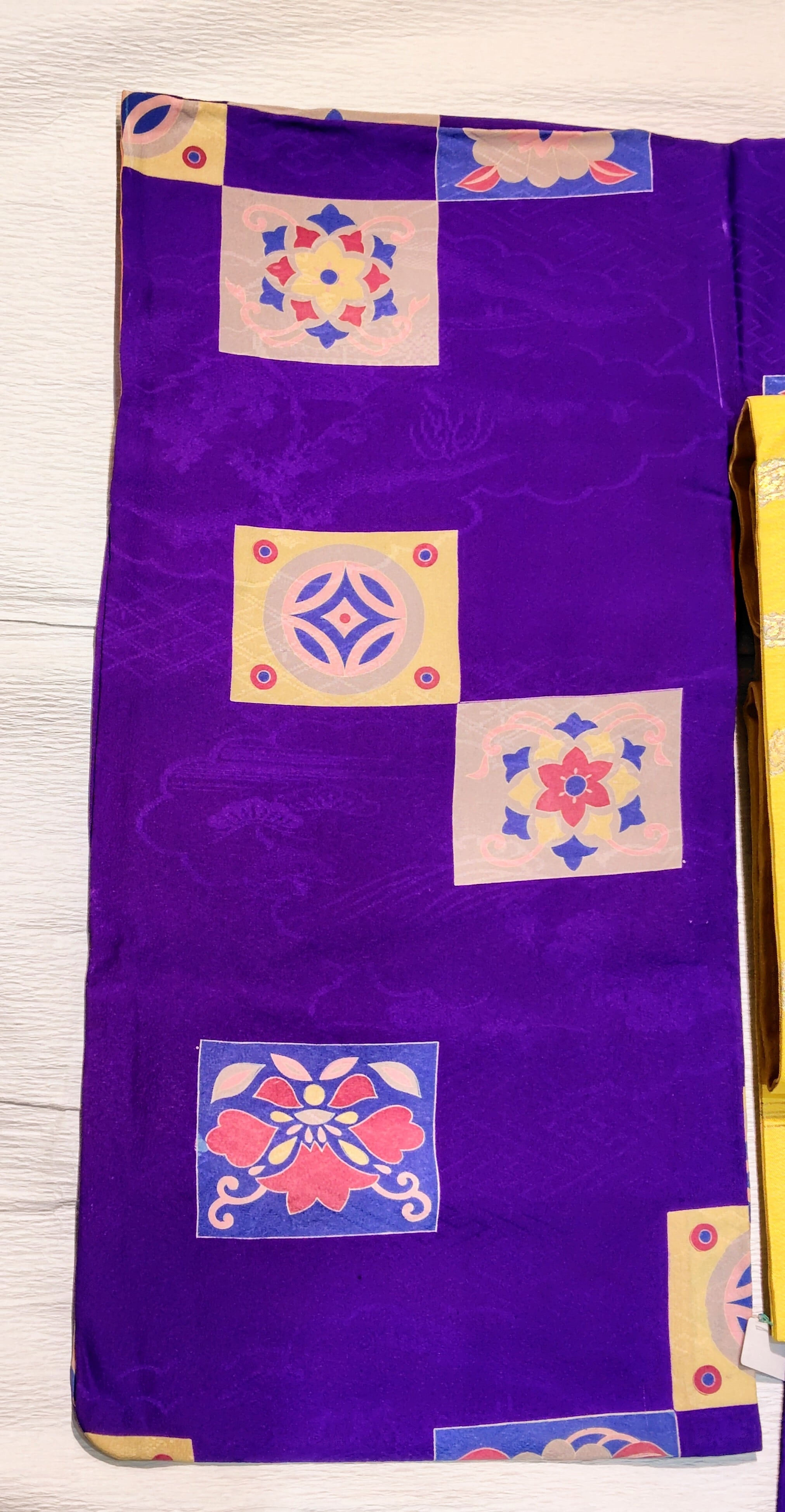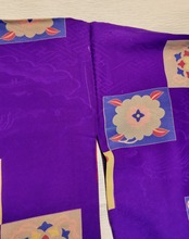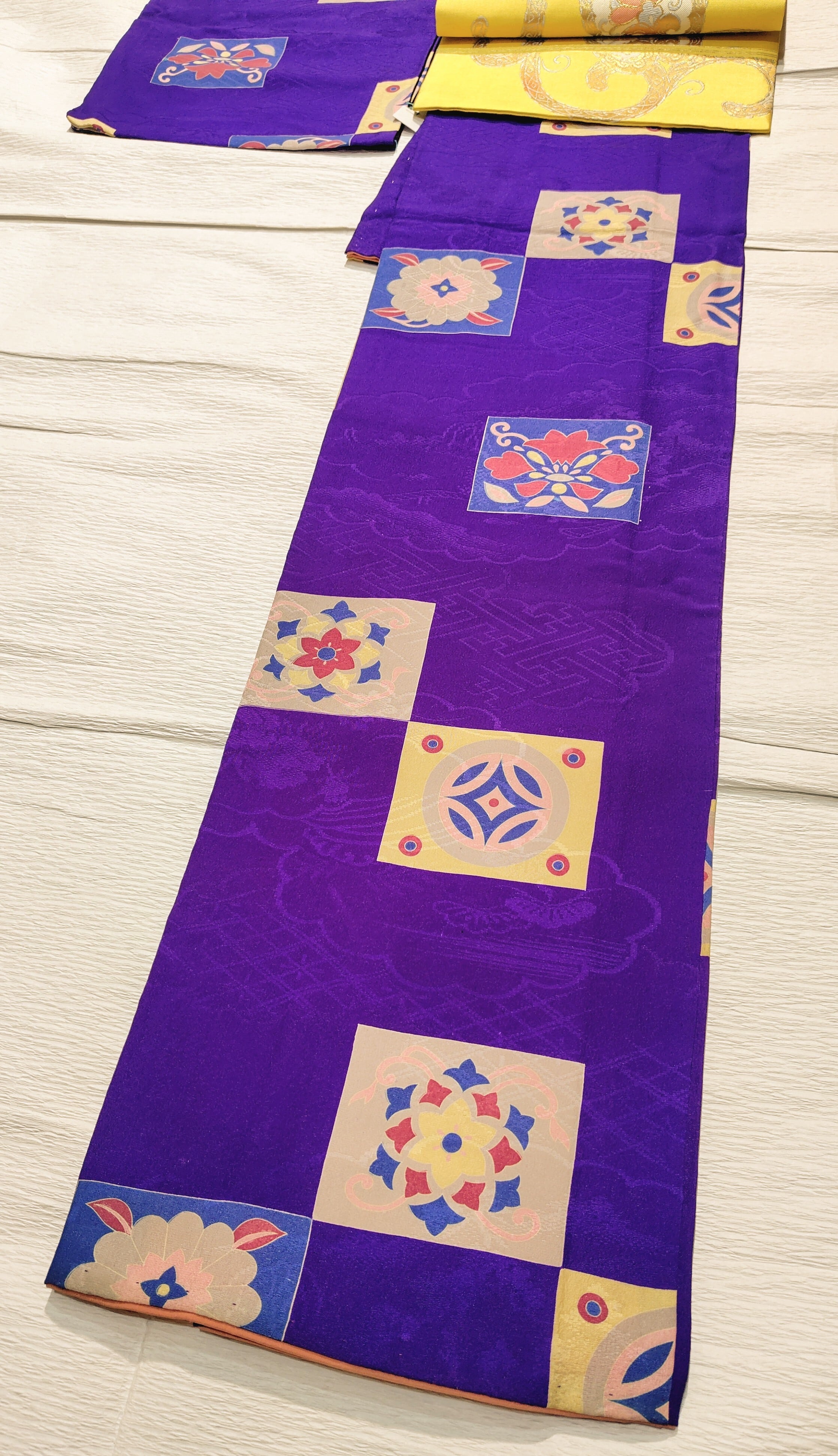 紫色の地に、クリーム色、青色、グレー色の四角形の中に架空のお花と七宝の古典柄。