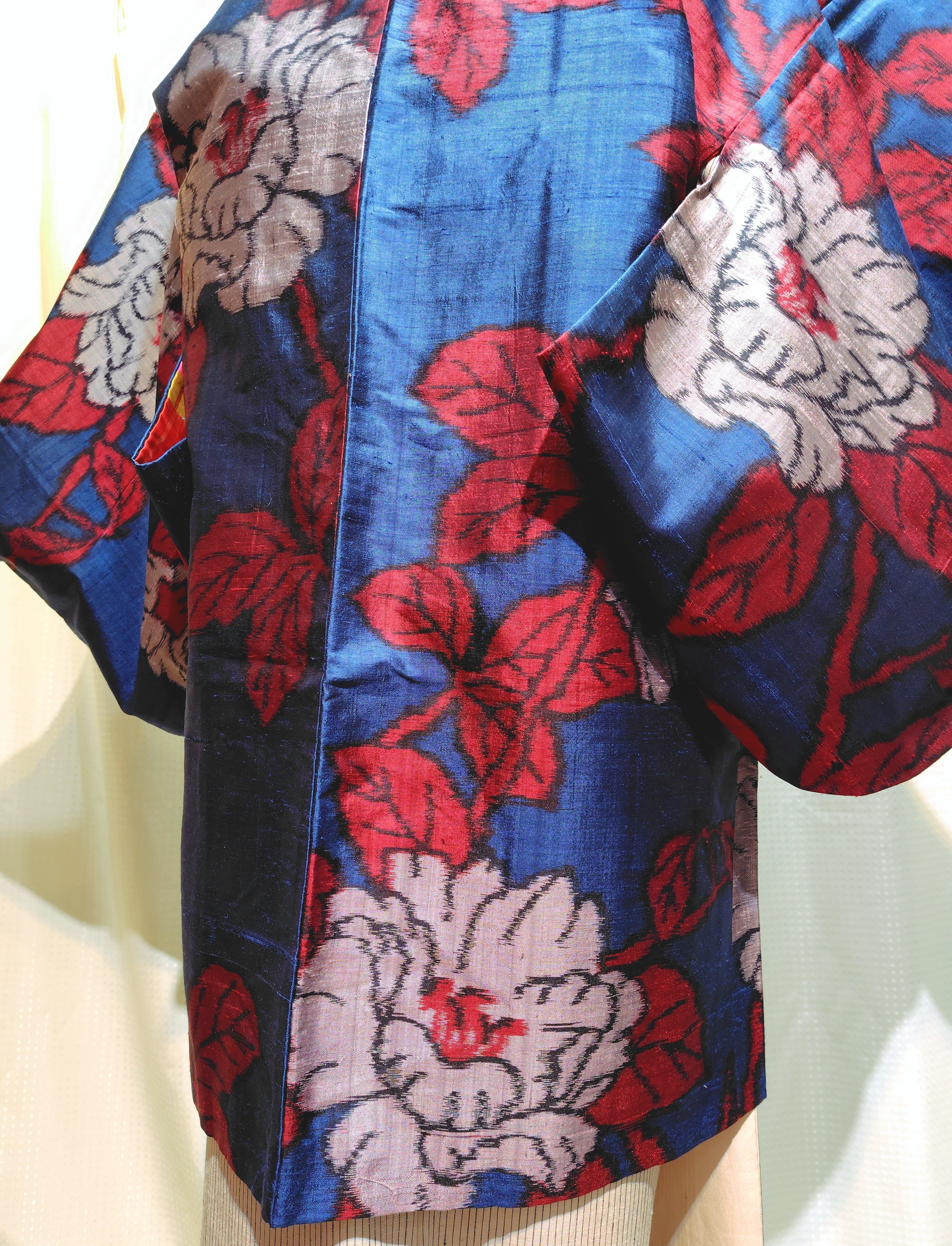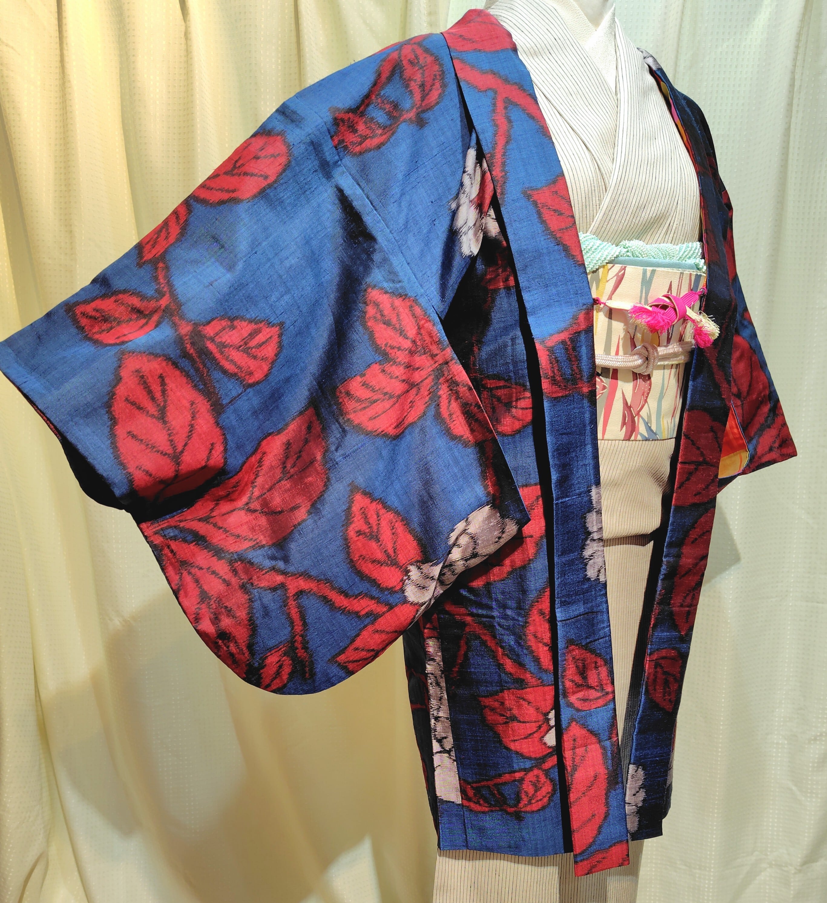 アンティークの銘仙の長羽織〜珍しい青地に大輪のお花柄〜