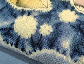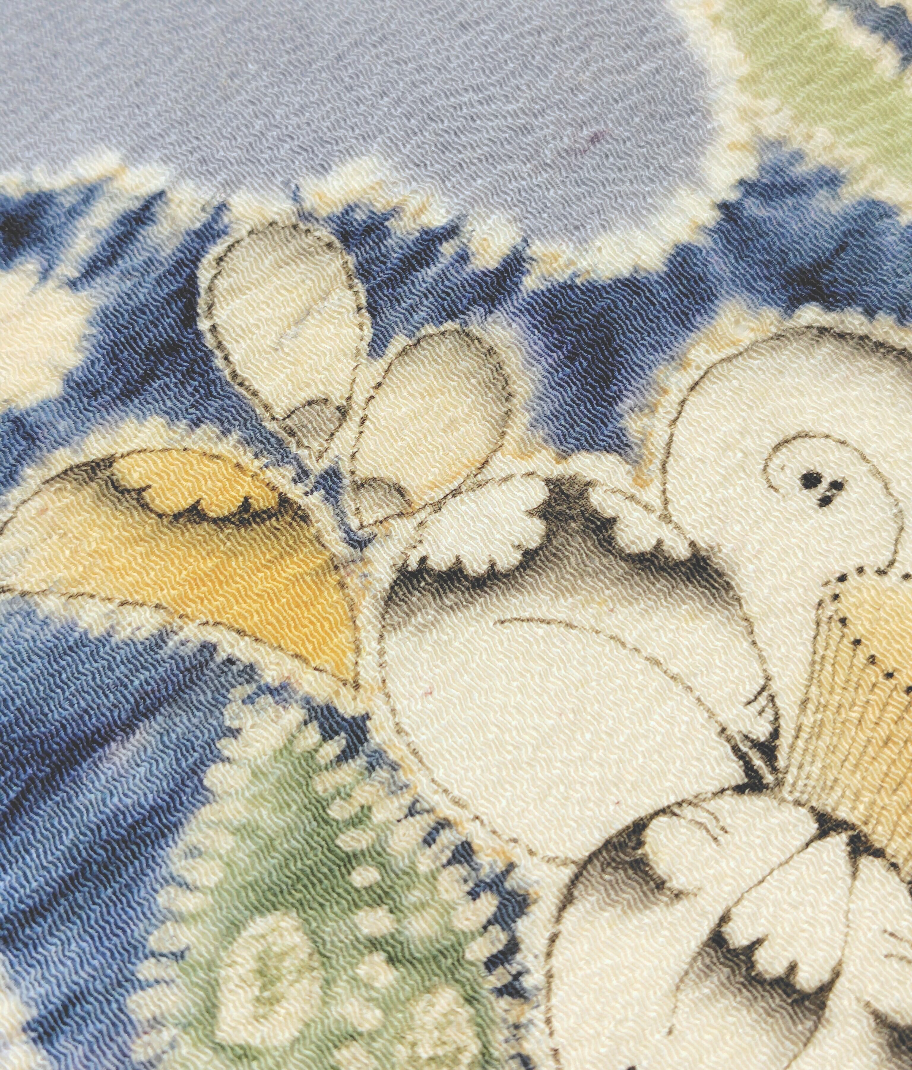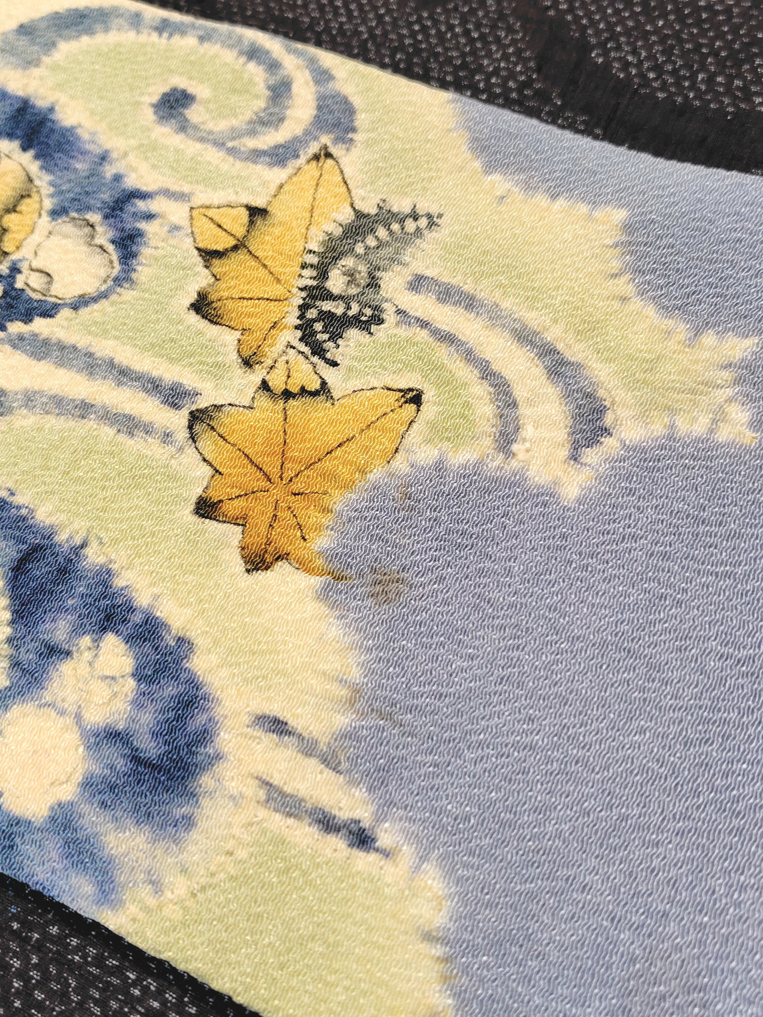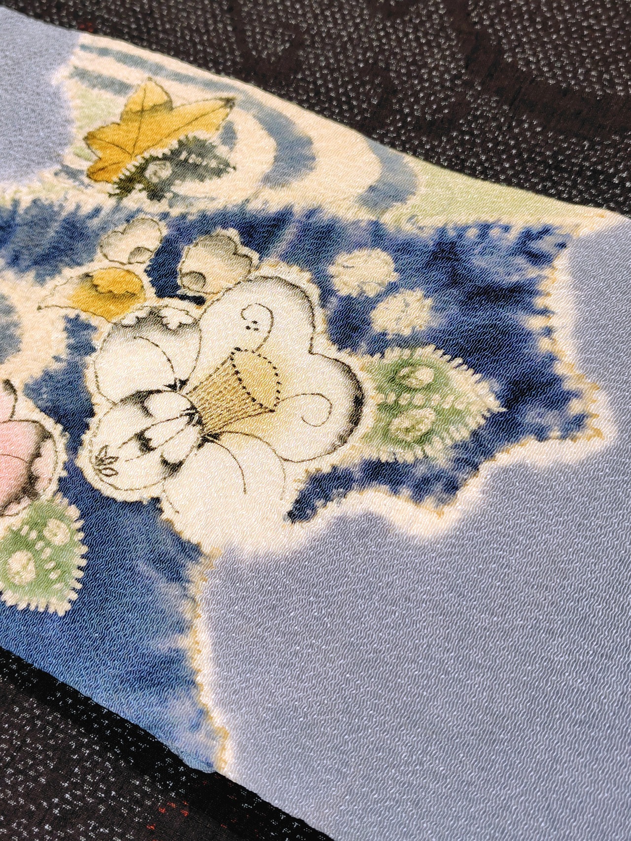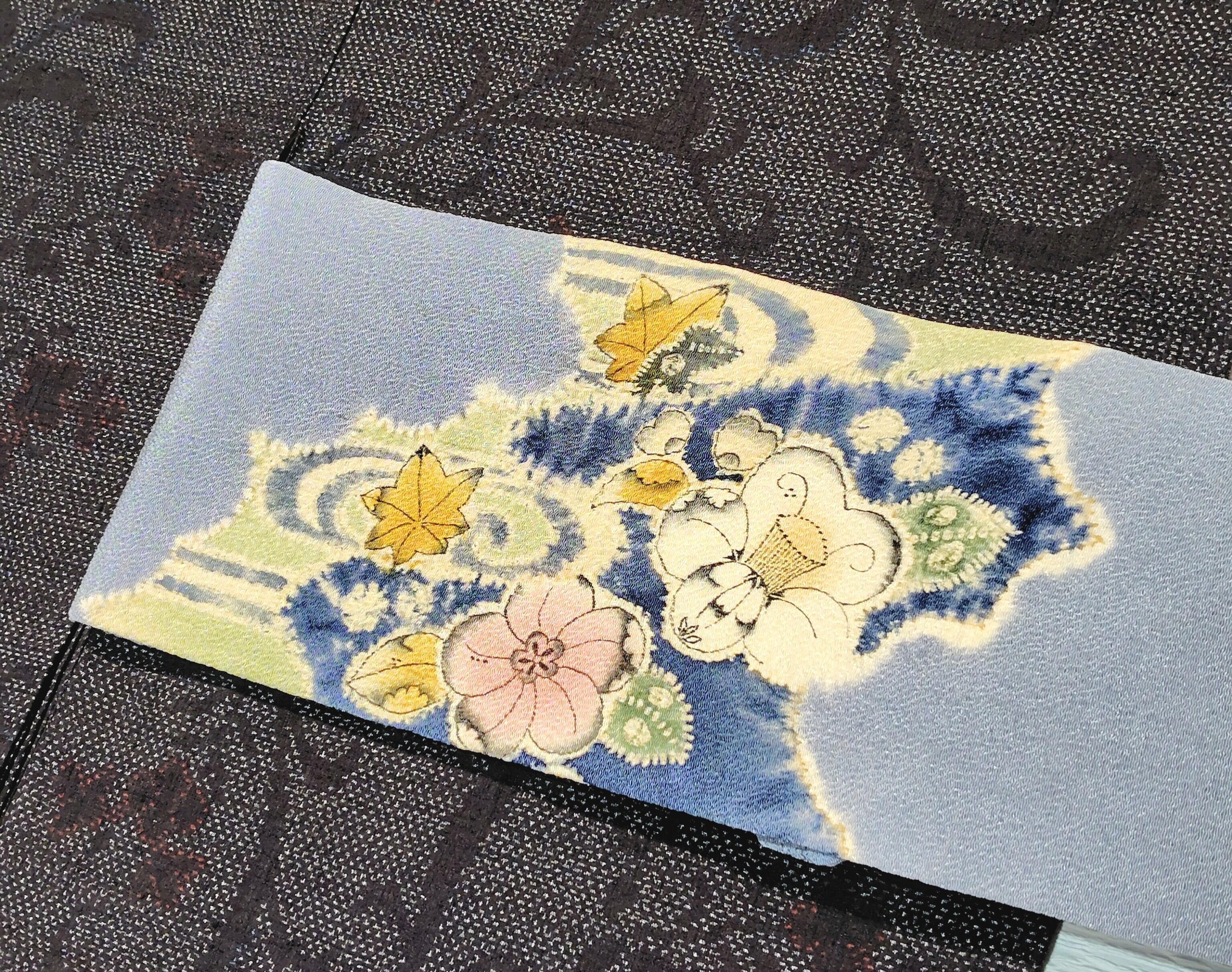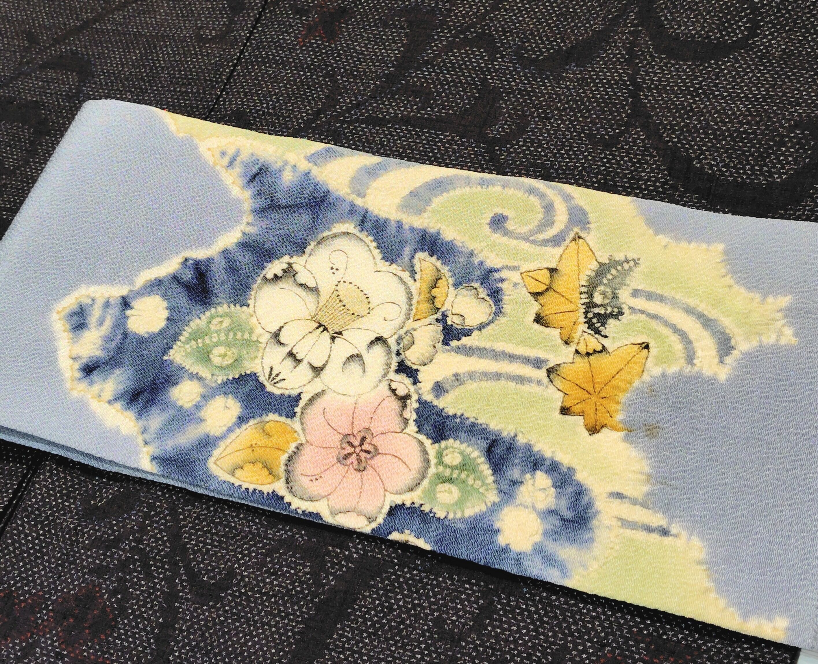 こちらは、しぼがしっかりした柔らかな縮緬地に絞り、墨による手描き、手刺しで色柄を染めている辻ヶ花の技法で作られた名古屋帯です。