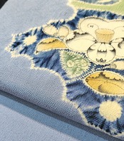 薄く雲がかかったような空のよう淡くくすんだ空色(ブルーグレー系)地に淡く薄い金茶色、淡く薄い緑色、淡い青色、紺色が主色。