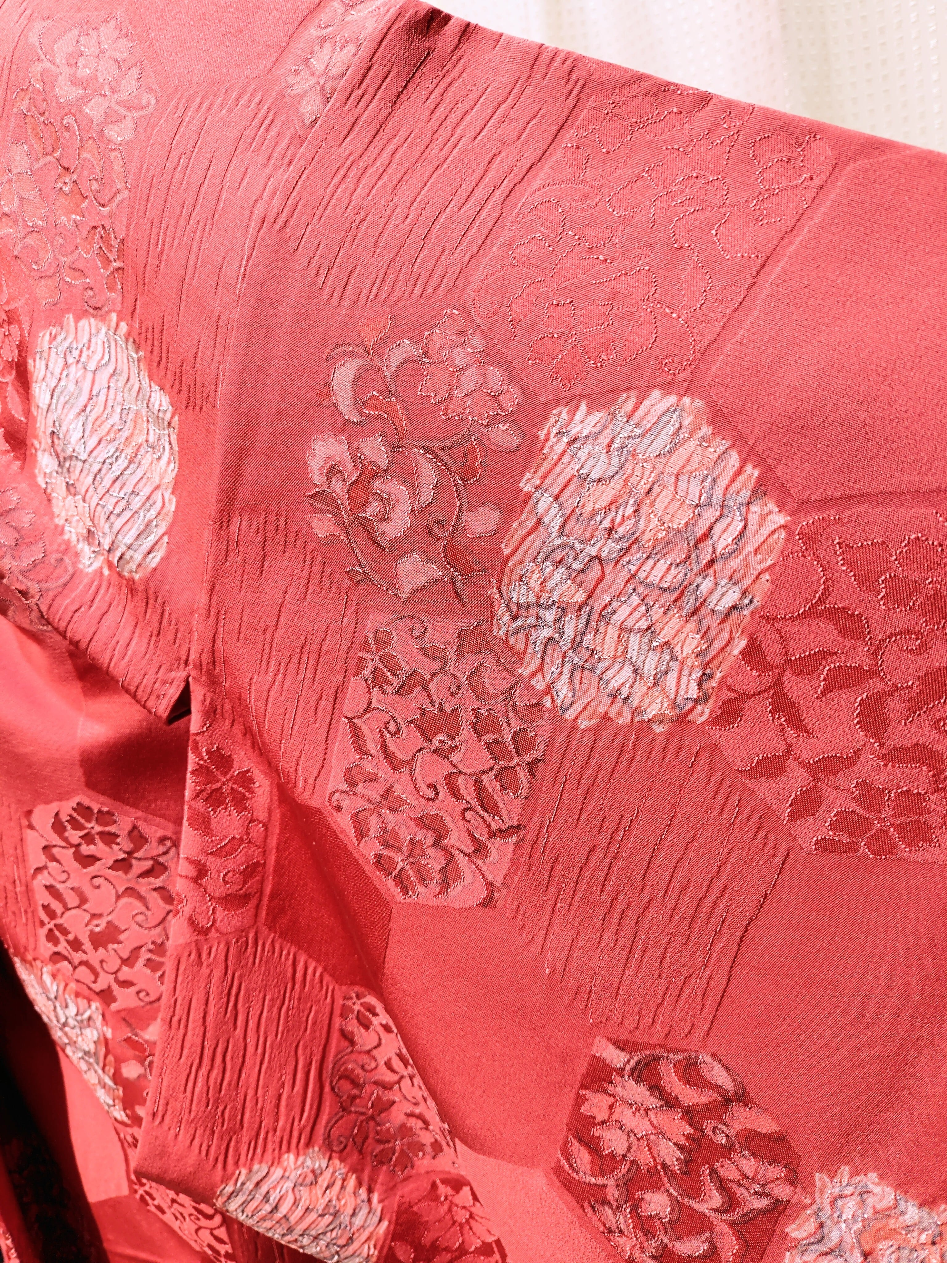 こちらは地紋入りの縮緬地、しぼは少なめ、一部がふくれ織のようになっています。