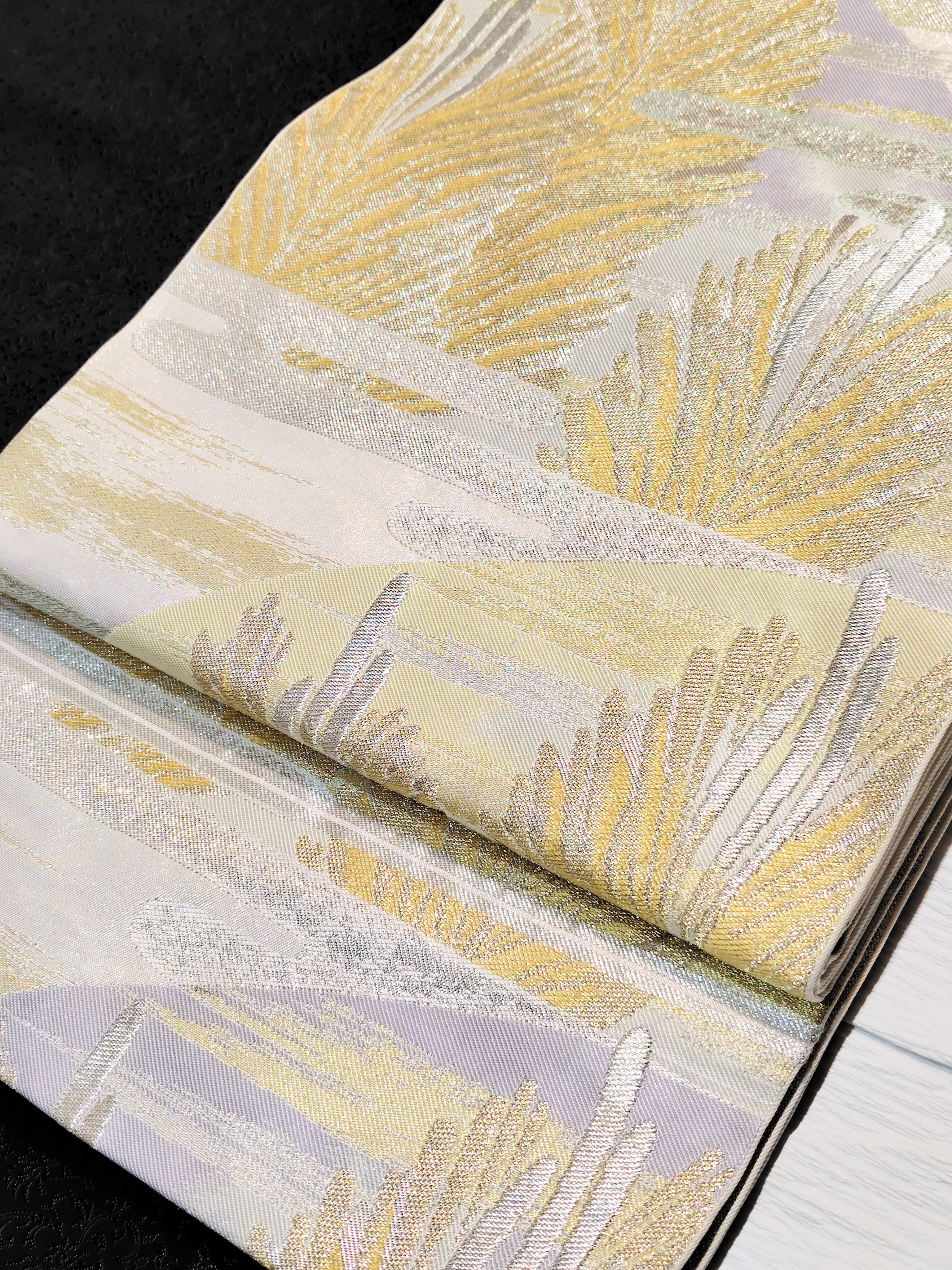 白地に銀糸が織り込んであるため、離れれば白地に淡い色合いと金糸がポイントの袋帯、近づく程に繊細な銀糸がパールのように輝きと艶感を。