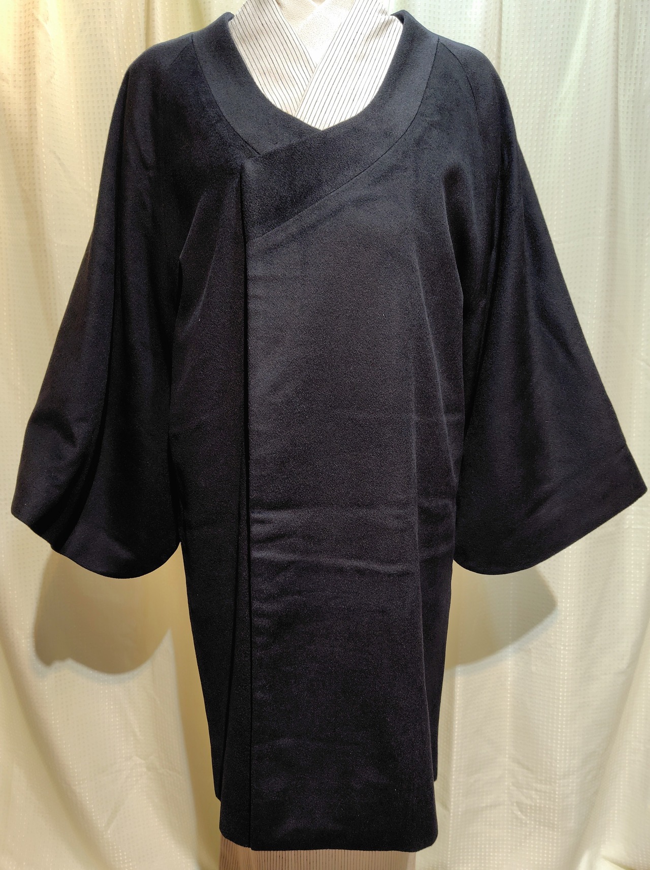 和装向きの防寒コートで、質感はどちらかと言えば薄手ながら、しっかりとした地。