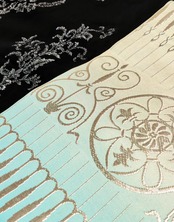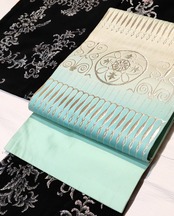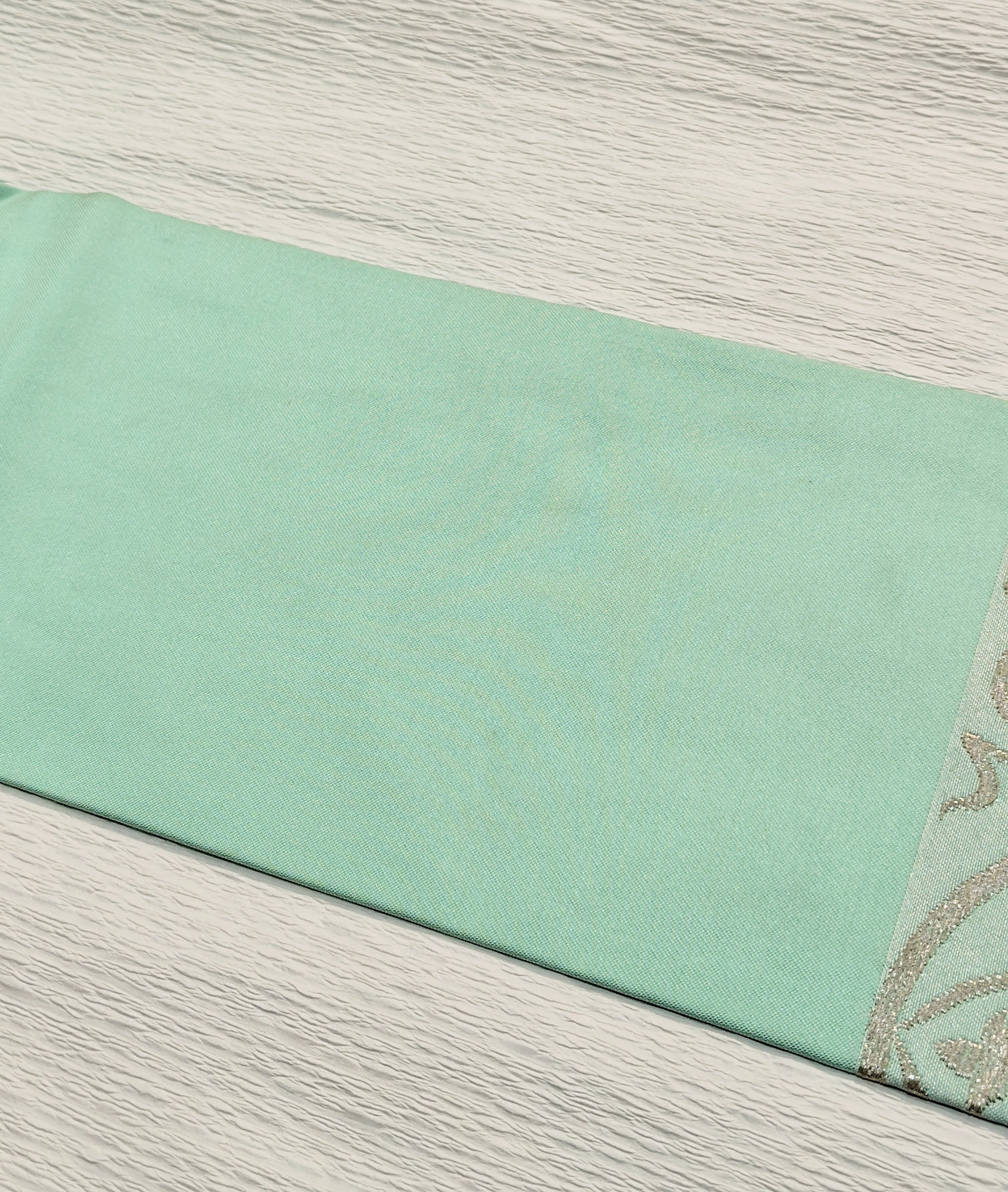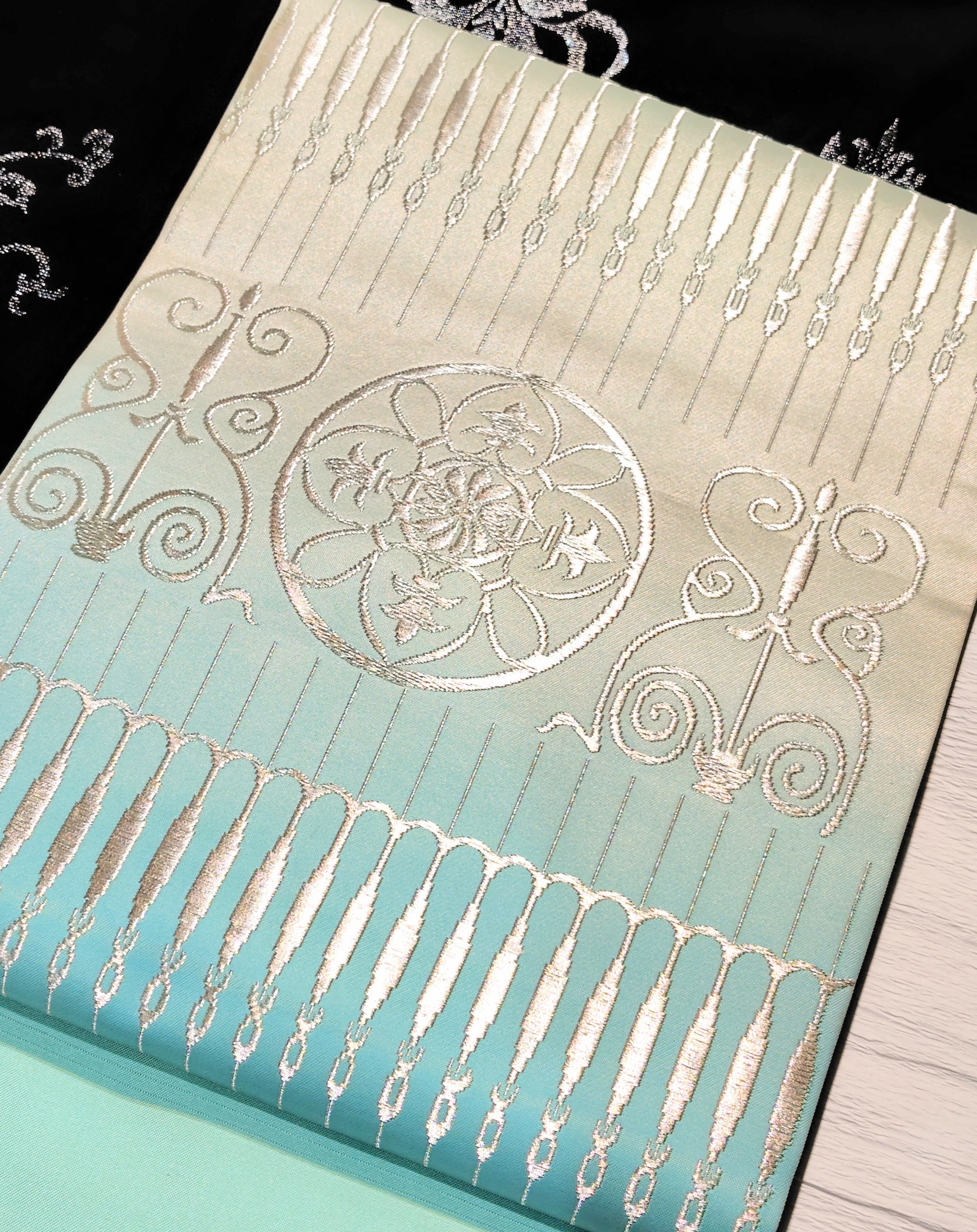 淡いエメラルドグリーン〜淡い青緑のグラデーション地に銀糸の組み合わせは、まるで雪のようでもあり白銀を思わせる幻想的な色合いです。