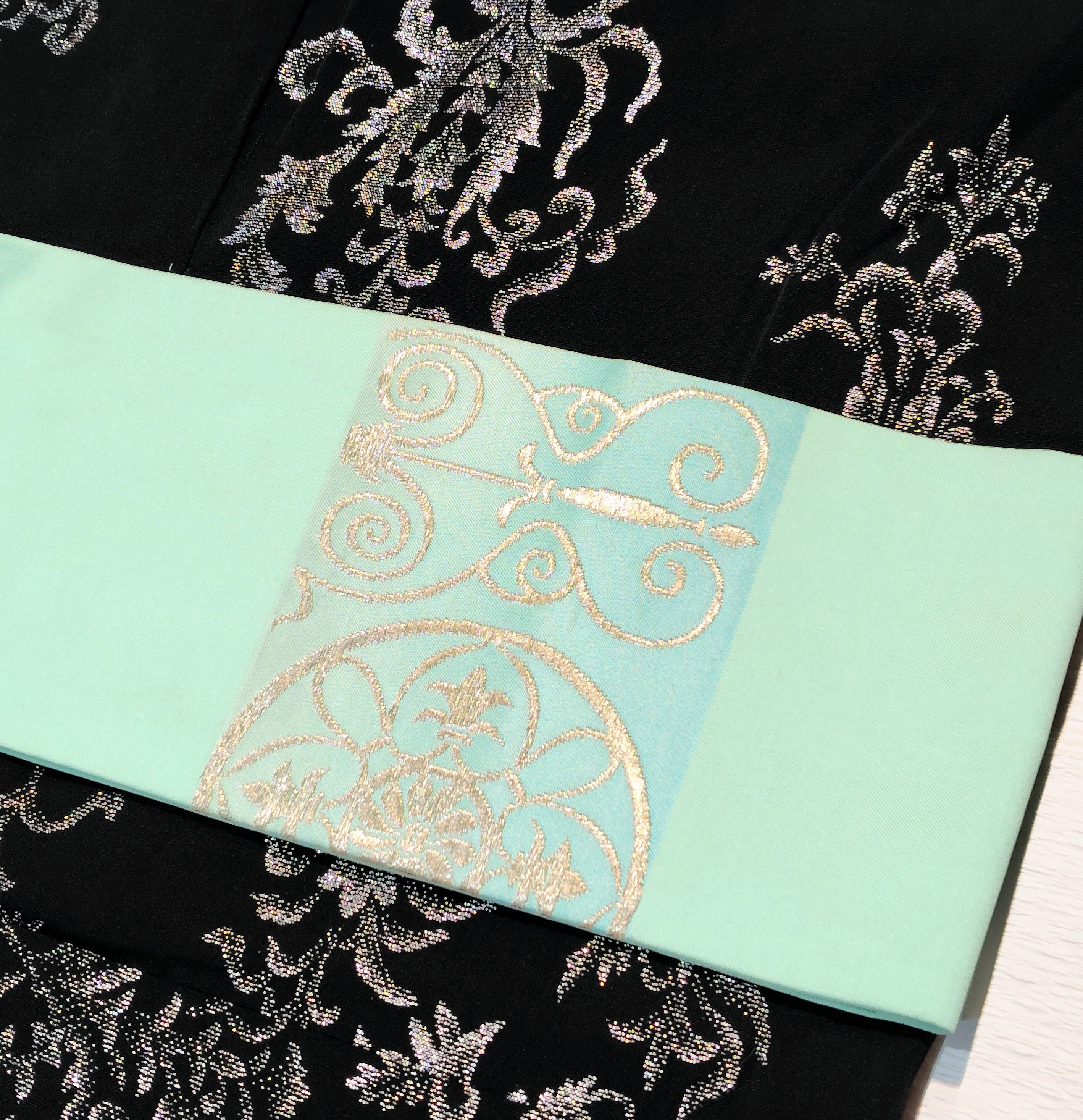 淡いエメラルドグリーンに銀糸の西洋モチーフ柄の名古屋帯です。