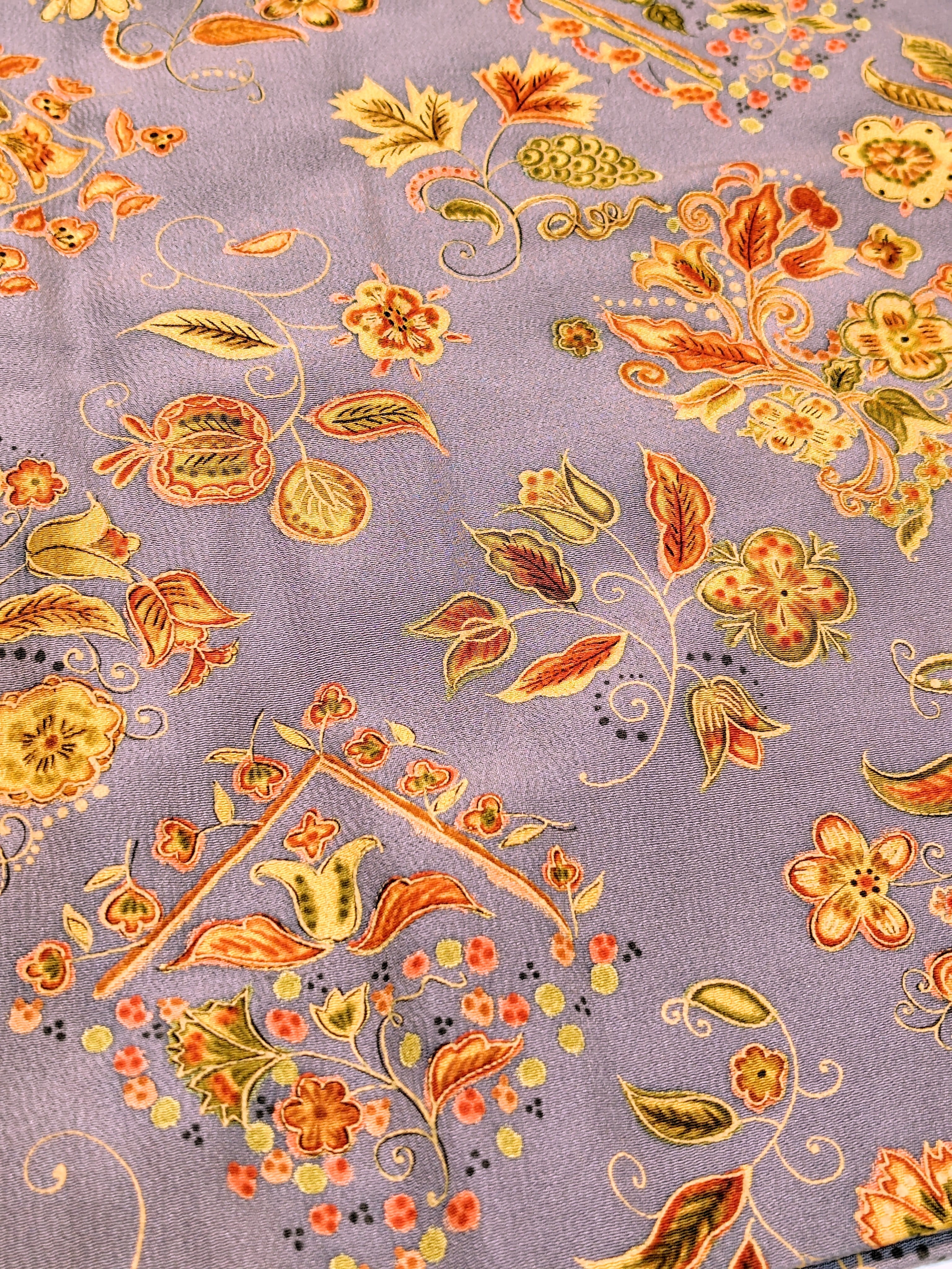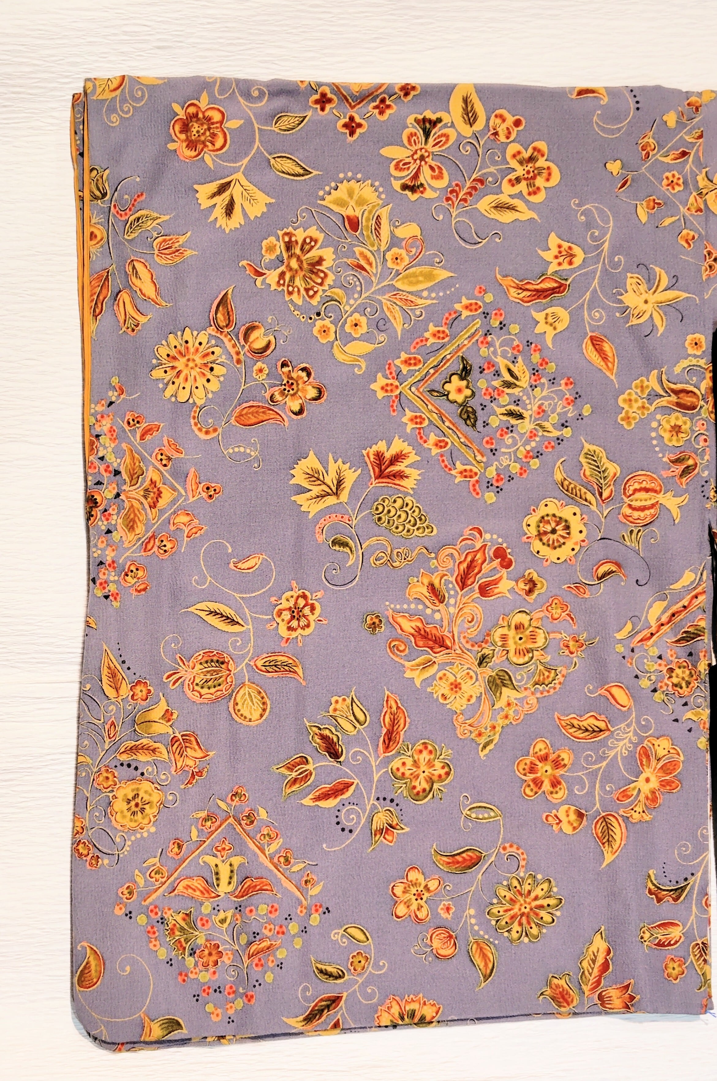 青紫色を薄く少しくすませたような、もしくは淡くくすんだブルーグレー色に近いお色の地に、淡い金茶色、茶色、深い緑色、淡いピンク色の組み合わせがシックで美しくボタニカルな印象の小紋です。