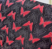 黒地にラズベリーソースのようなピンク色を感じる赤色、白色のドットで象られた蝶々が幻想的かつ個性的。