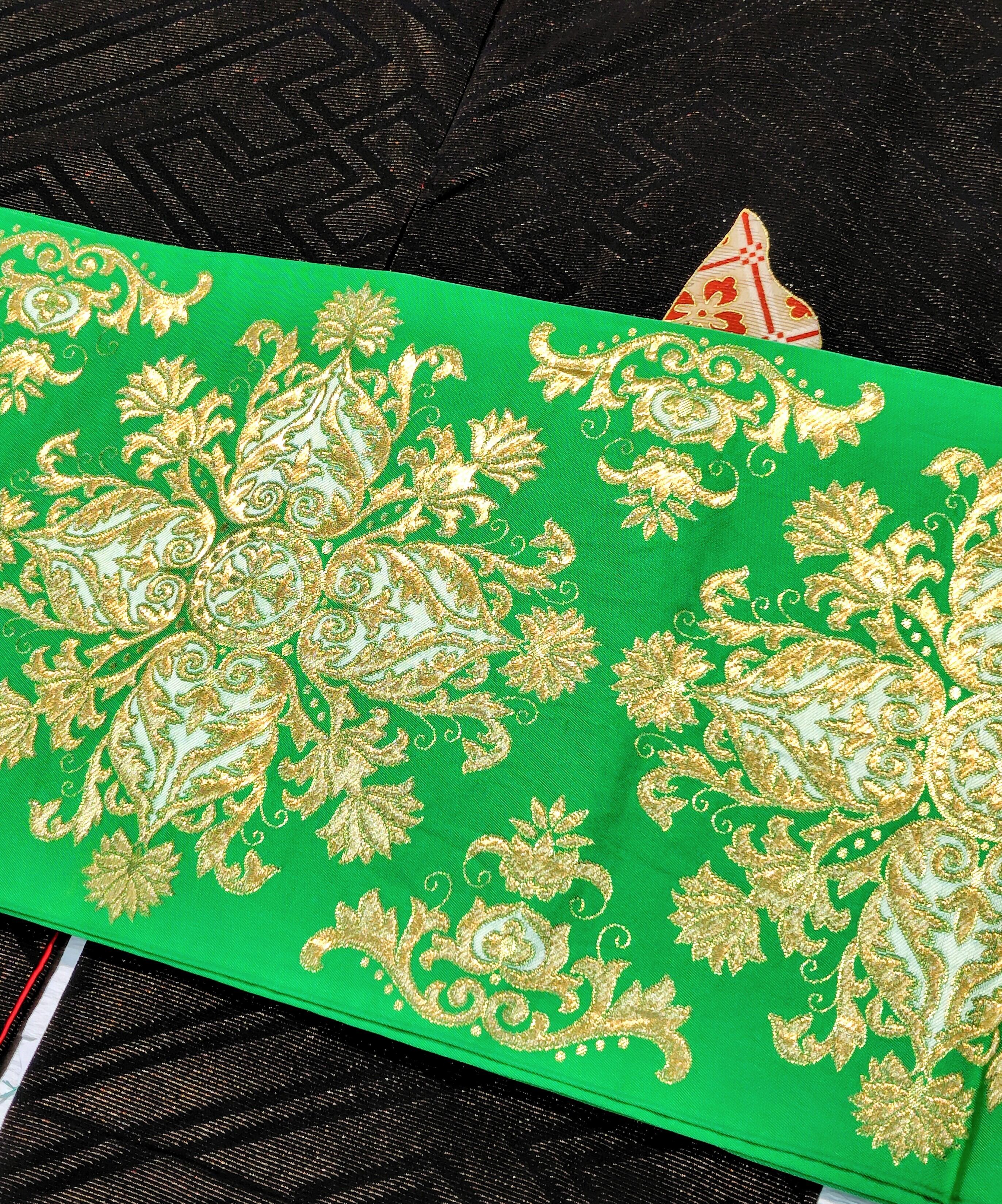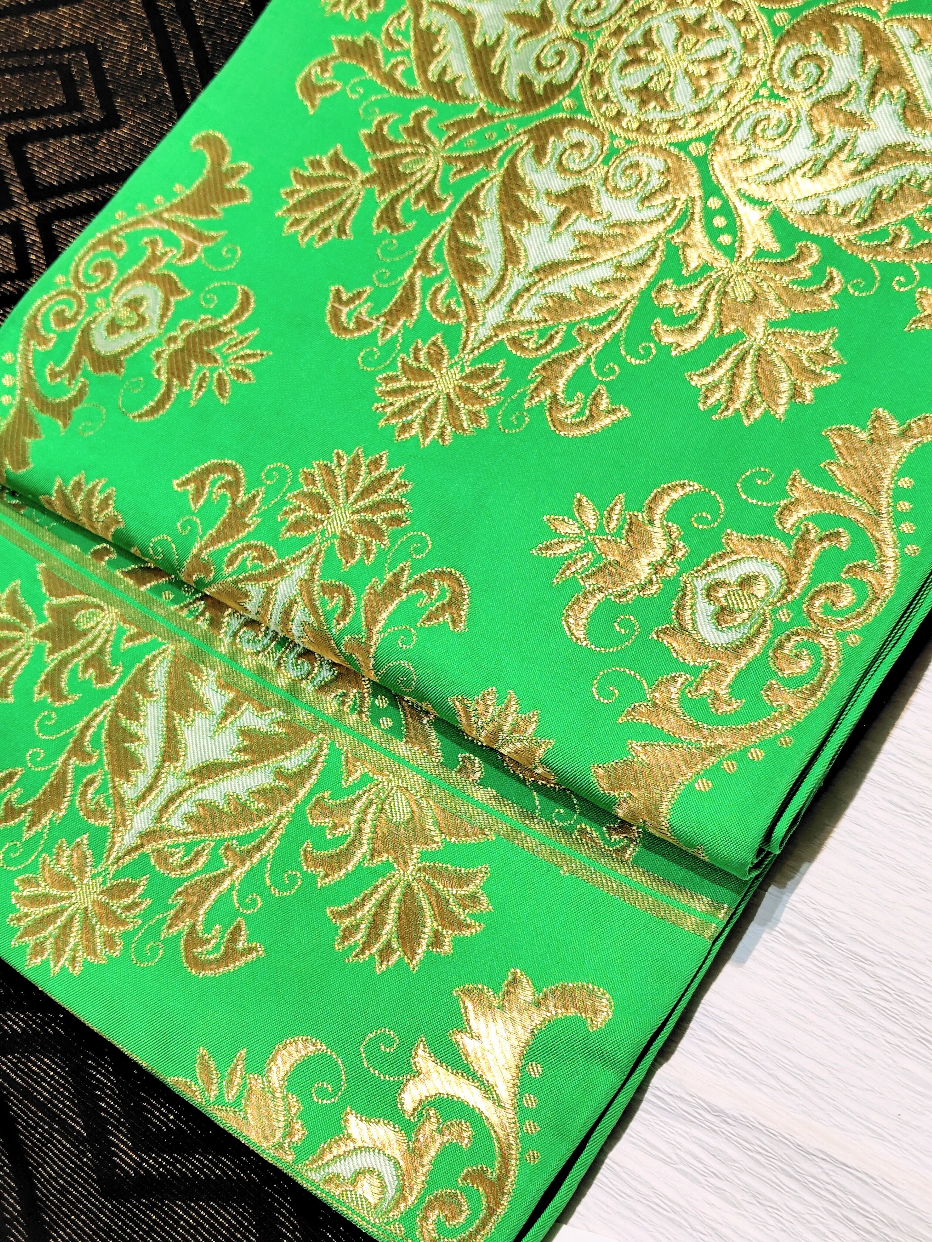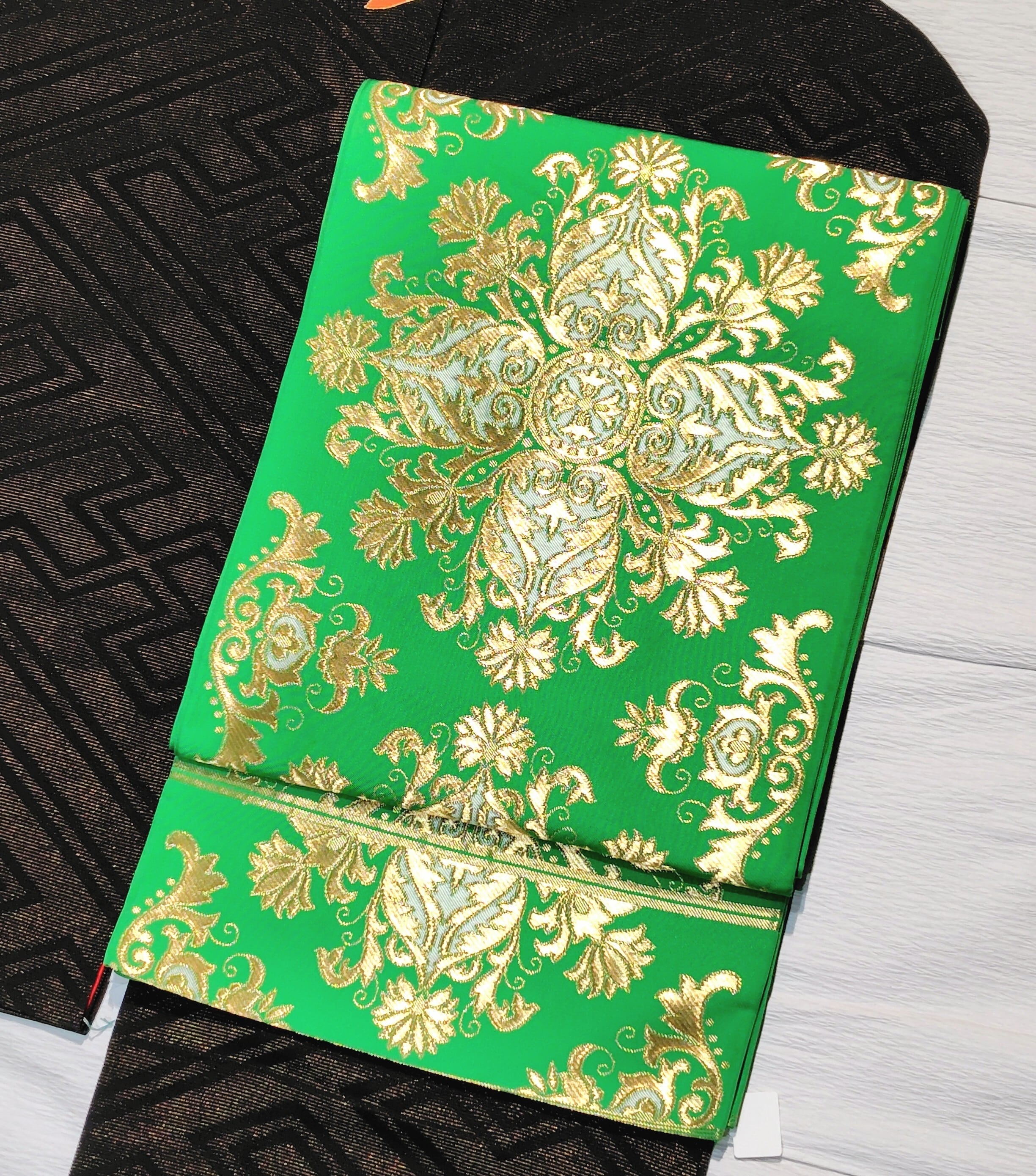 はっきりとした発色の緑色ですので、コーディネートの締め色&合わせやすく万能で素敵な帯です。