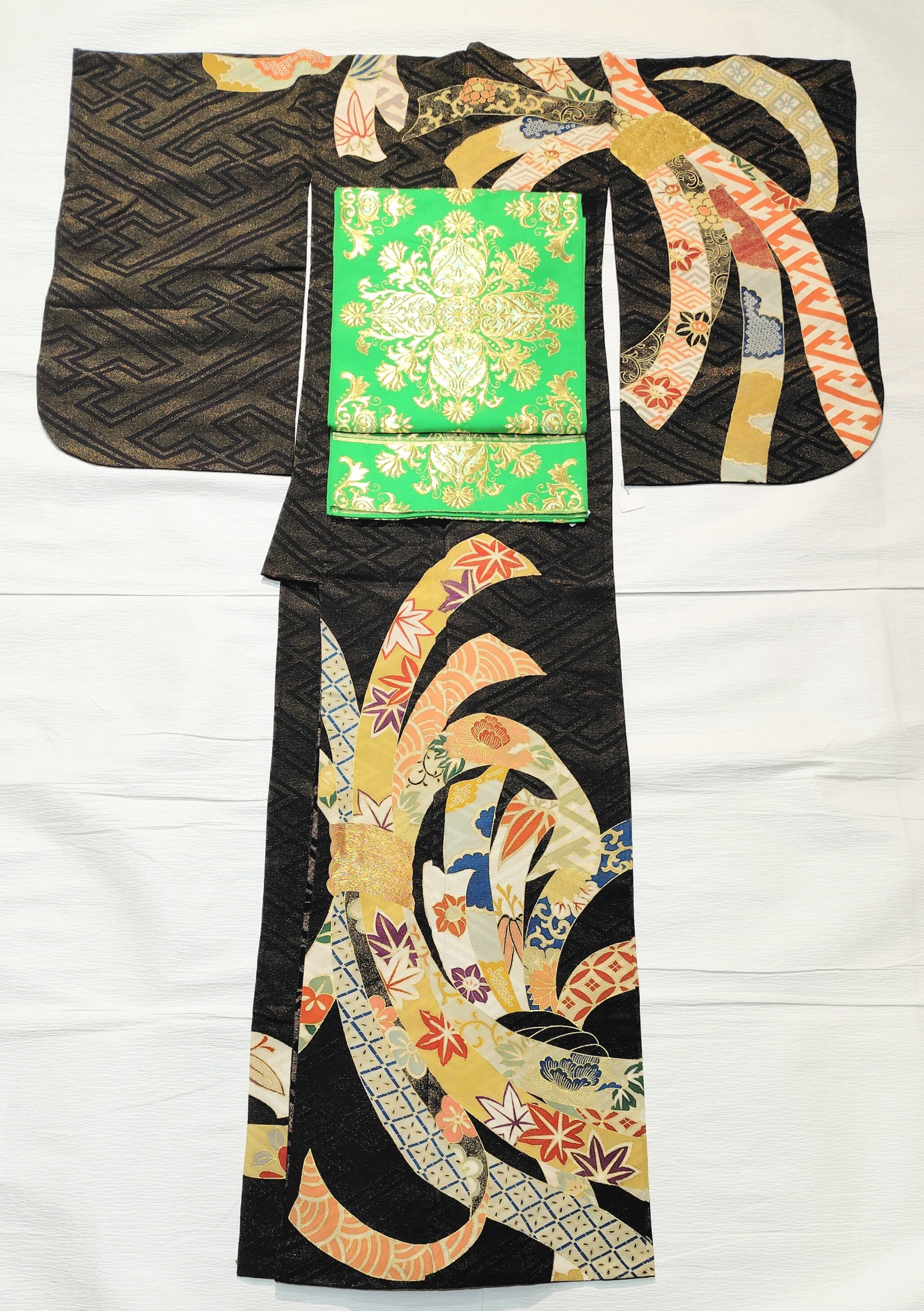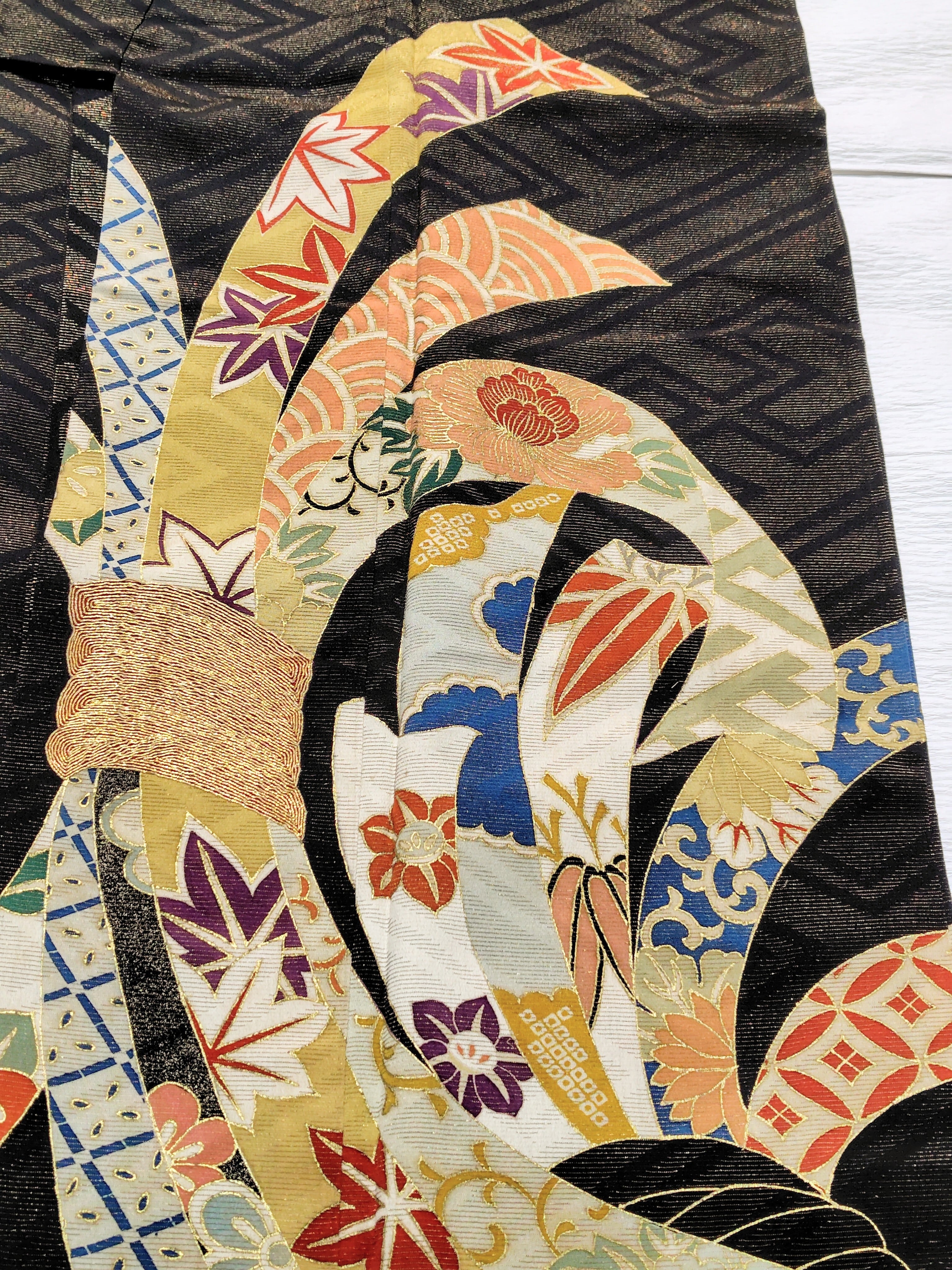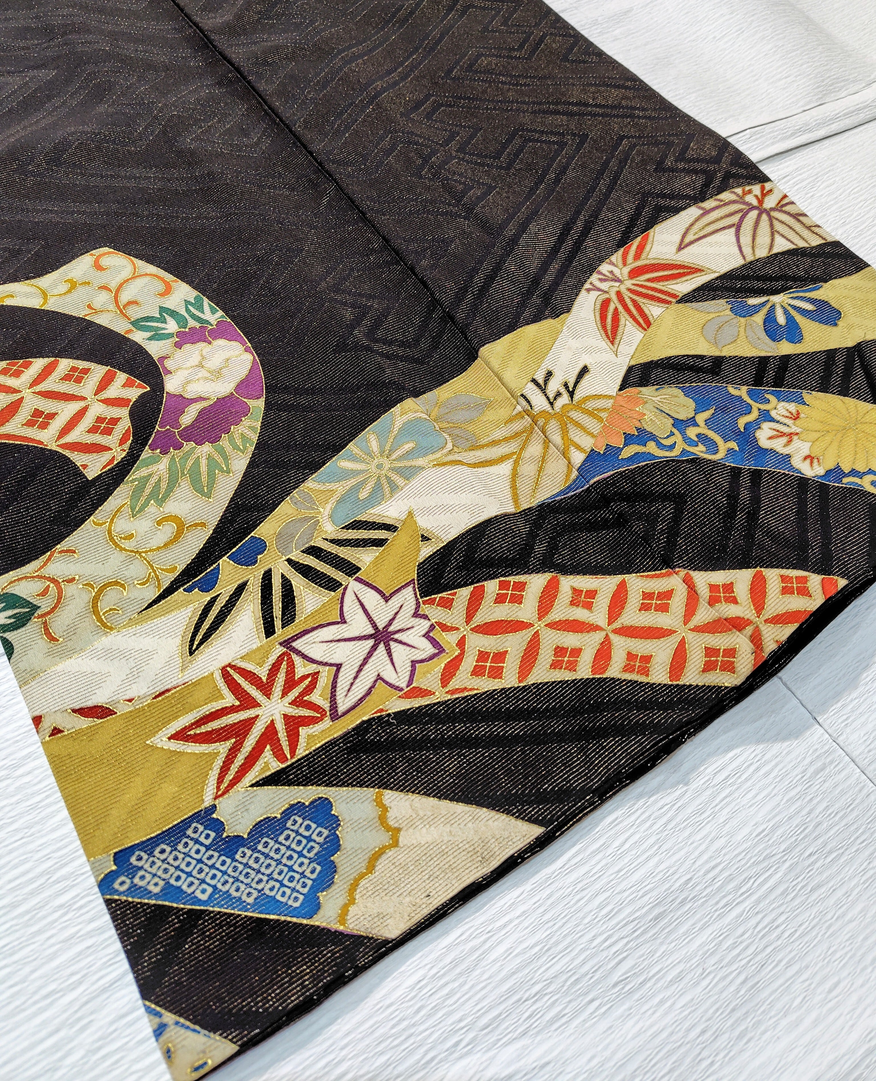 当店では黒地のアンティーク着物は大胆な大きさの柄や上品でお洒落なお色の組み合わせが素敵で可愛いと大人気です。