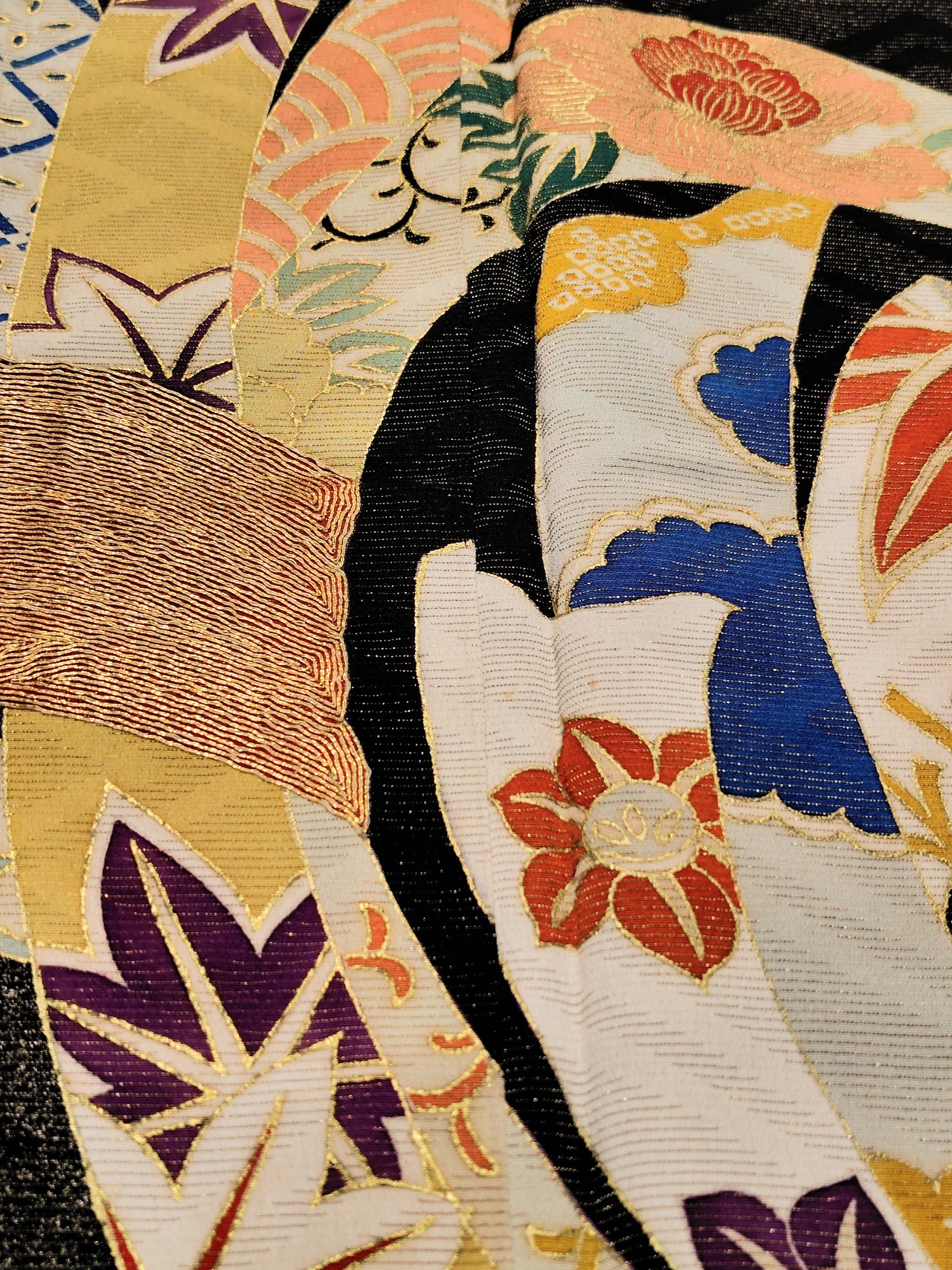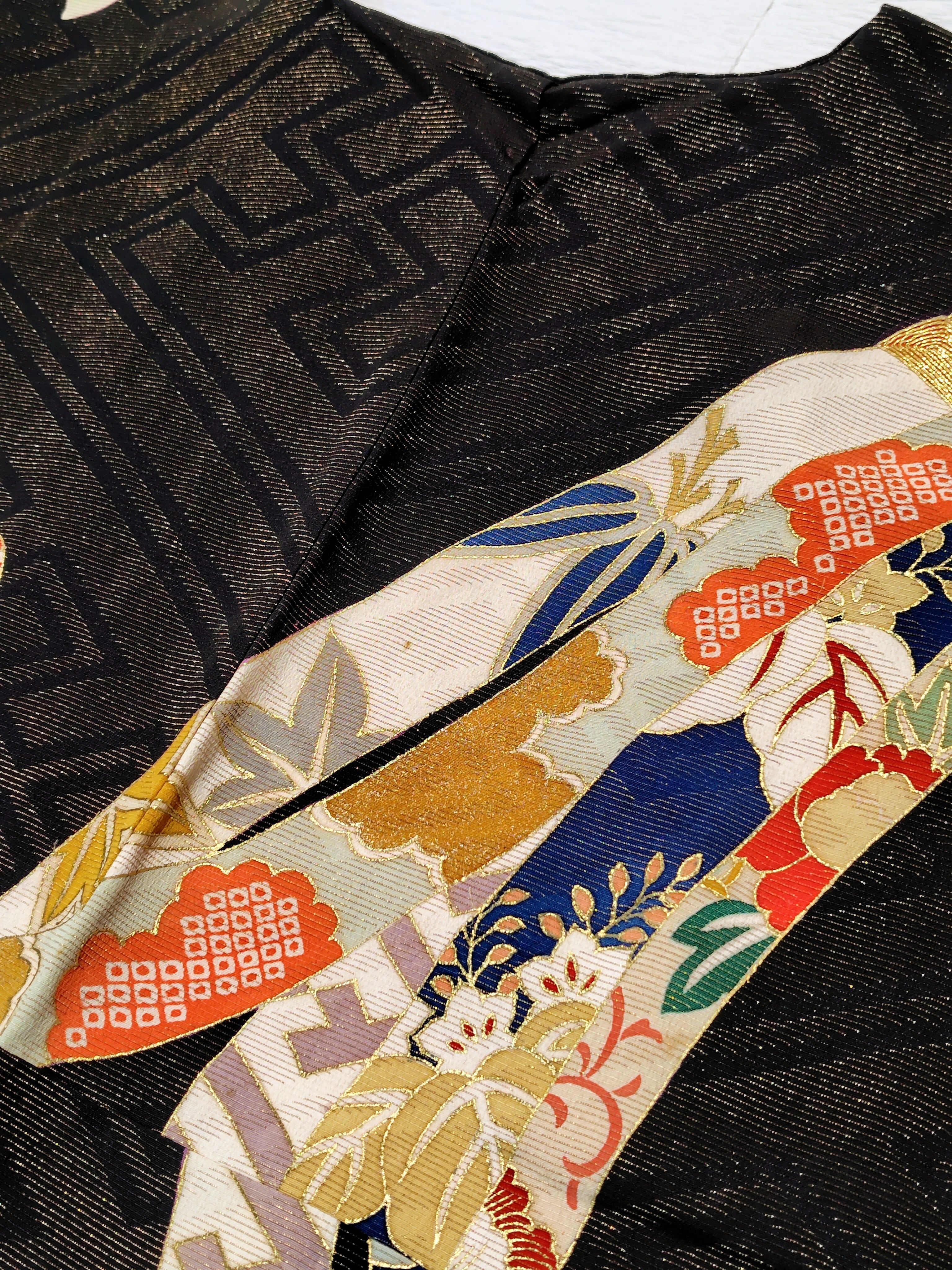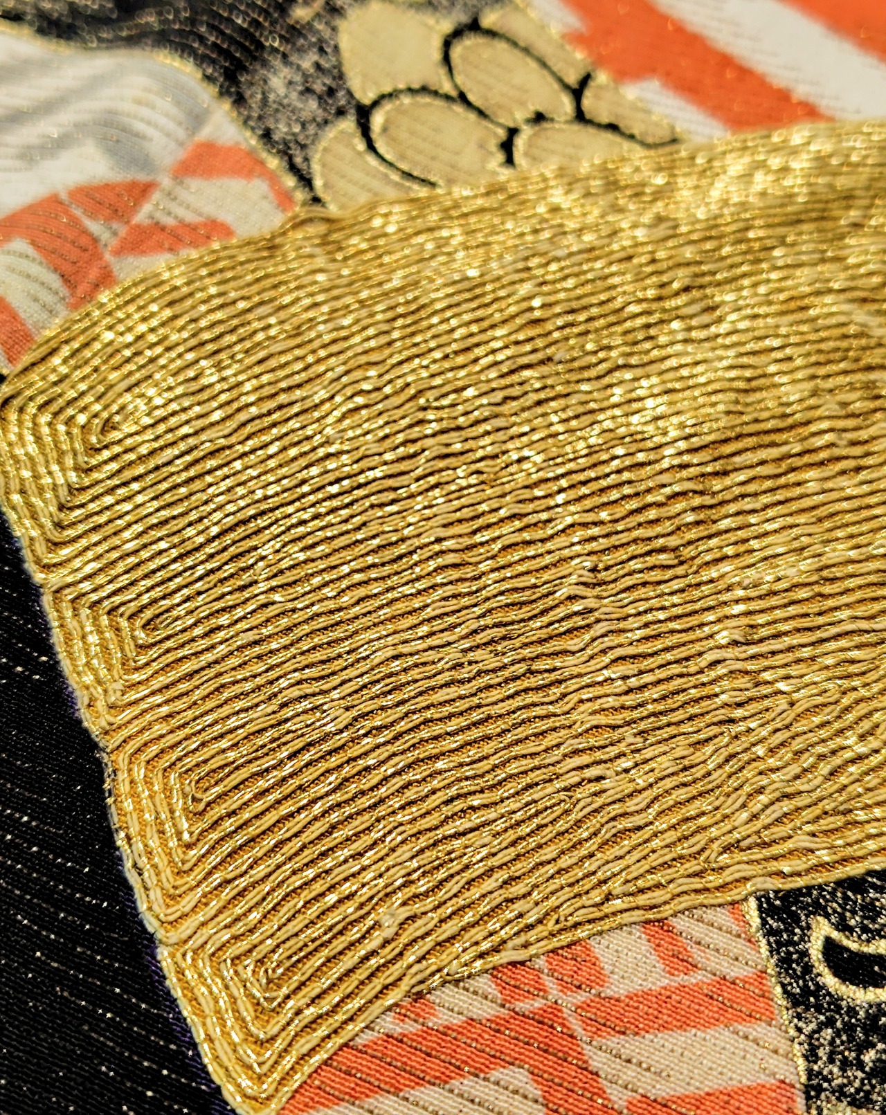 金通し(金駒刺繍のような金糸が生地に織り込んであるイメージです)黒地ですが光に当たると宝石のように煌めき、光沢感が楽しめます。