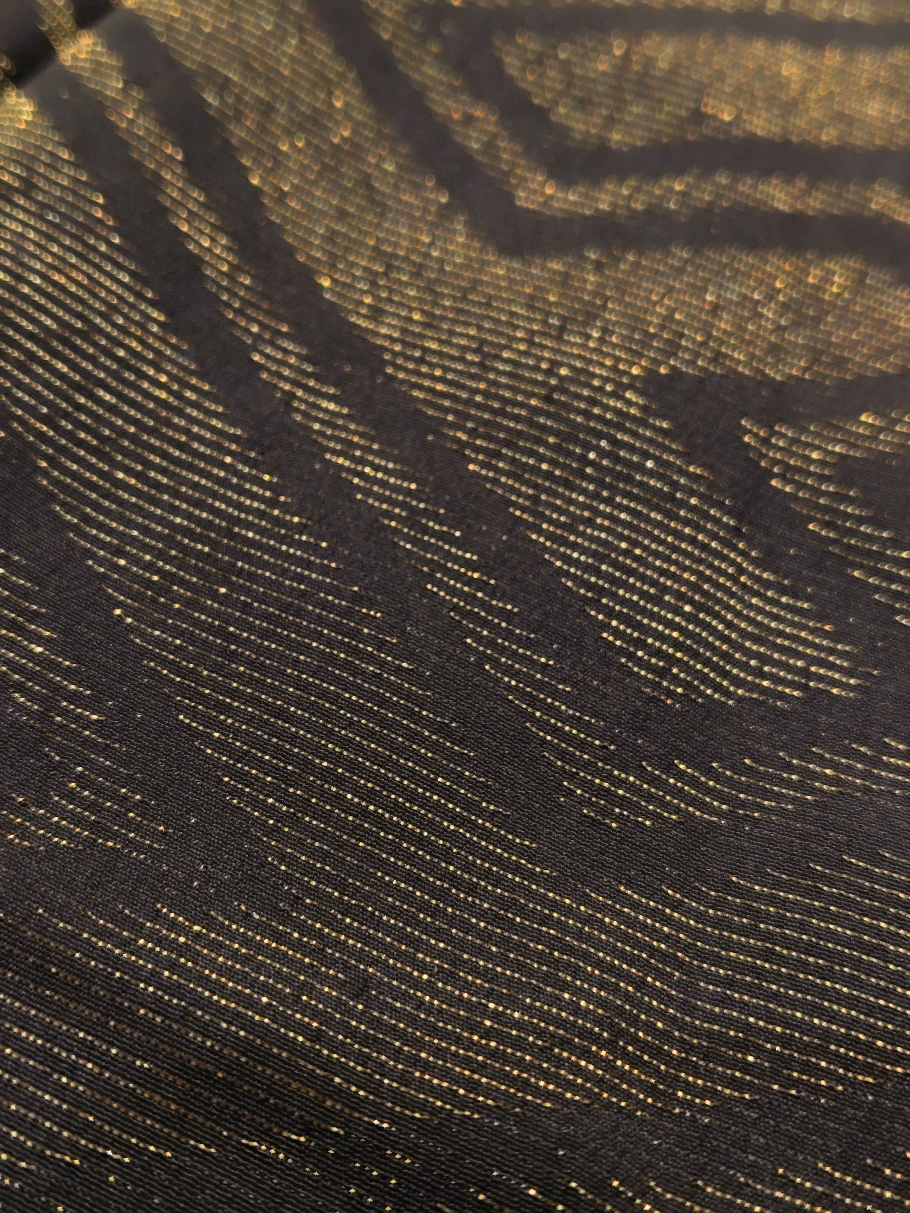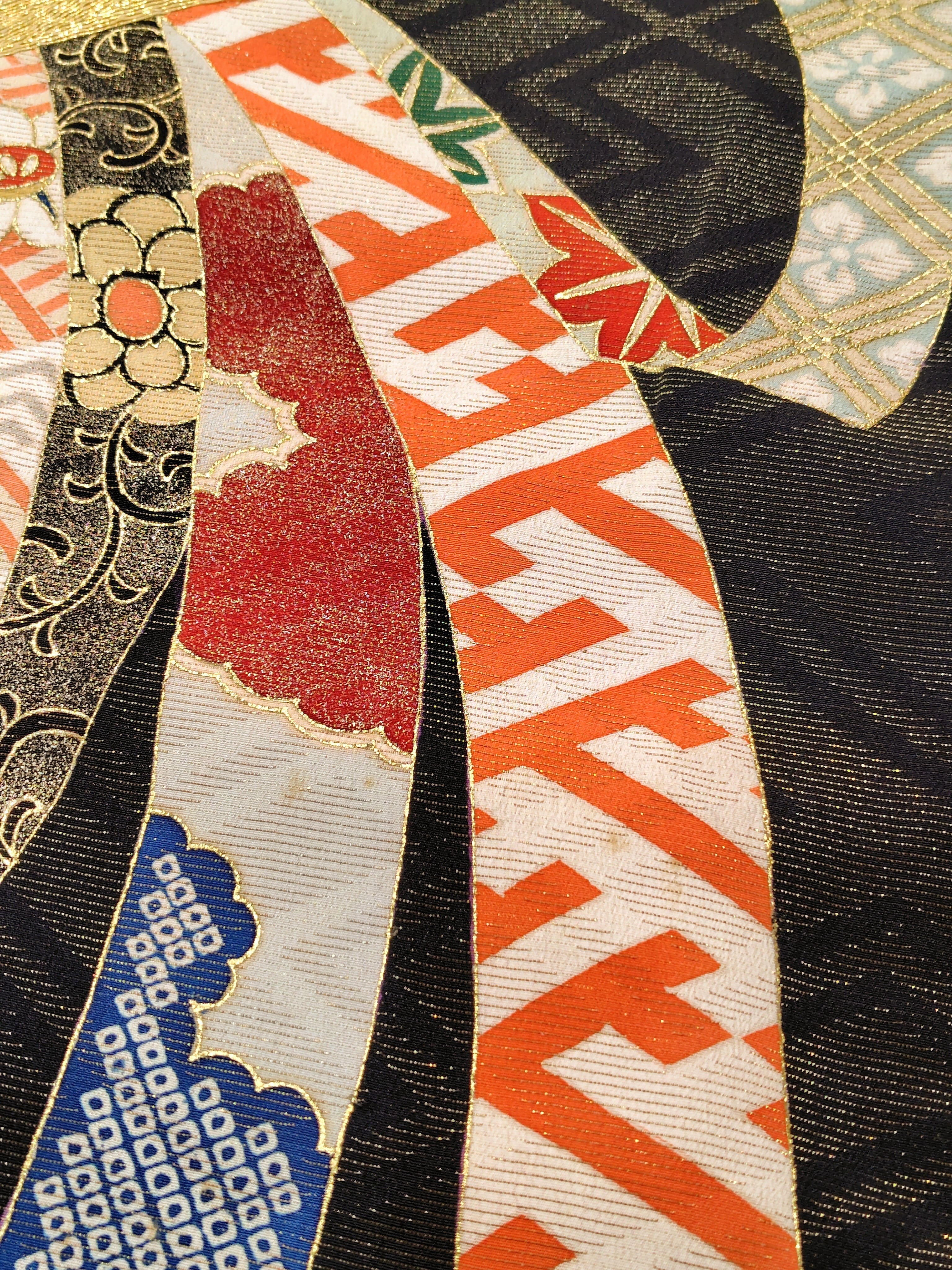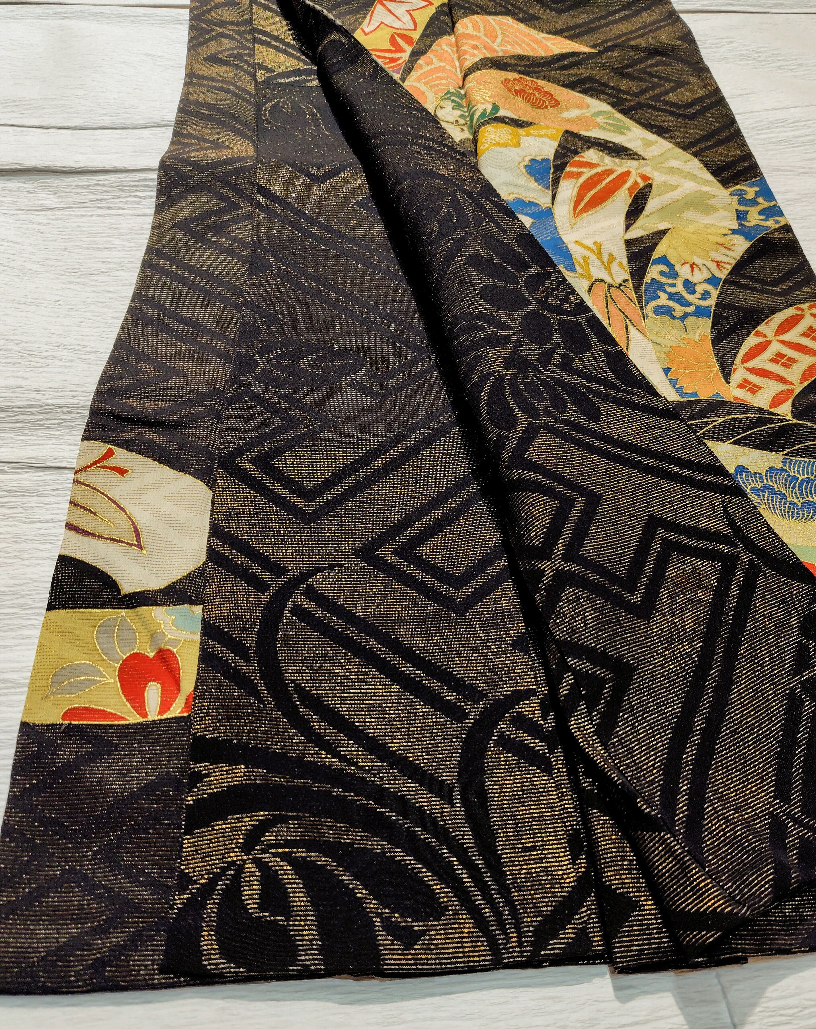 金通し(金駒刺繍のような金糸が生地に織り込んであるイメージです)黒地ですが光に当たると宝石のように煌めき、光沢感が楽しめます。