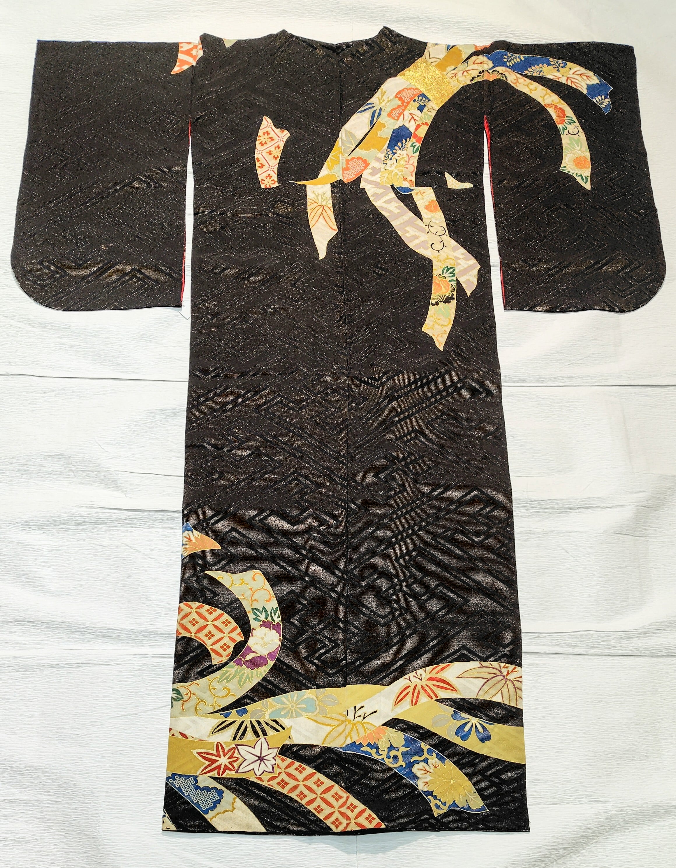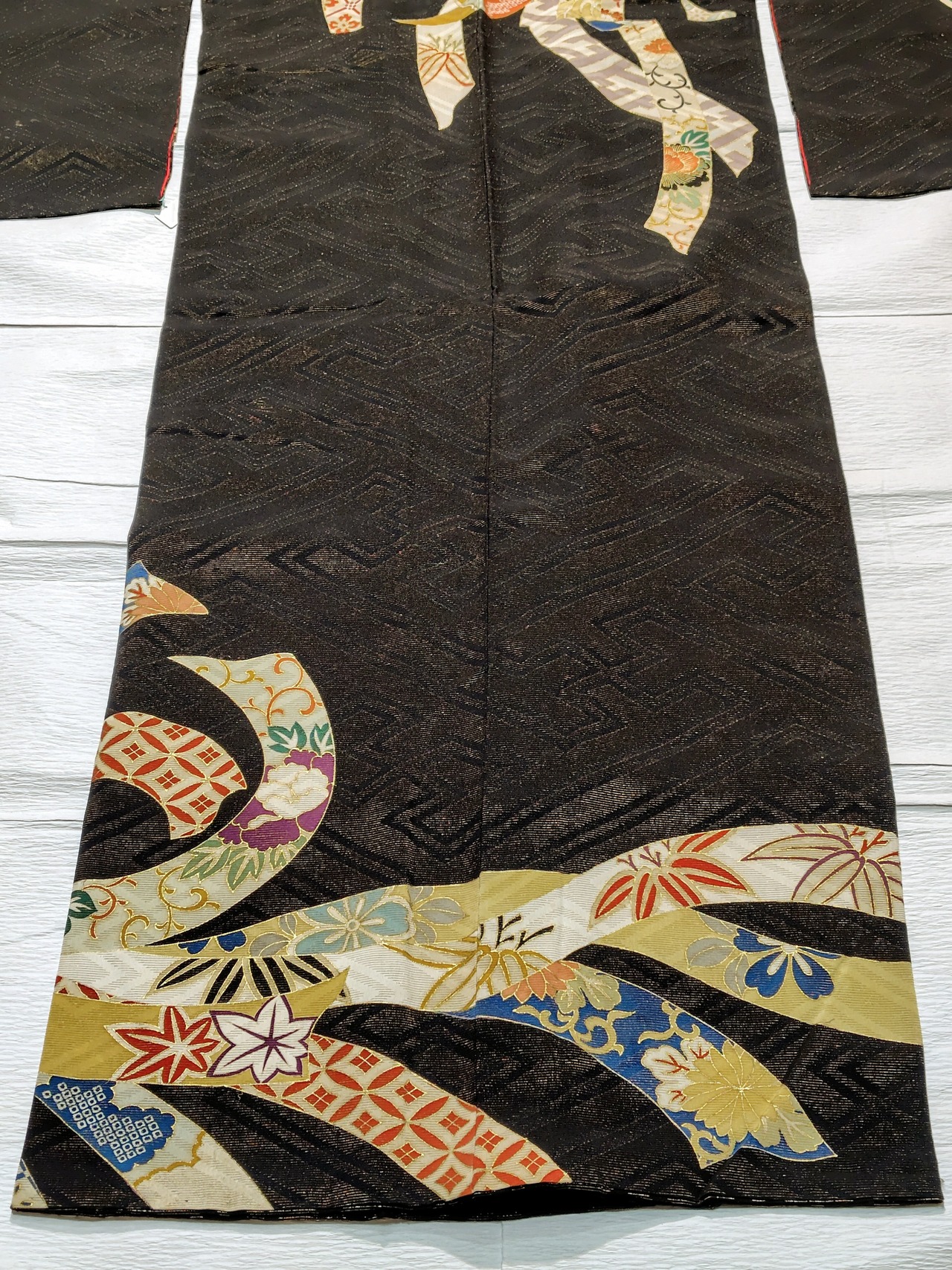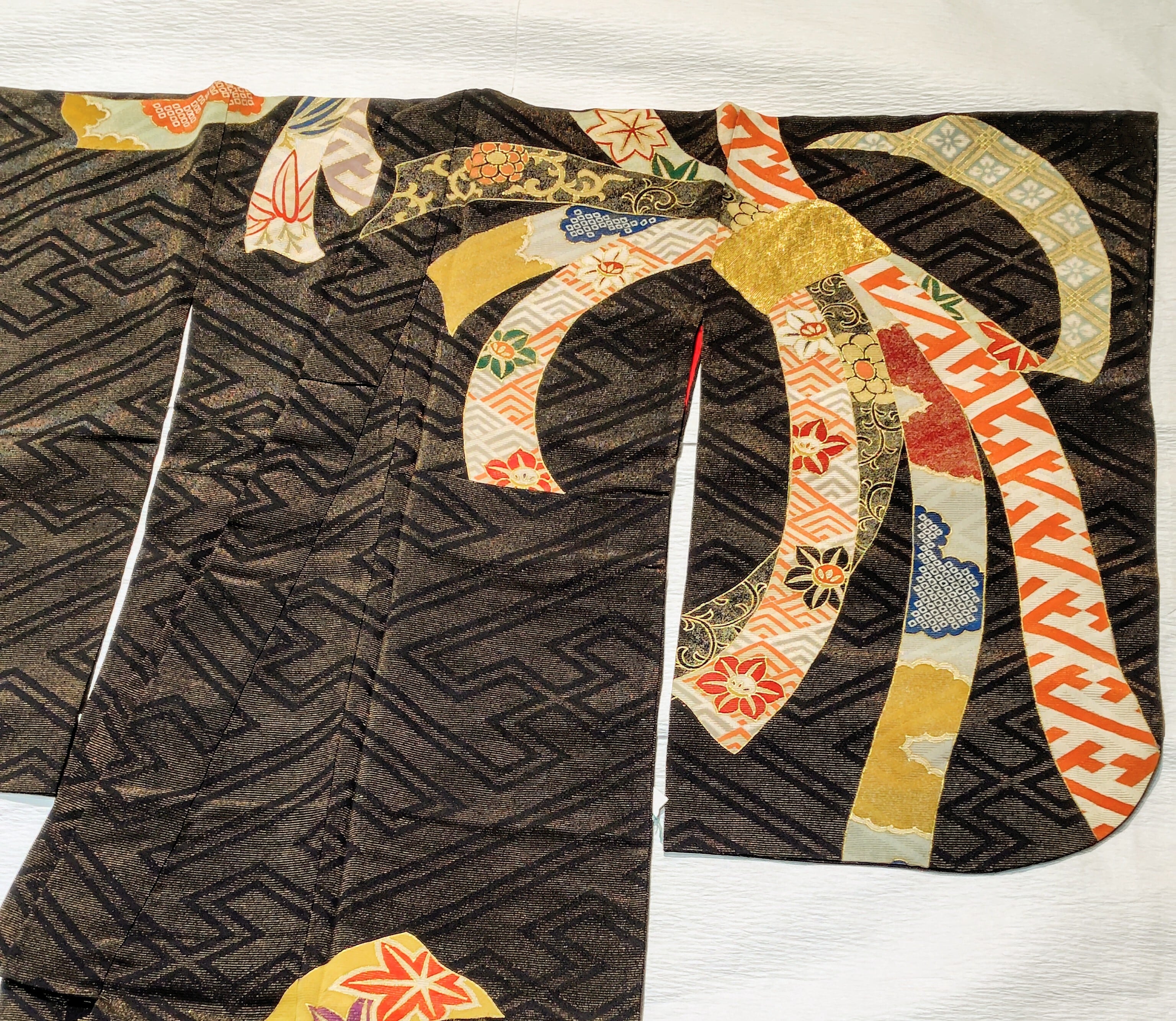 アンティーク 黒地に金糸 豪華な熨斗目柄です。